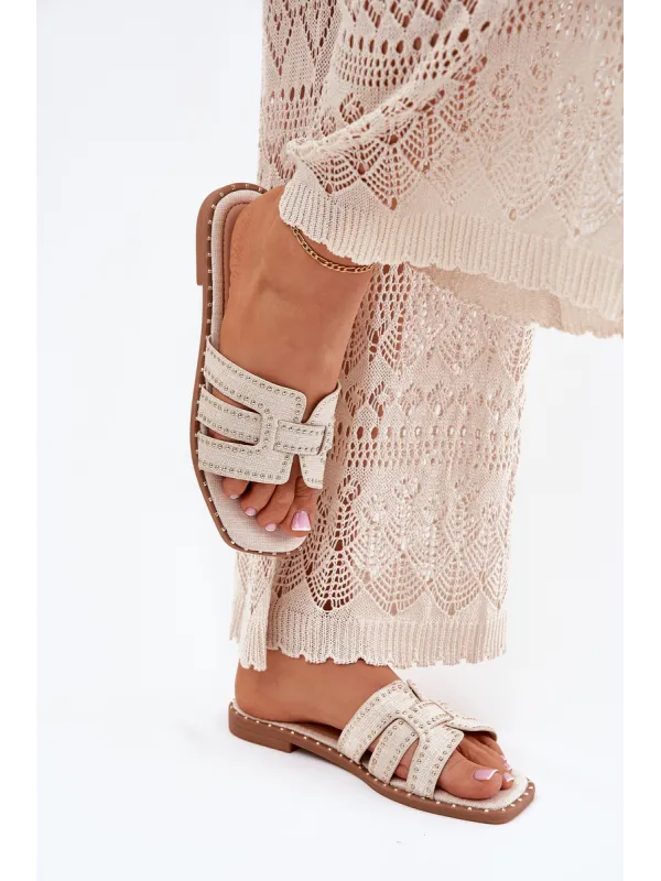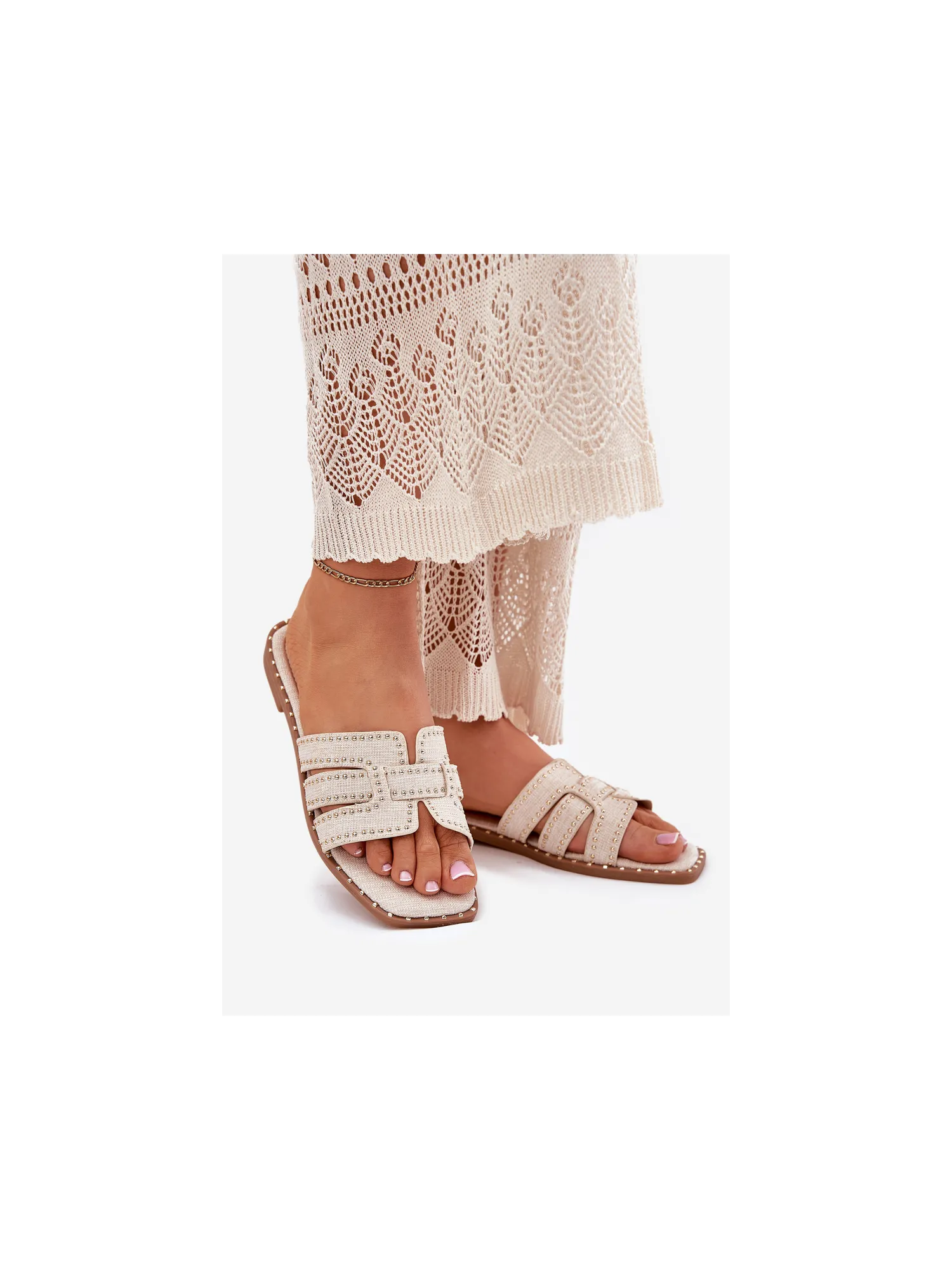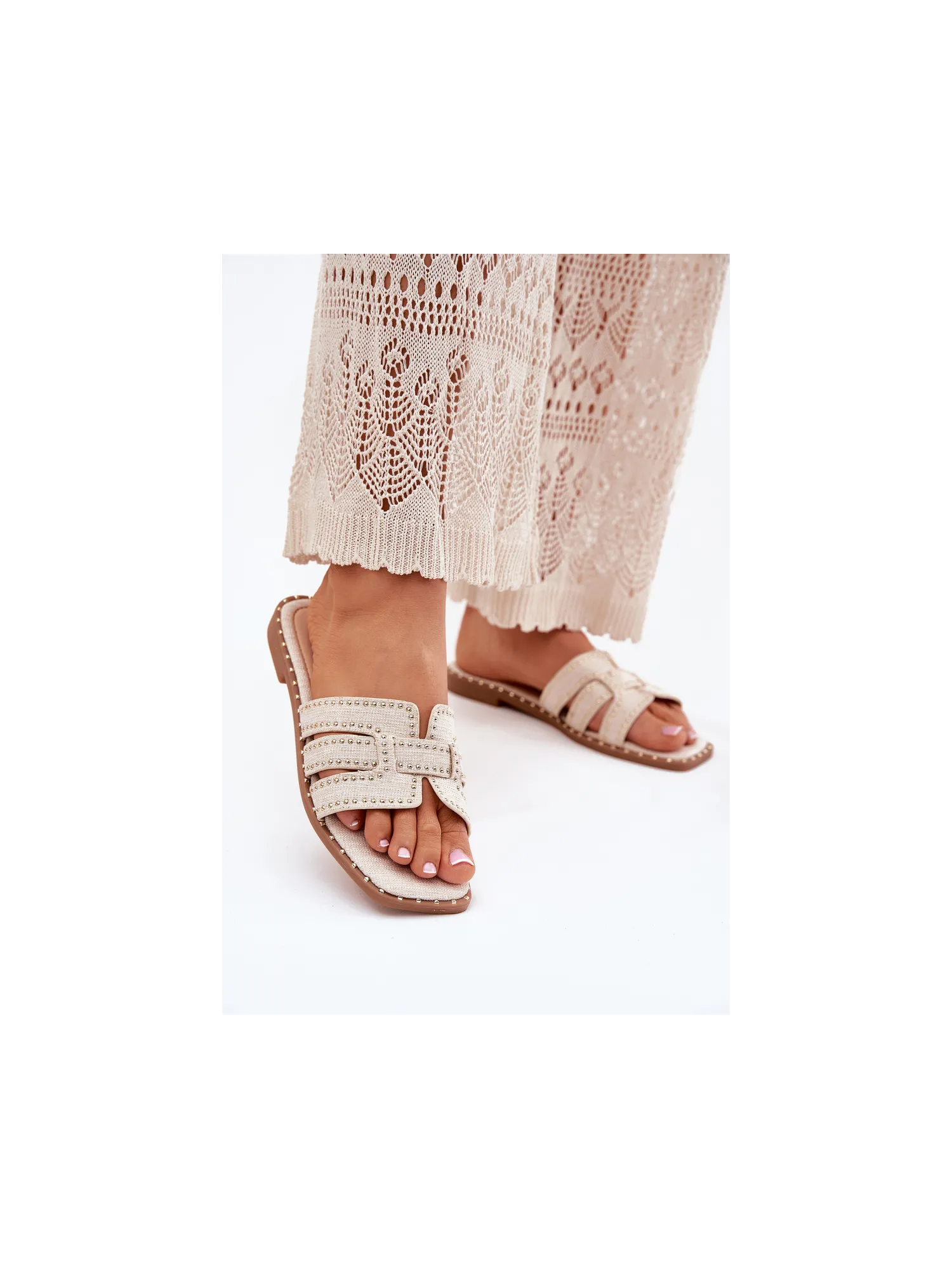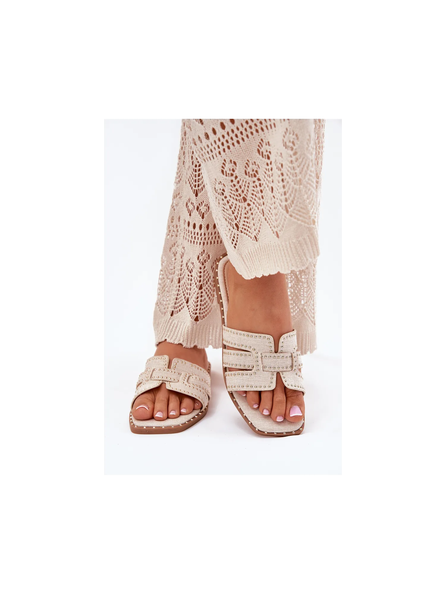 Decorated women's sandals made from textile material are an elegant and comfortable option for warm days. Set on a flat heel, they provide comfort all day long. Subtle decorations catch the eye, adding a unique character to the shoes. Perfect for everyday styles, they combine functionality with a fashionable look. When choosing a size, please refer to the size chart.