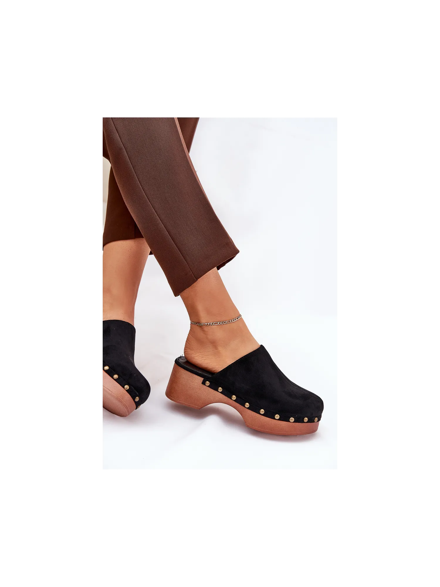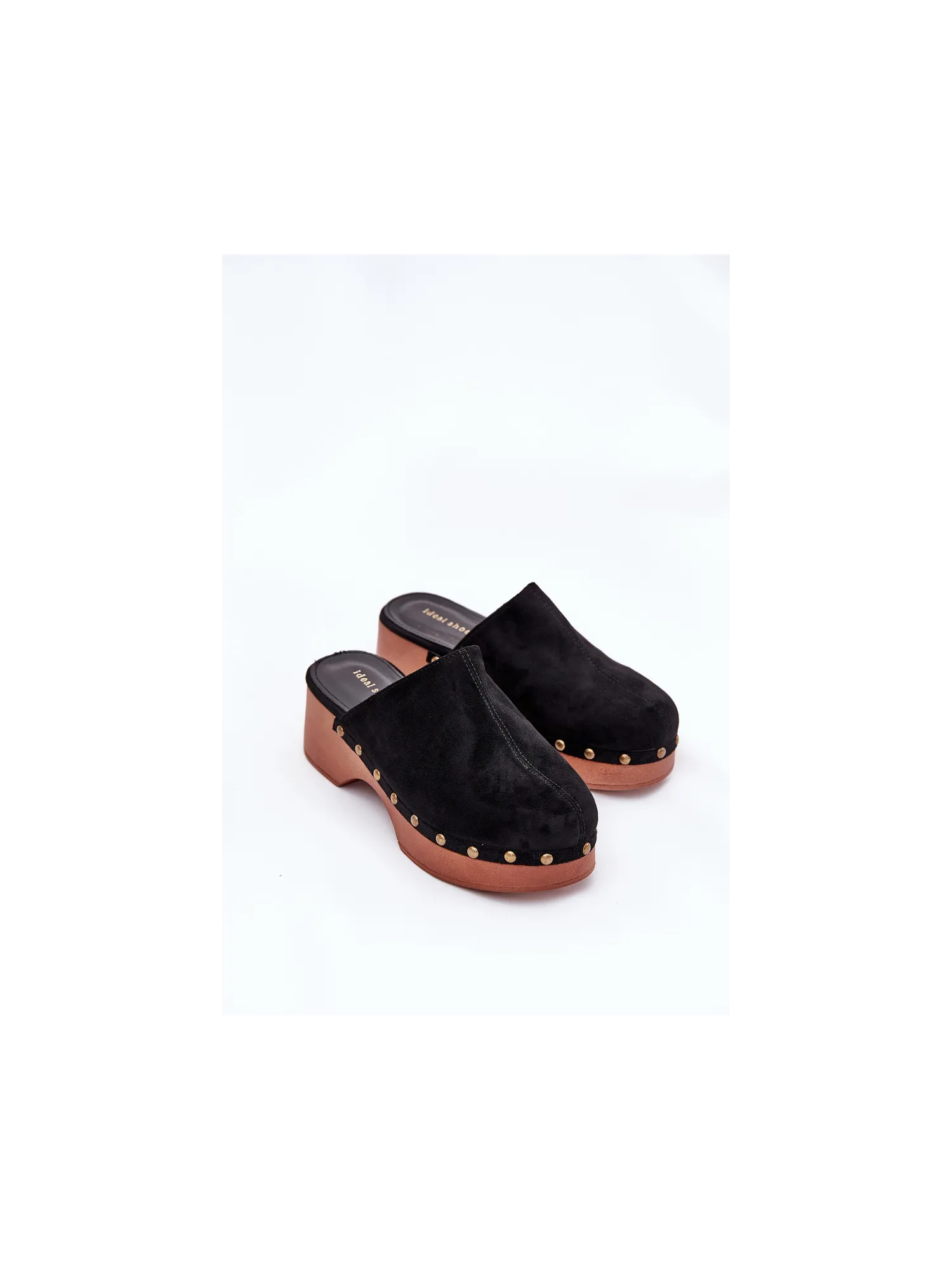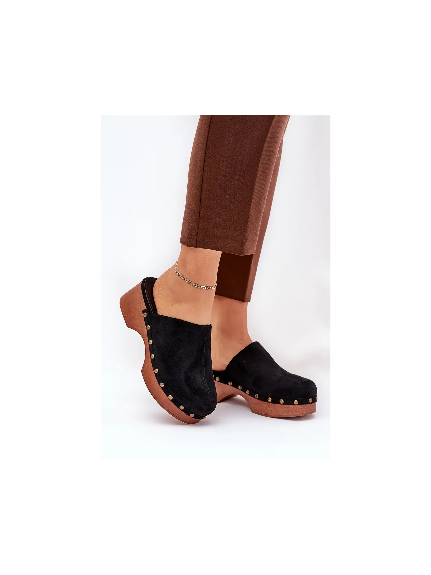 Lightweight women's sandals made of eco suede. Set on a platform and wedge. Decorated with studs that give them a fashionable and unique character. Inside, there is a soft eco-leather insole that guarantees comfort all day long. The sandals have closed, rounded toes. Perfect for everyday wear, they pair well with summer dresses, skirts, and pants. When choosing a size, please refer to the size chart.