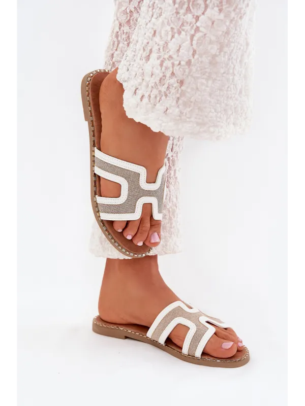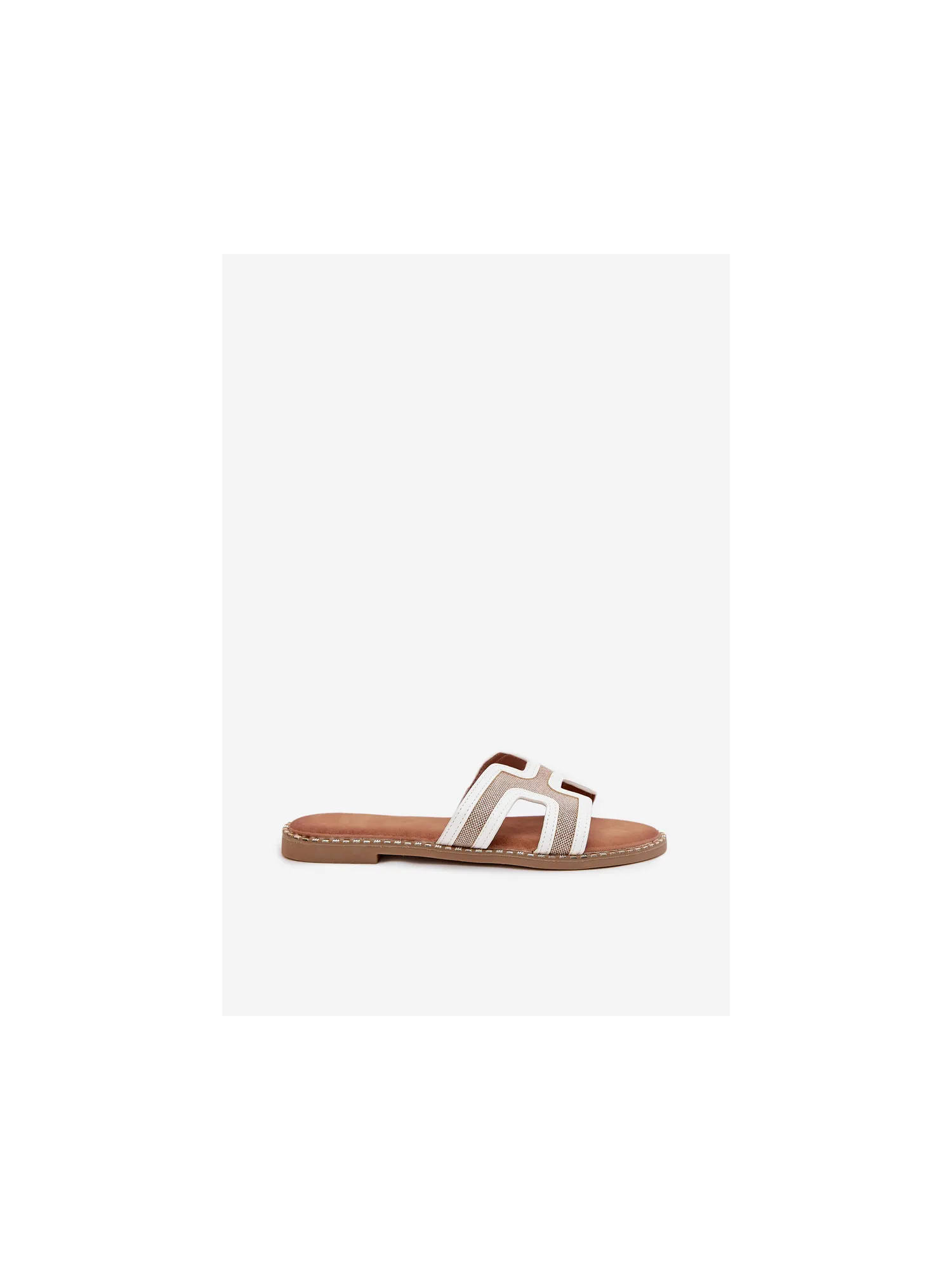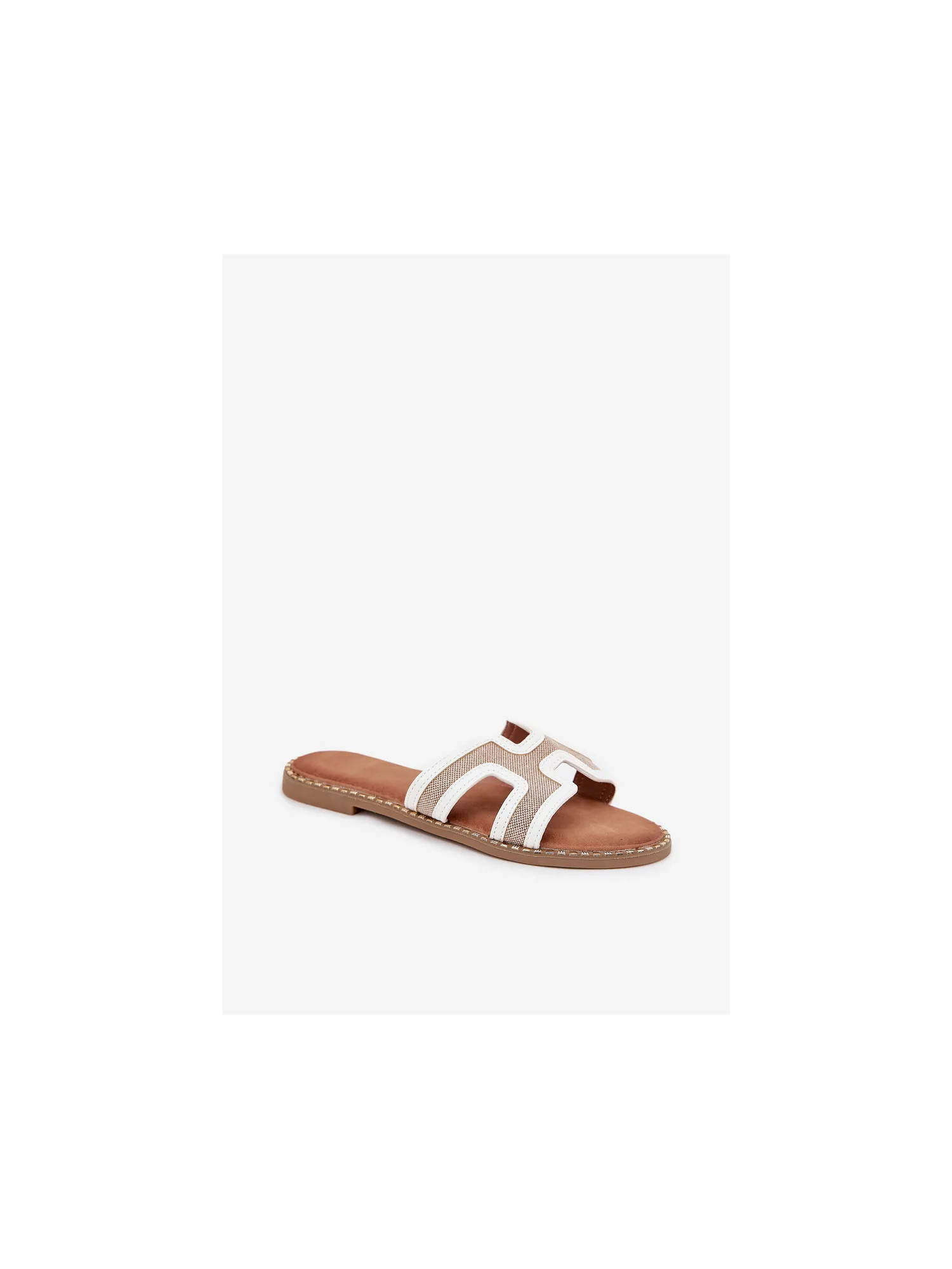 Women's slippers made of a combination of eco-leather and textile material, set on a flat heel, are a comfortable option for everyday wear. There is a golden decoration at the sole that adds a unique character to them. The soft insole provides comfort throughout the day, making the slippers perfect for casual and summer outfits. When choosing a size, please refer to the size chart.