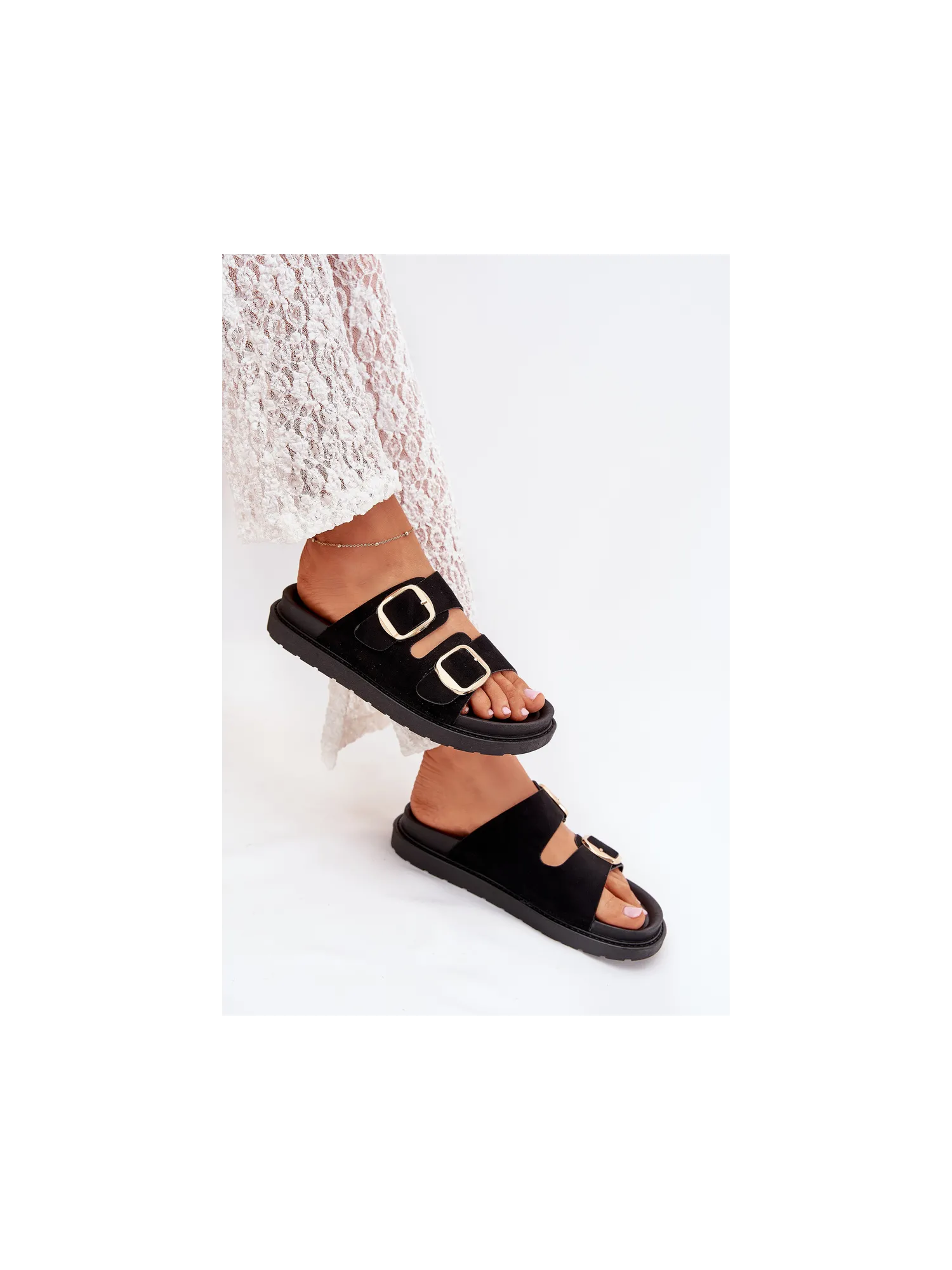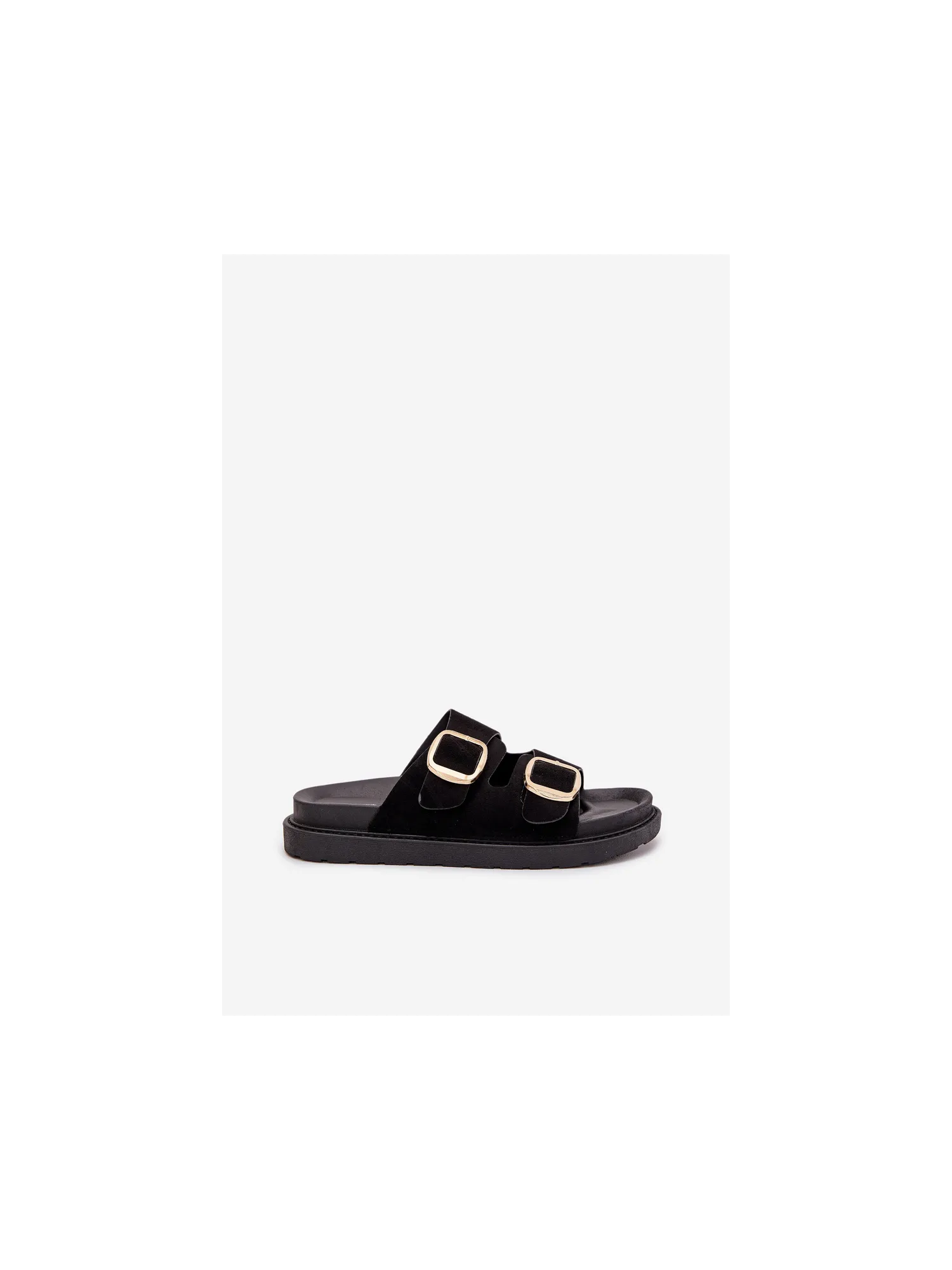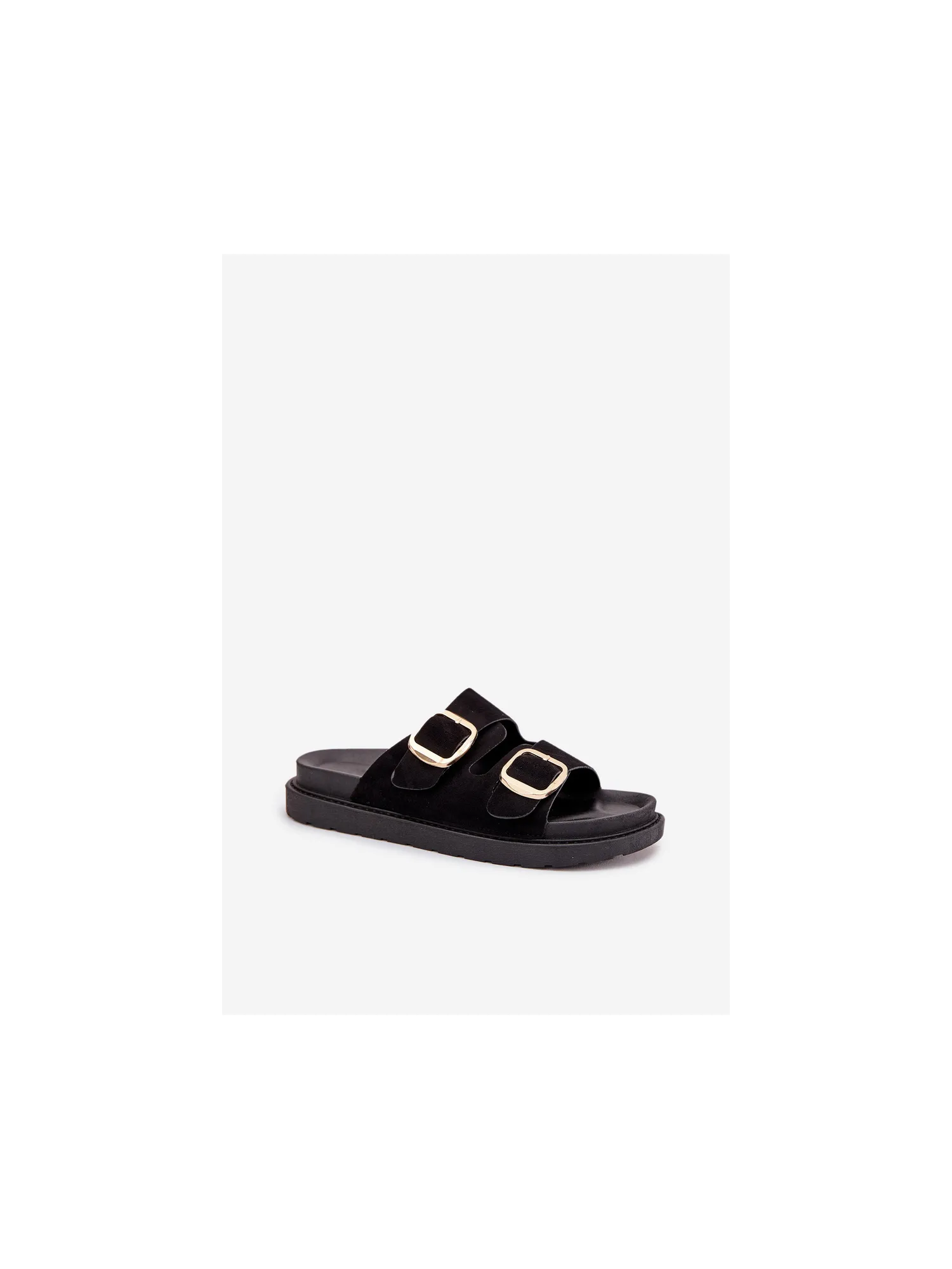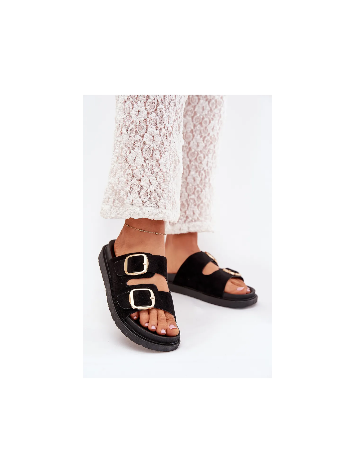 Women's slippers made of eco suede. Set on a platform. Two adjustable straps with gold buckles ensure a perfect fit, while the contoured insole guarantees comfort all day long. Perfect for everyday outings. When choosing a size, please refer to the size chart.