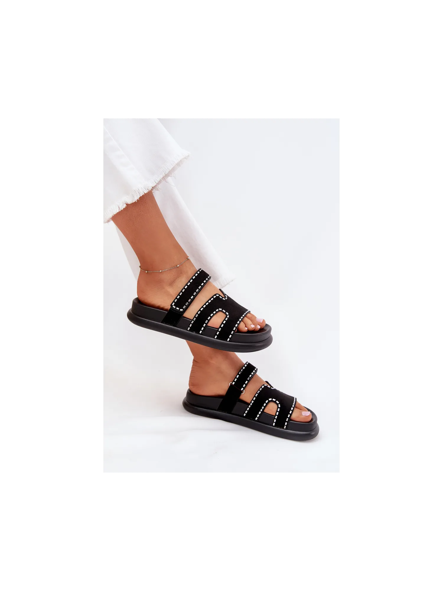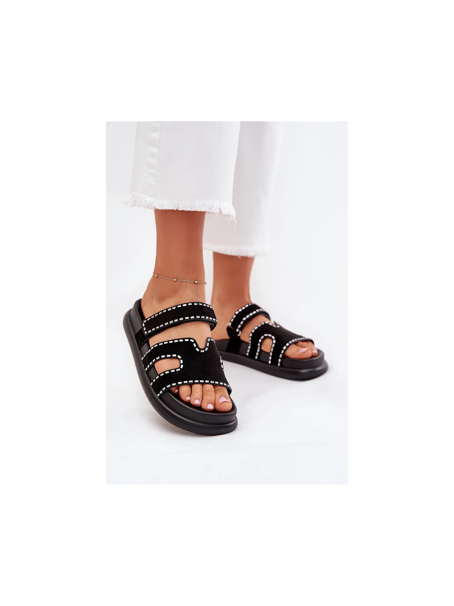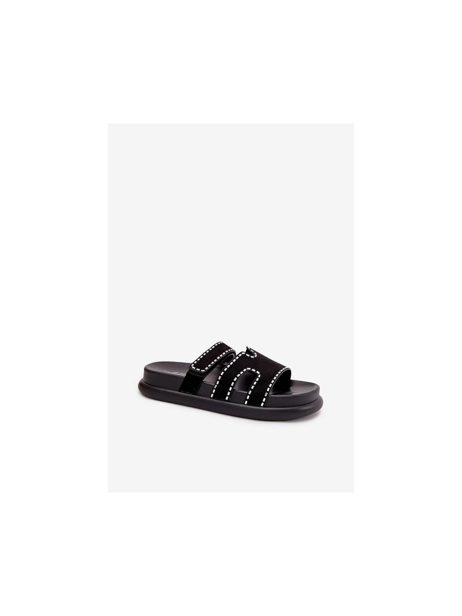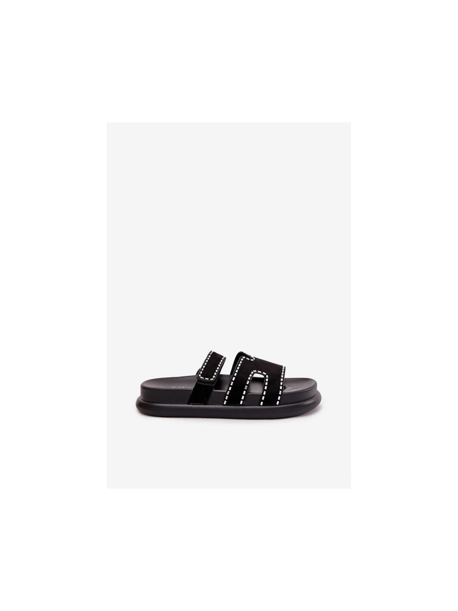 Women's slippers made of eco-suede. Set on a platform. The embellishment gives them a subtle character, and the Velcro strap allows for easy adjustment to the foot, ensuring comfort throughout the day. Perfect for summer days, they pair beautifully with casual and everyday styles. When choosing a size, please refer to the size chart.