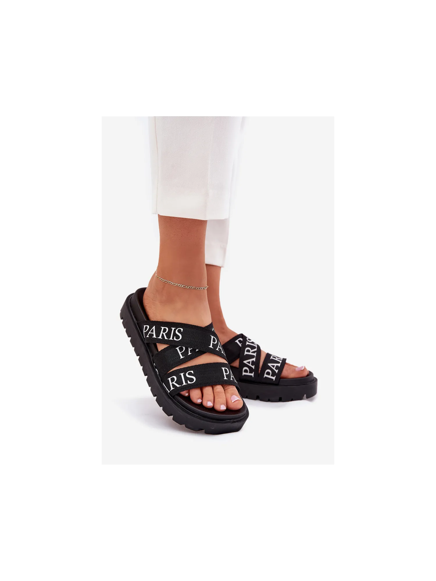 Women's platform sandals with fabric straps featuring the word "PARIS" are a stylish choice for warmer days. Their unique appearance combines comfort with a fashionable accent, giving character to any outfit. Perfect for casual and vacation outfits, they provide comfort and a modern look. When choosing a size, please refer to the size chart.