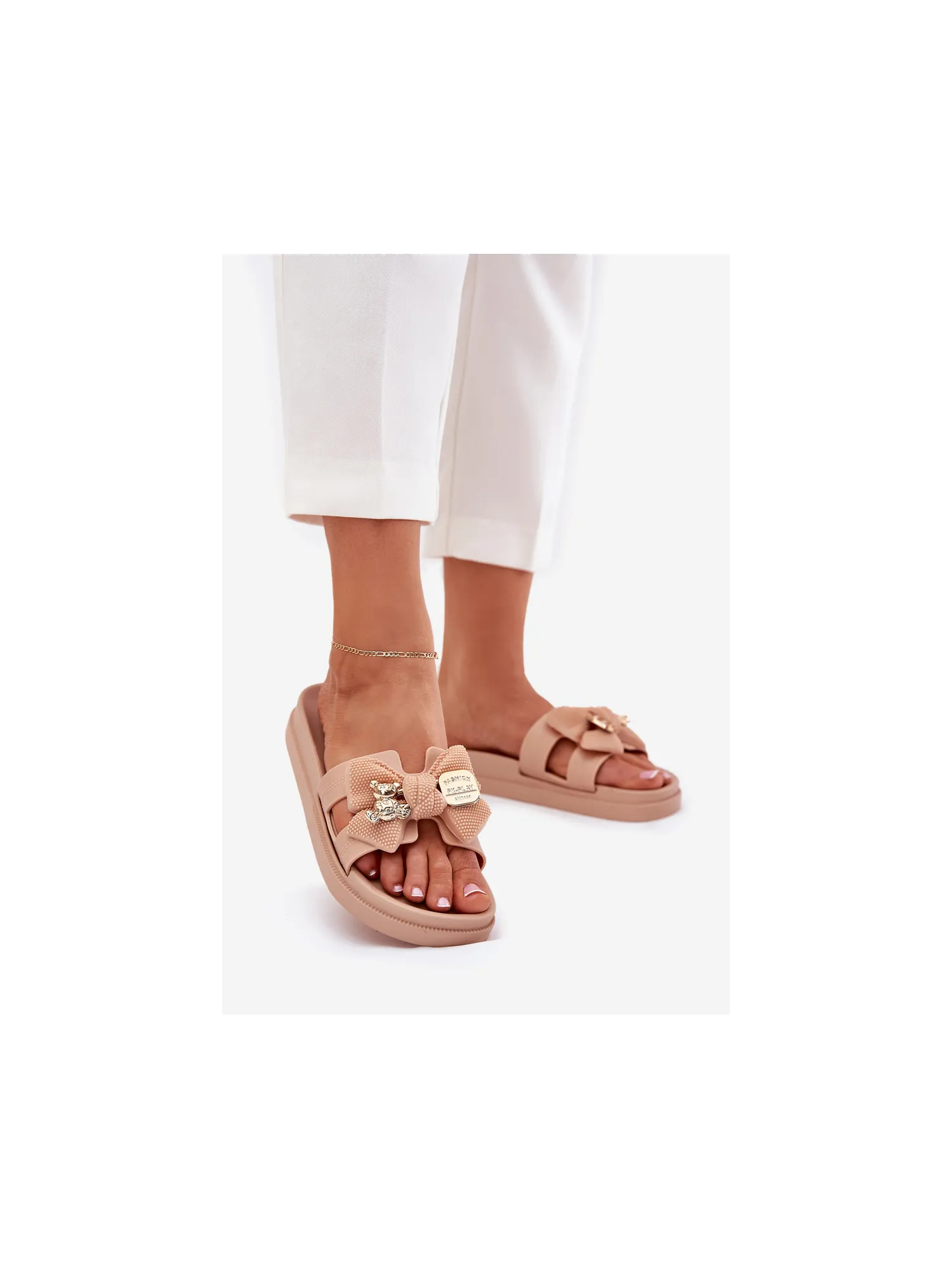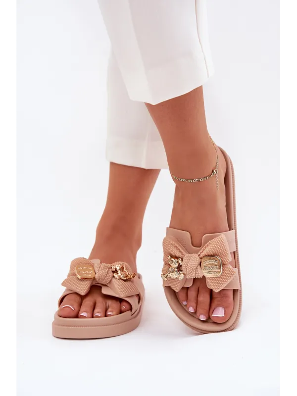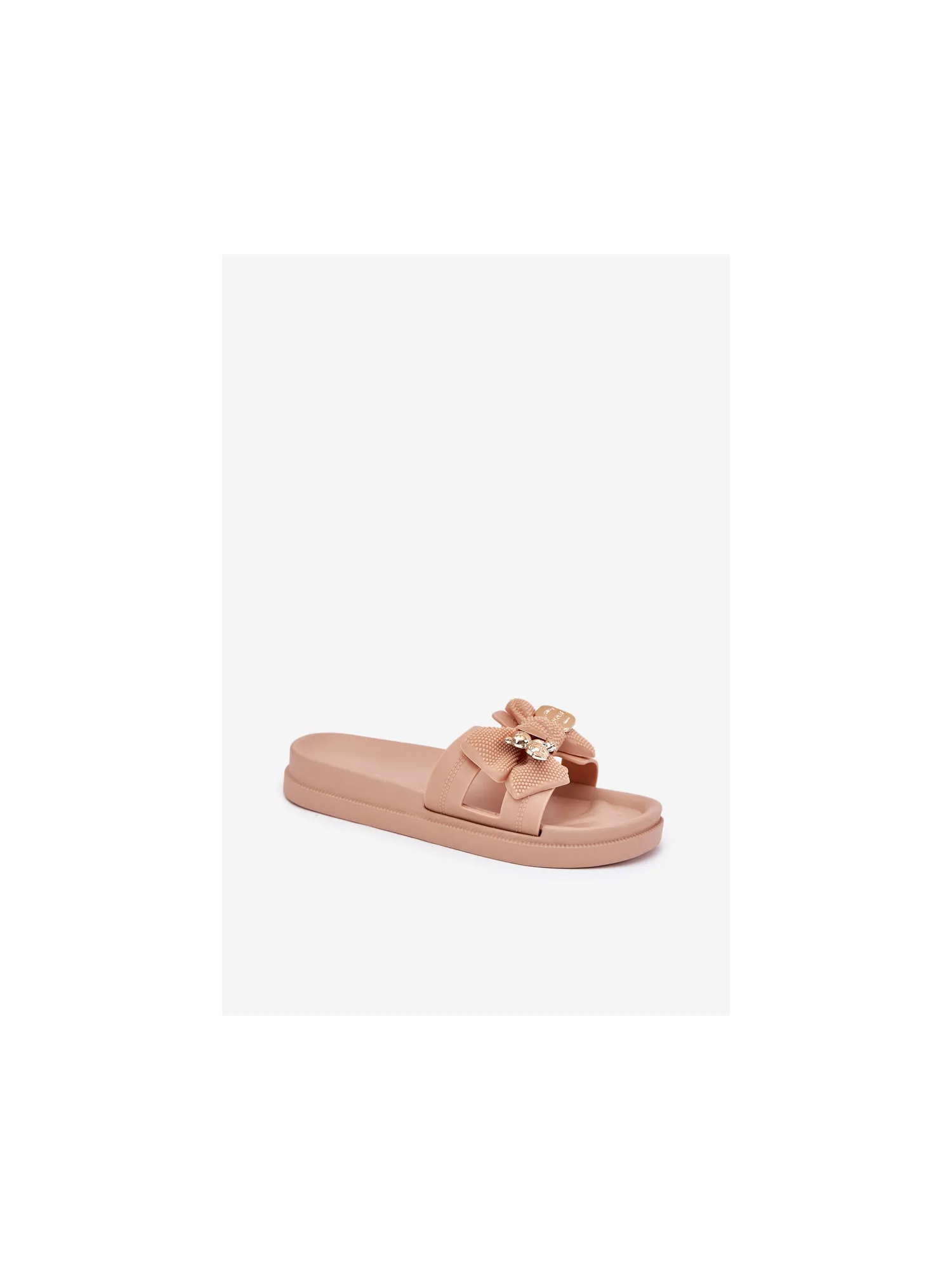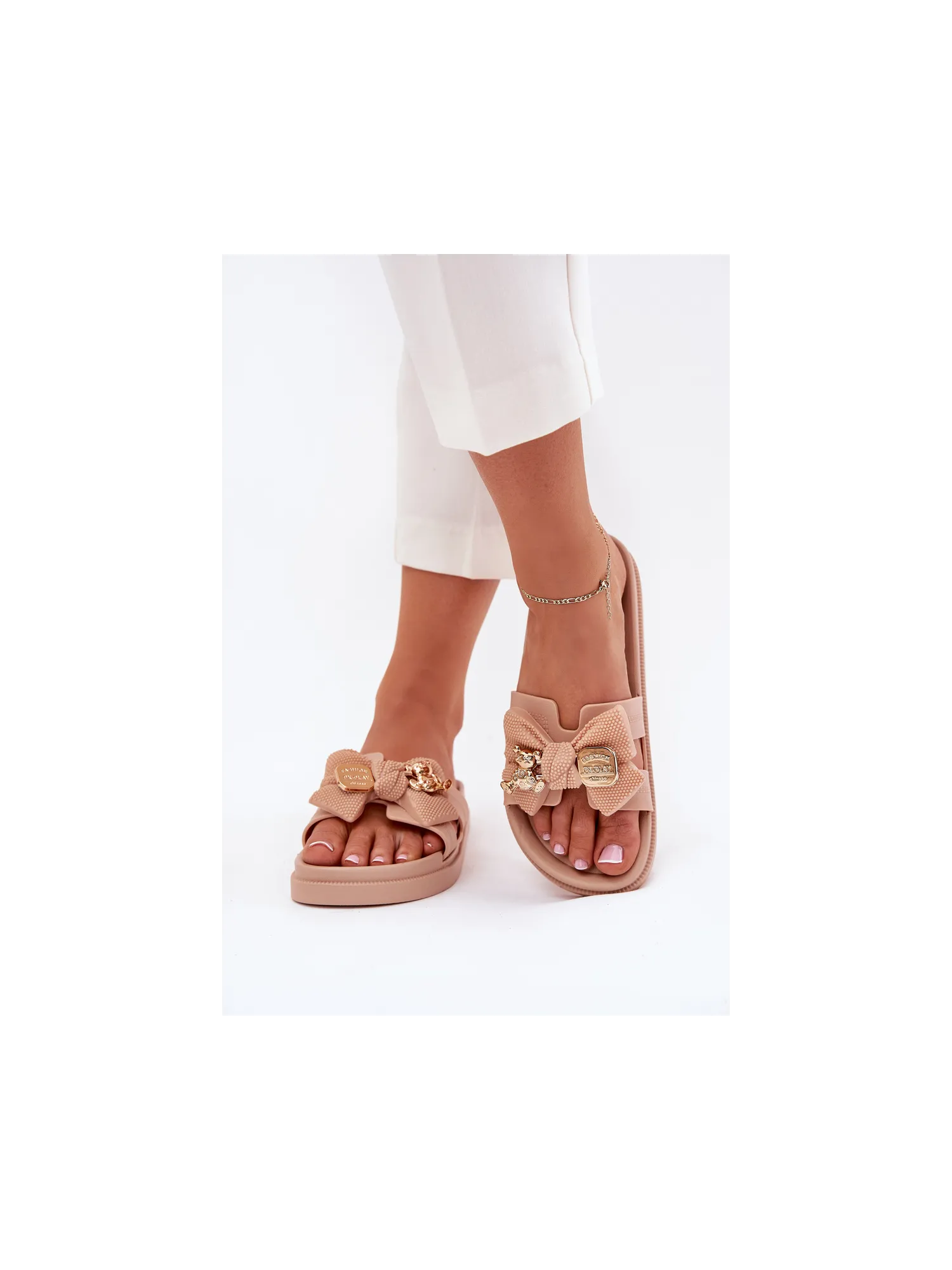 Women's slides with cut-outs, set on a delicate platform. Made from eco-friendly rubber material. Decorated with a bow and a gold brooch, they add a stylish accent to any outfit. Perfect for warm days, they pair wonderfully with summer dresses, skirts, and shorts. When choosing a size, please refer to the size chart.