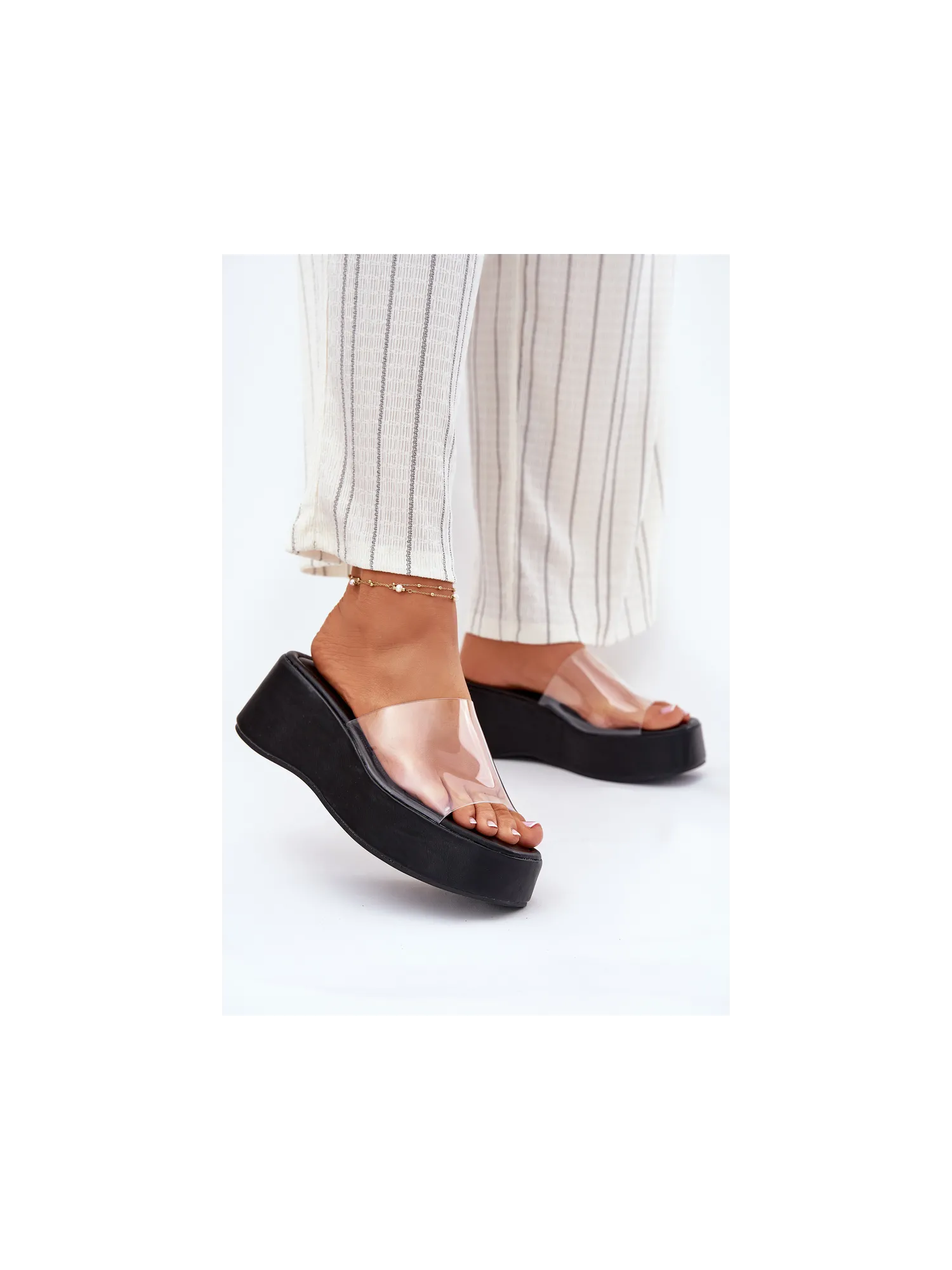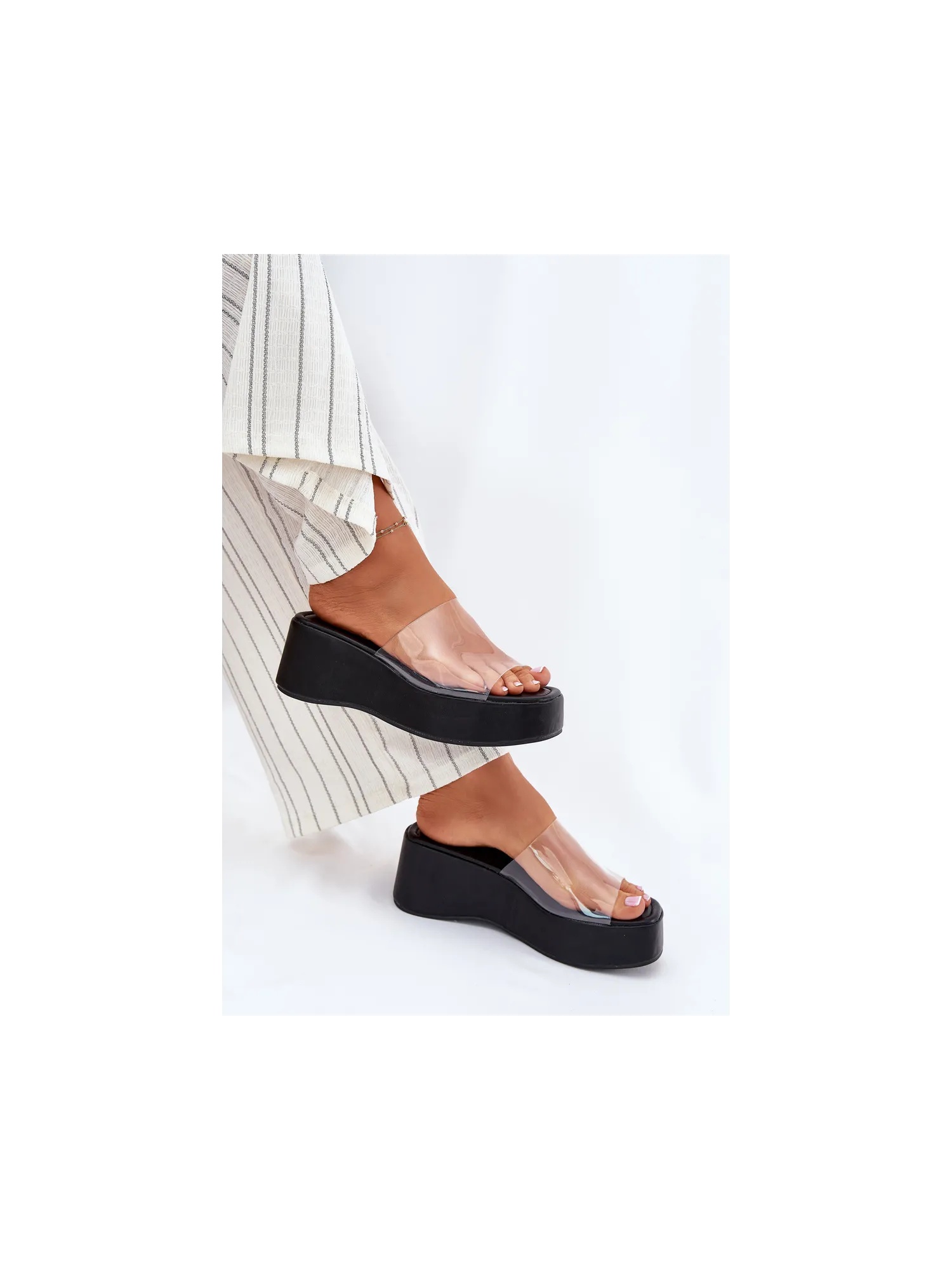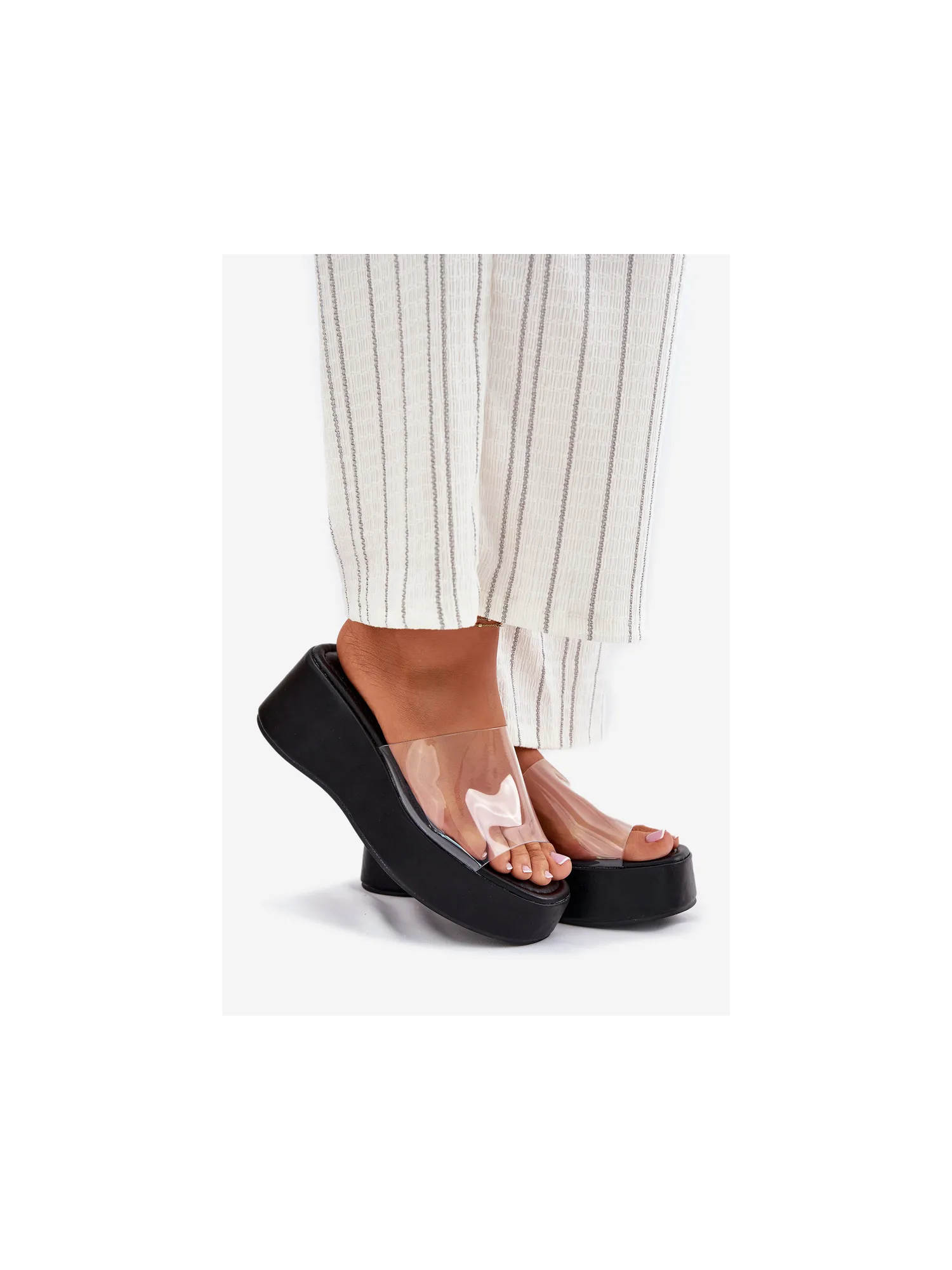 Women’s slides with a transparent strap combine modern style and comfort. This model is set on a wedge that subtly elongates the silhouette while providing stability while walking. The soft insole ensures comfort even during prolonged wear. These slides will perfectly complement both casual and more elegant summer outfits. When choosing a size, please refer to the size chart.