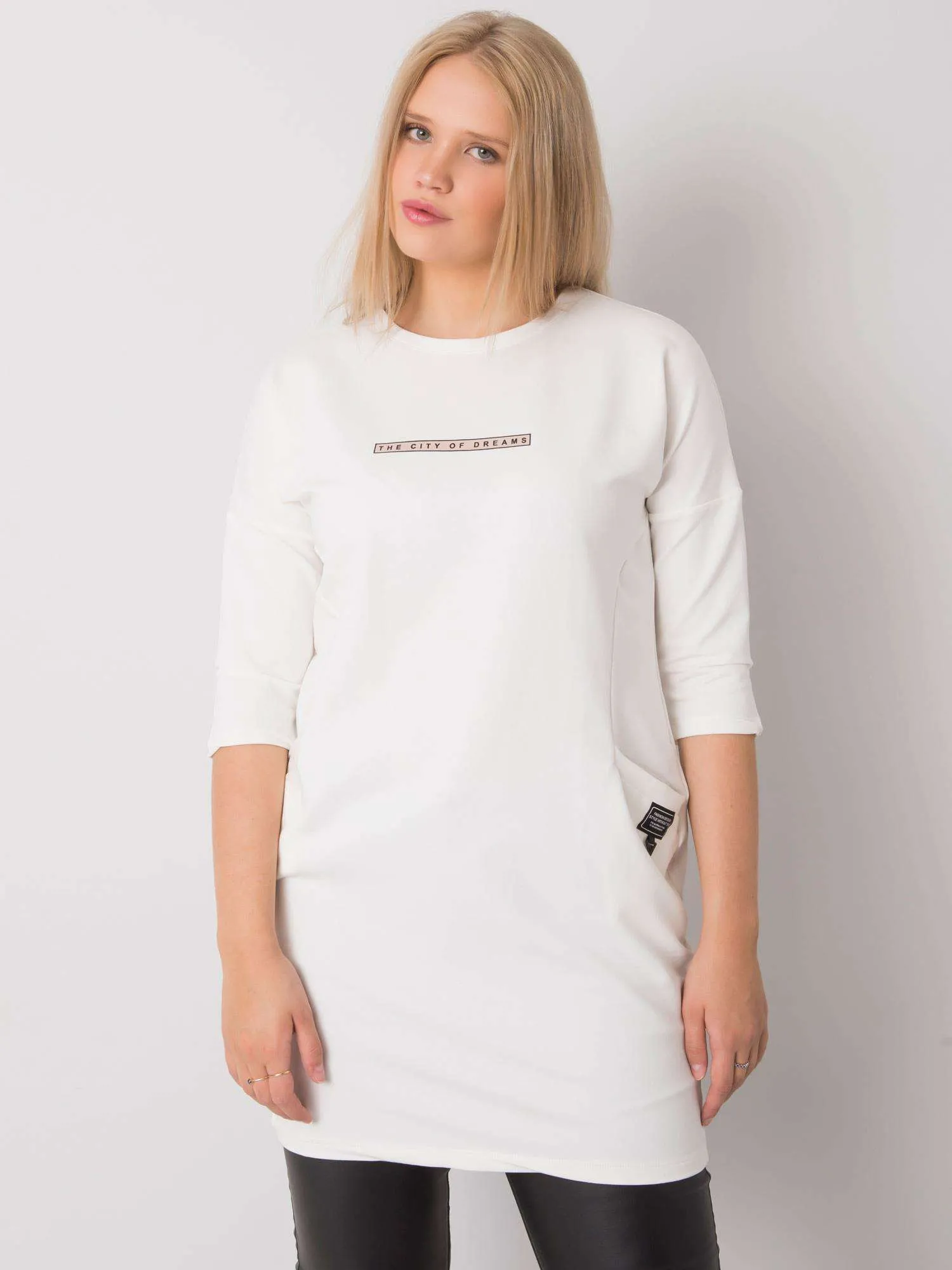 Modelka ma na sobie rozmiar one size. Wymiary modelki: wzrost 177 cm, biust 100 cm, talia 80 cm, biodra 110 cm.