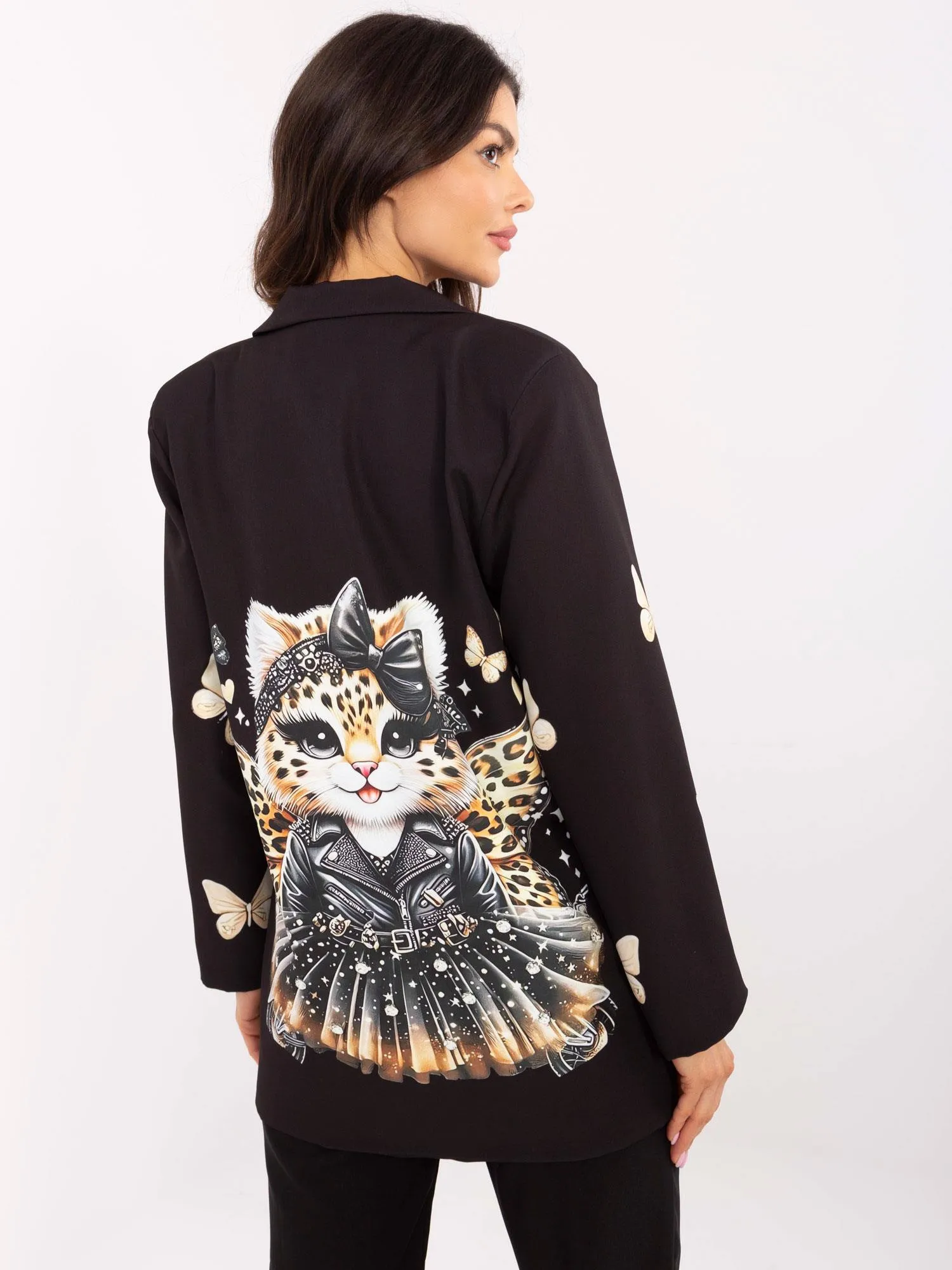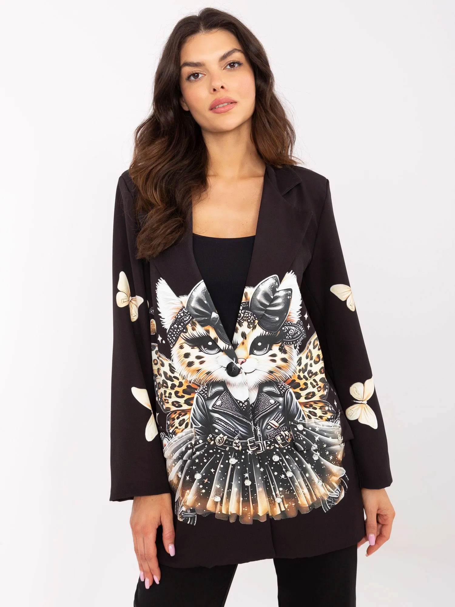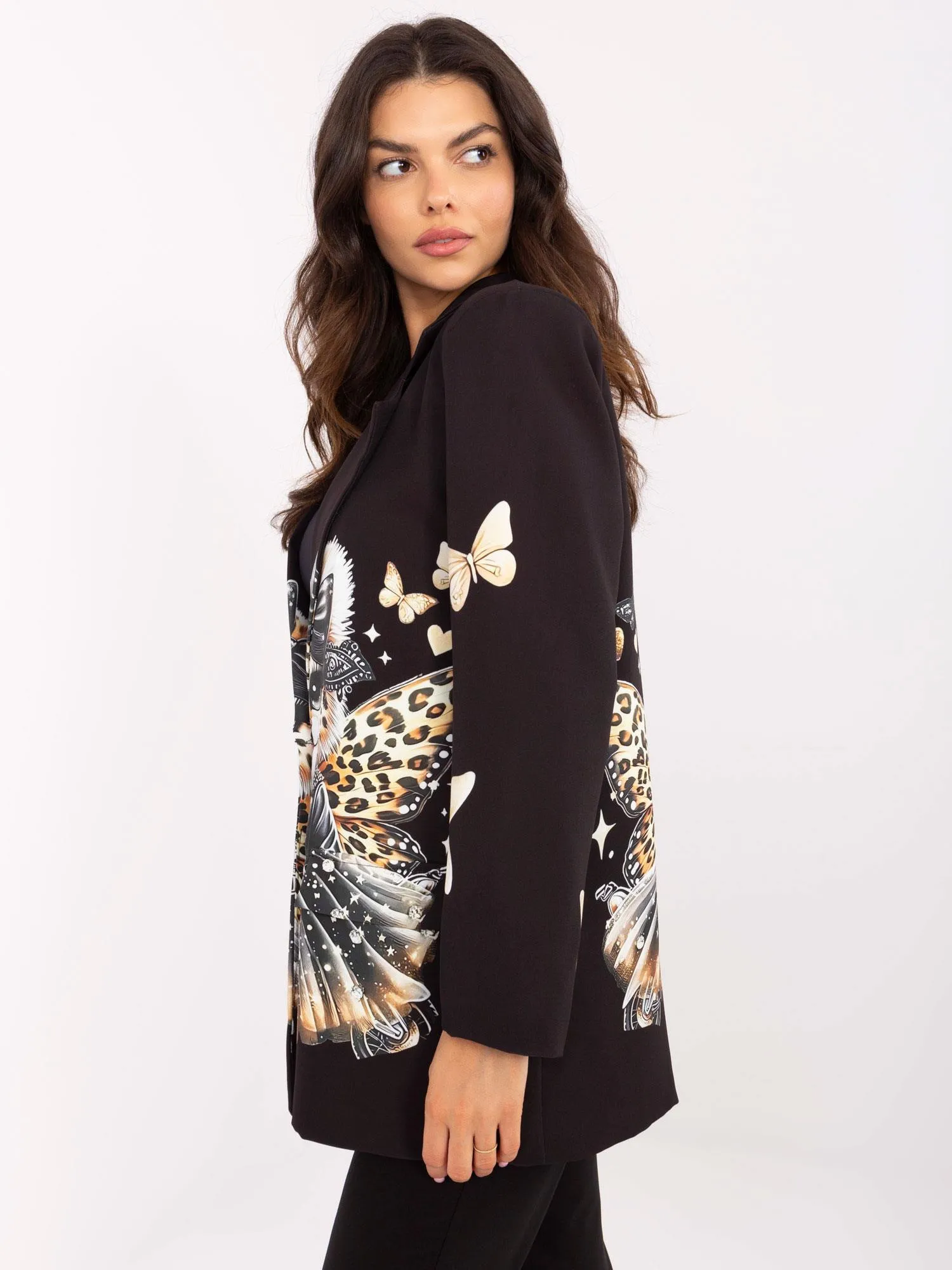 Wymiary marynarki w rozmiarze one size mierzone na płasko: szerokość pod pachami - 54 cm, długość rękawa - 58 cm (od szwu), długość całkowita - 77 cm, szerokość w biodrach - 56 cm.