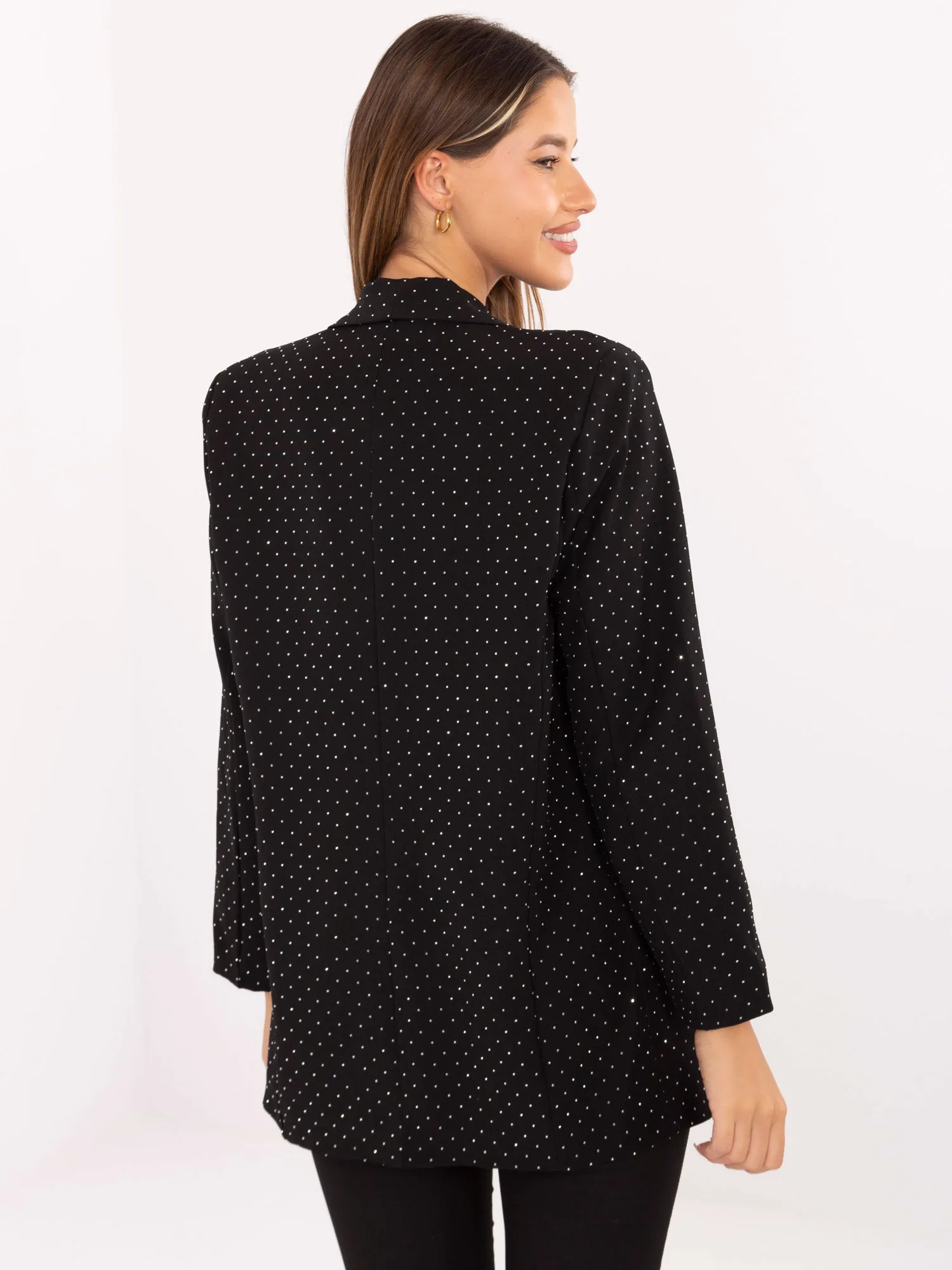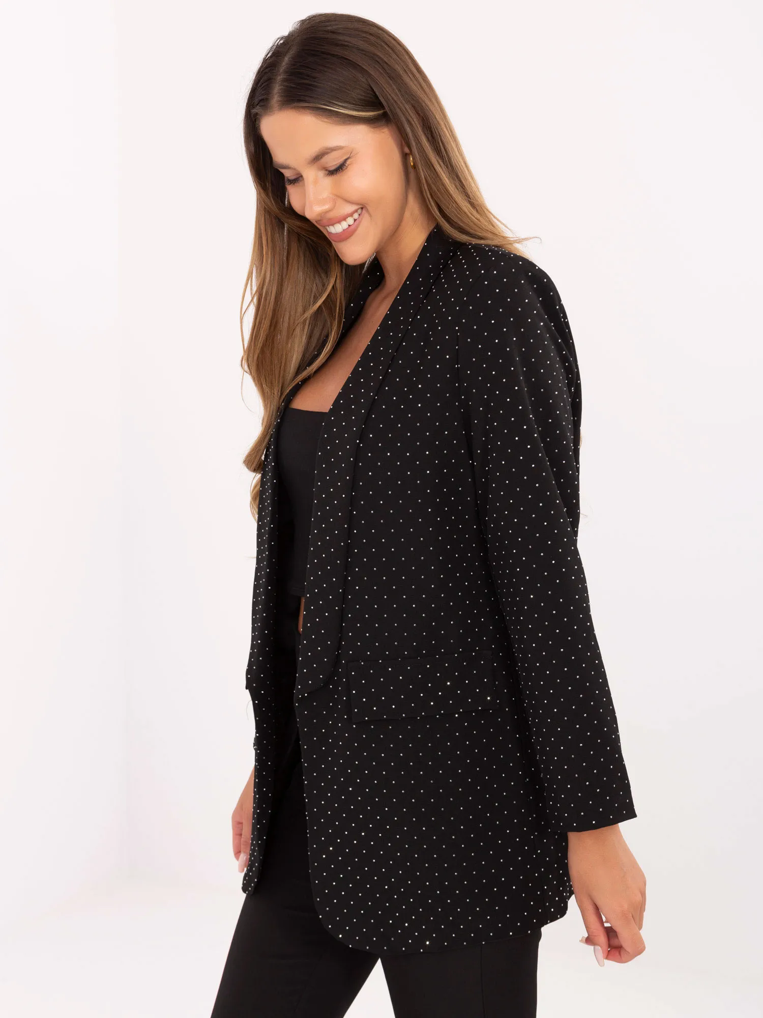 Wymiary marynarki w rozmiarze one size mierzone na płasko: szerokość pod pachami - 56 cm, długość rękawa - 60 cm, szerokość w talii - 56 cm, szerokość w biodrach - 61 cm, długość całkowita - 82 cm.