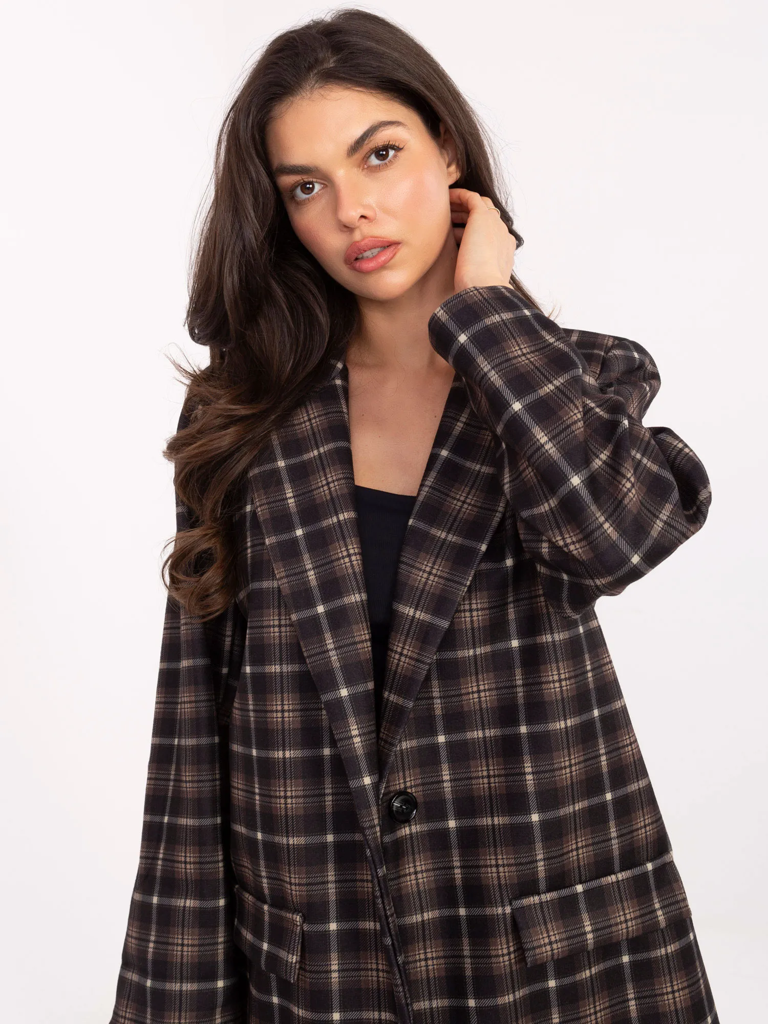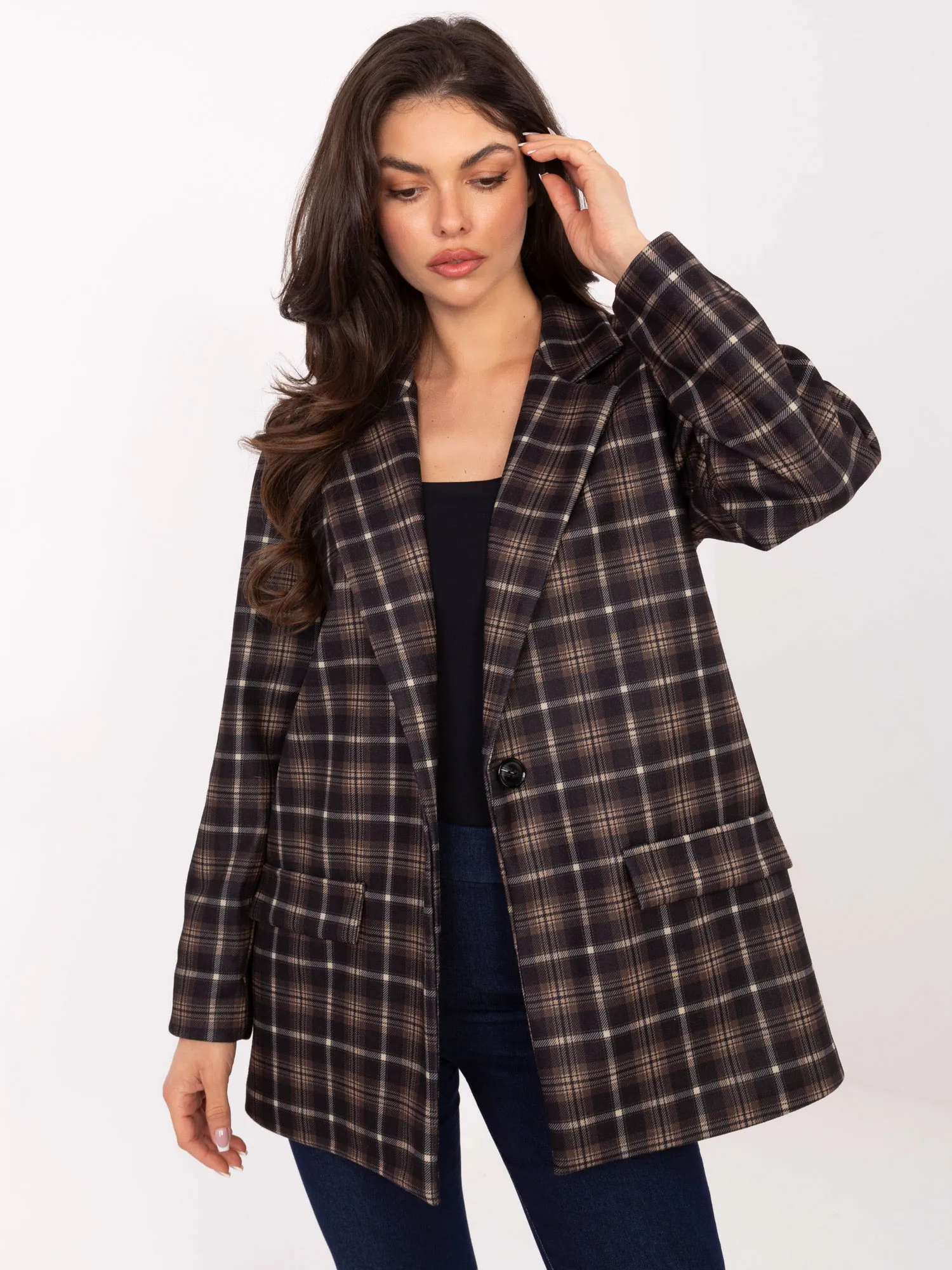 Wymiary marynarki w rozmiarze one size mierzone na płasko: szerokość pod pachami - 58 cm, długość rękawa - 60 cm, szerokość w biodrach - 59 cm, długość całkowita - 77 cm.