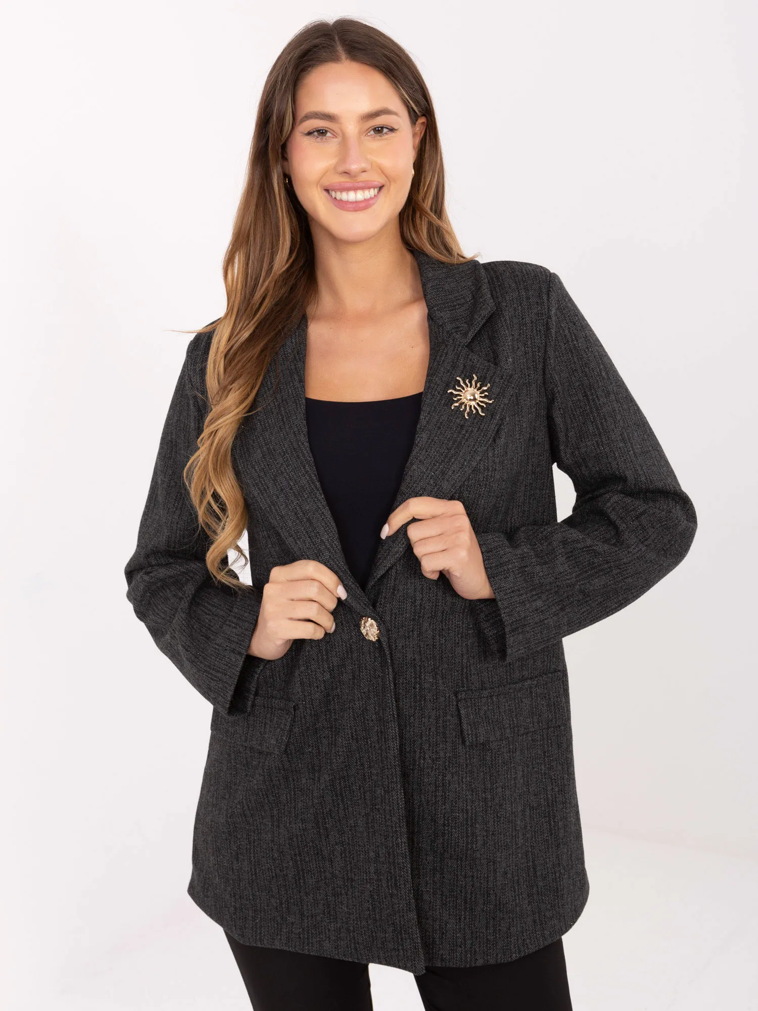 Wymiary marynarki w rozmiarze one size mierzone na płasko: szerokość pod pachami - 51 cm, długość rękawa - 59 cm, szerokość w talii - 51 cm, szerokość w biodrach - 55 cm, długość całkowita - 81 cm.