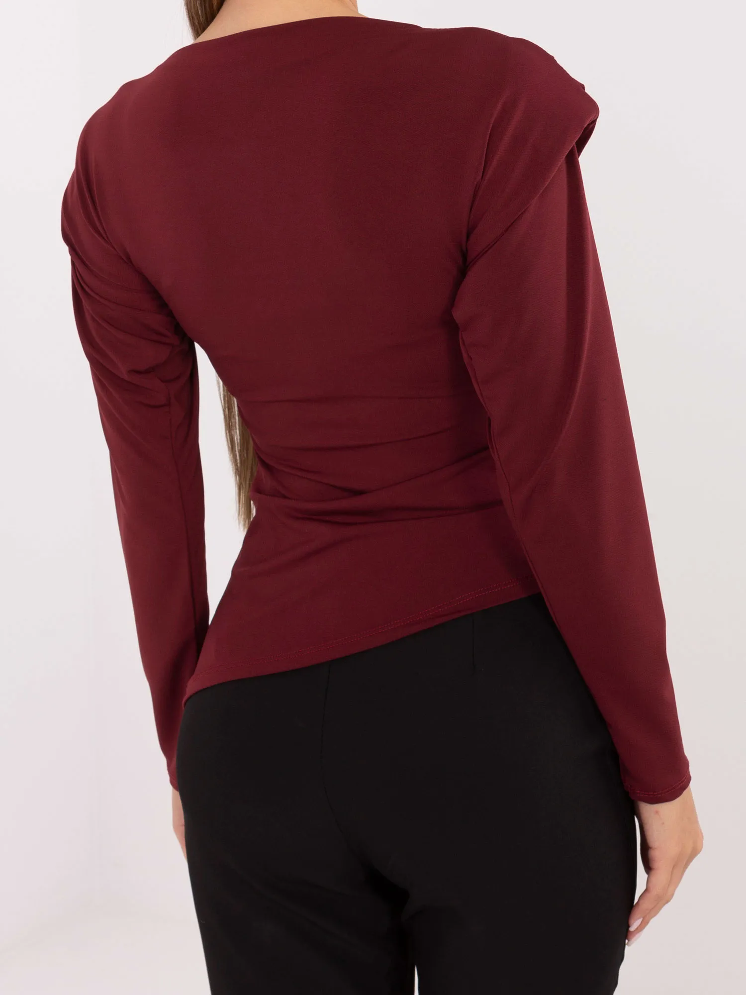 Wymiary bluzki w rozmiarze one size mierzone na płasko: szerokość pod pachami - 49 cm, długość całkowita - 64 cm (po prawej stronie), długość całkowita - 58 cm (po lewej stronie), szerokość w biodrach - 39 cm, długość rękawa - 55 cm.