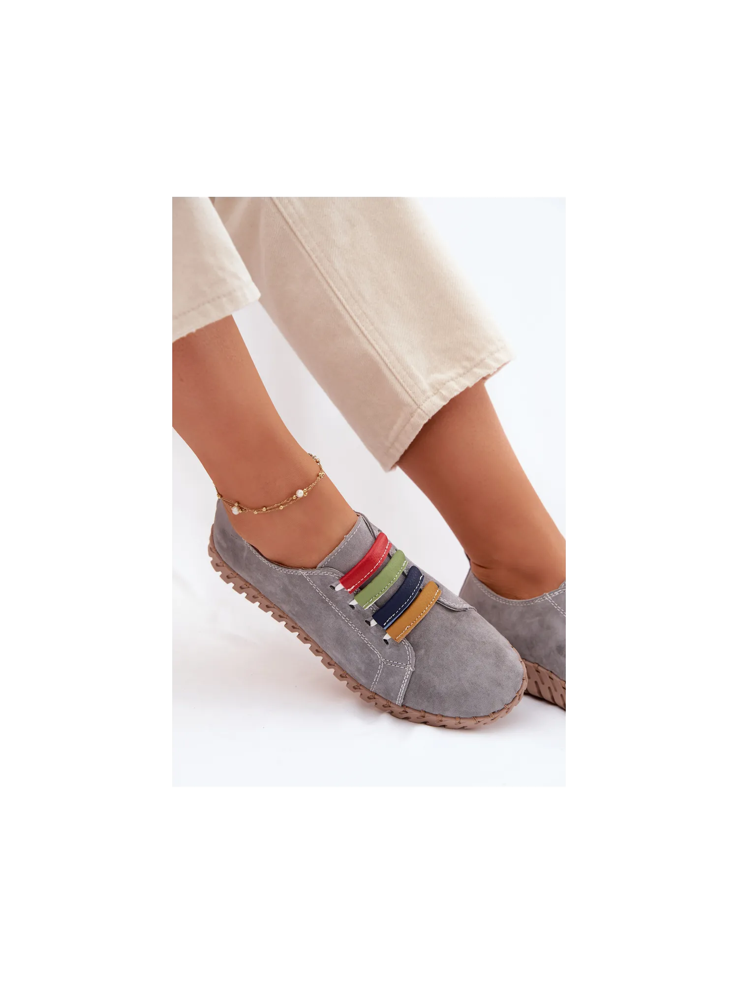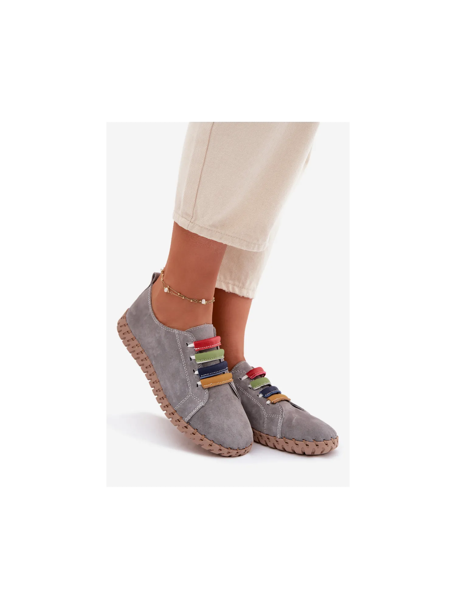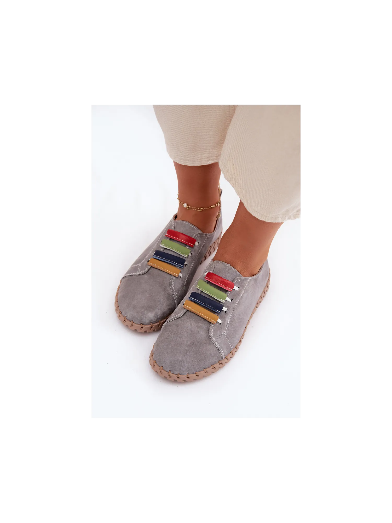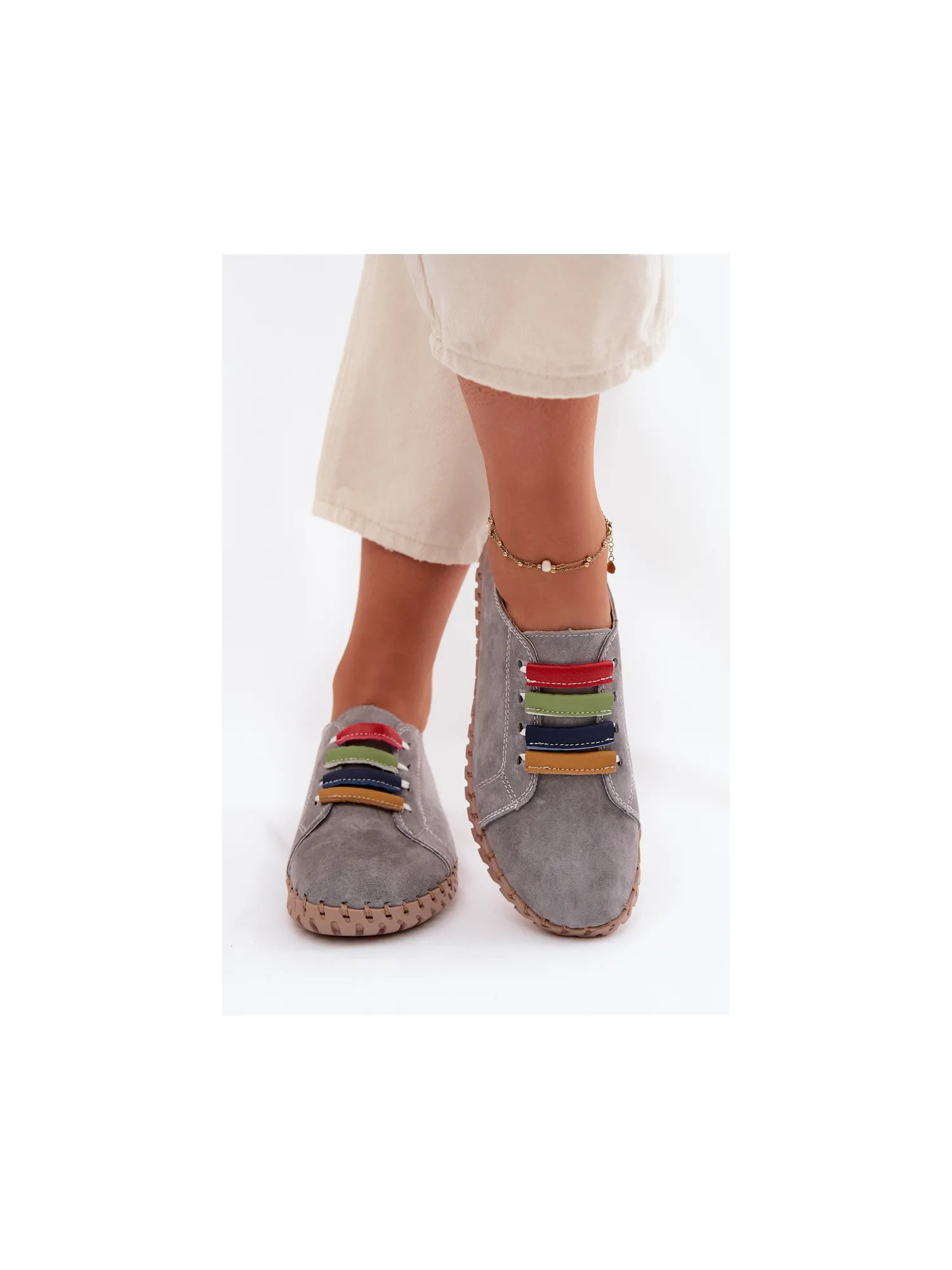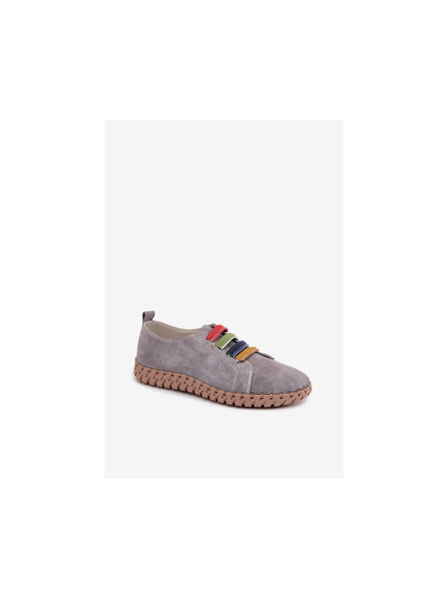 Vinceza women's loafers made from genuine suede are a stylish and comfortable model perfect for everyday wear. The soft material makes the shoes look elegant while providing high comfort. The slip-on design allows for quick wearing and removal. The front of the upper is decorated with colorful straps placed on elastic bands, which serve as an interesting decorative element and also help to better fit the shoe to the foot. The loafers pair well with jeans, fabric trousers, or more casual outfits, ensuring comfort and a fashionable look all day long. When choosing a size, please refer to the size chart.