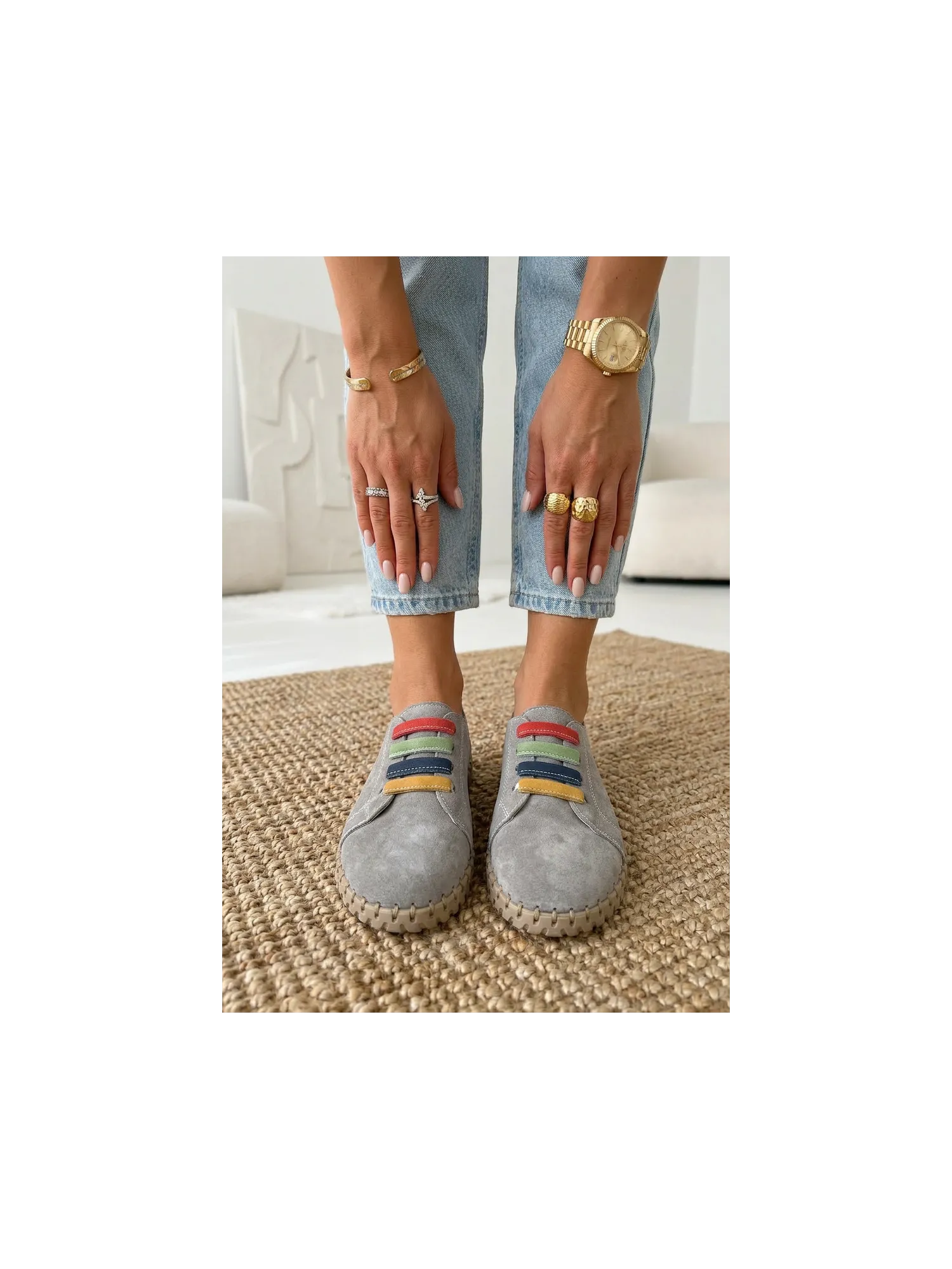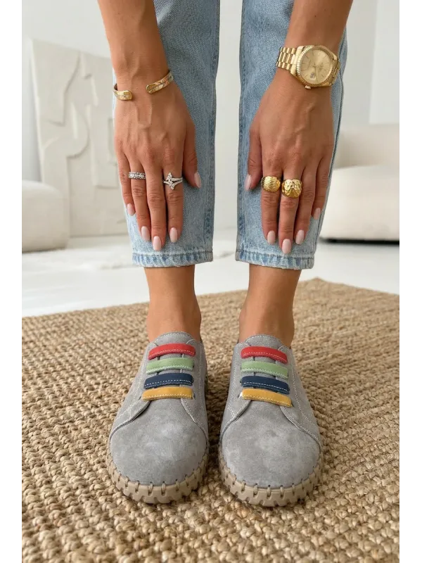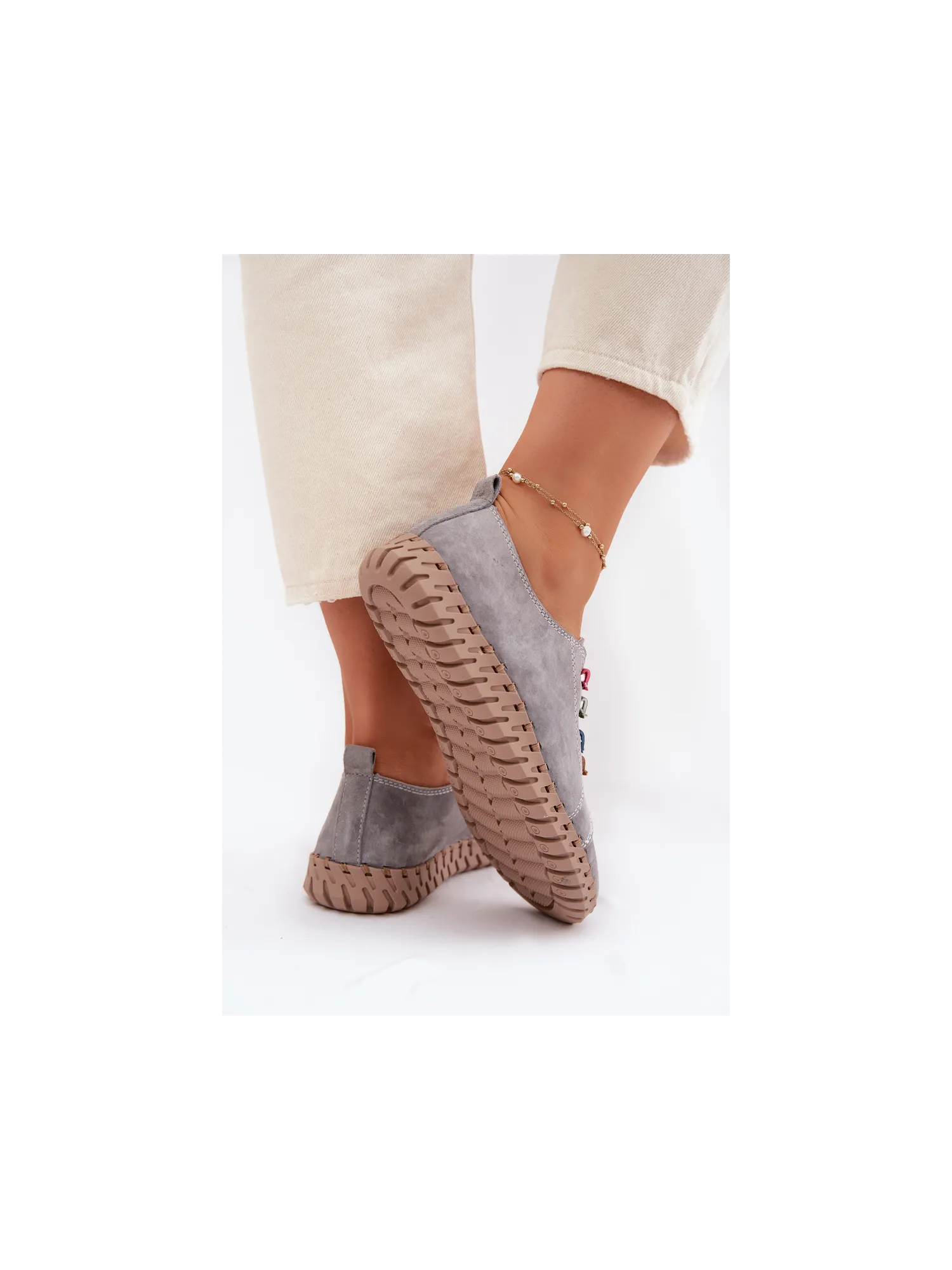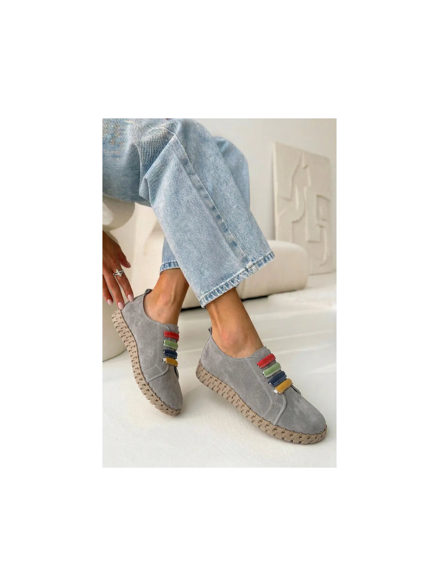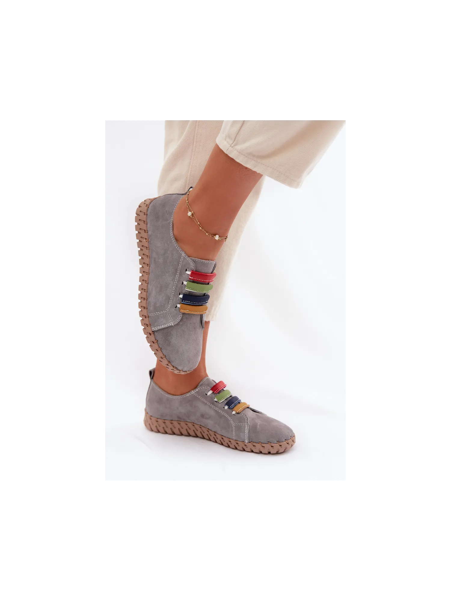 Vinceza women's loafers made from genuine suede are a stylish and comfortable model perfect for everyday wear. The soft material makes the shoes look elegant while providing high comfort. The slip-on design allows for quick wearing and removal. The front of the upper is decorated with colorful straps placed on elastic bands, which serve as an interesting decorative element and also help to better fit the shoe to the foot. The loafers pair well with jeans, fabric trousers, or more casual outfits, ensuring comfort and a fashionable look all day long. When choosing a size, please refer to the size chart.