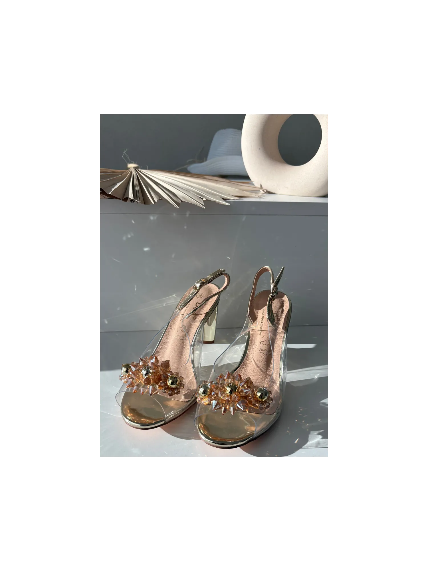 S.BarskiElegant transparent block-heel sandals are a stylish choice for special occasions. The stable heel decorated with sparkling crystals adds a luxurious, jewelry-like character to the overall look, while providing comfort and confidence in walking. The transparent form gives a sense of lightness and a modern appearance, beautifully exposing the foot. These sandals are perfect as an addition to evening outfits, elegant dresses, and occasion wear where an impressive detail and feminine style are important. Please refer to the size chart below when choosing your size. When choosing a size, please refer to the size chart.