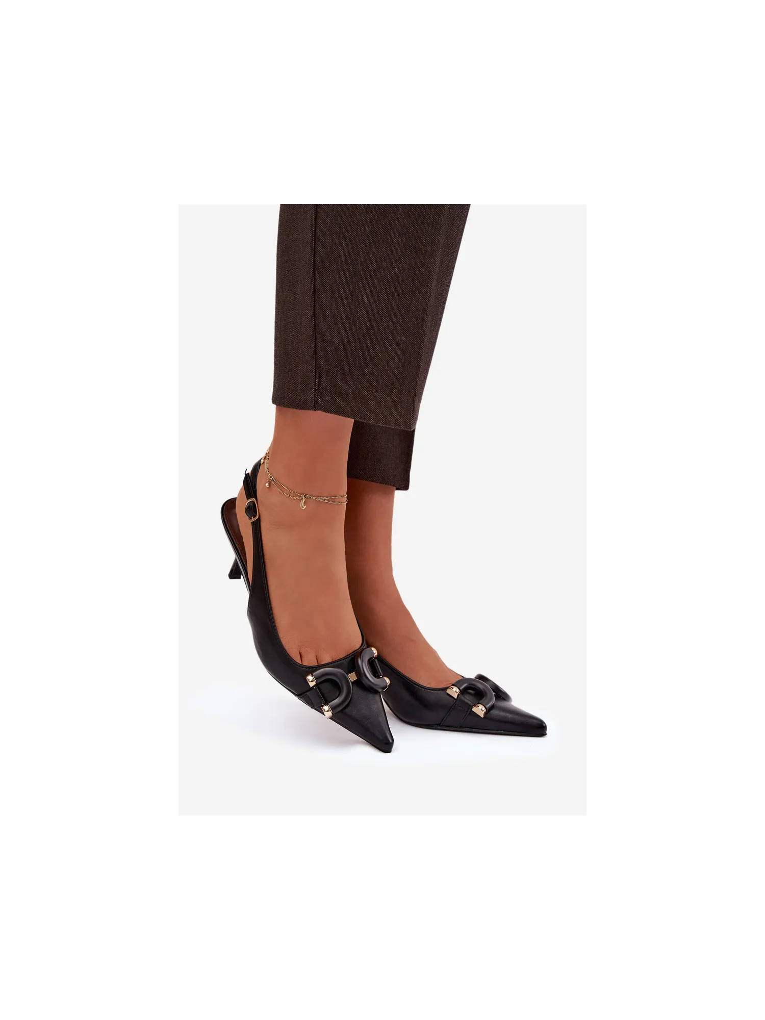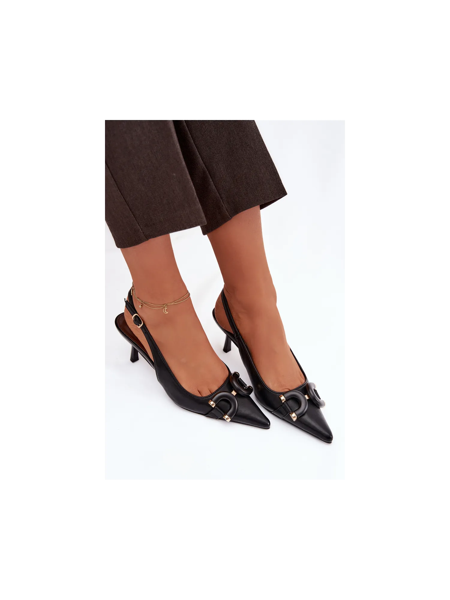 BotoWomen's sandals made from eco leather are a stylish option for special occasions. Covered, pointed toes give them a classic and feminine character, and the decorative detail at the front draws attention and highlights the elegance of the model. The slender heel beautifully elongates the silhouette and adds sophistication. The model with a buckle and adjustable strap allows for a perfect fit, ensuring comfort and stability while wearing. Sandals are perfect to complement many outfits, elegant dresses, and dressy occasions. When choosing a size, please refer to the size chart.