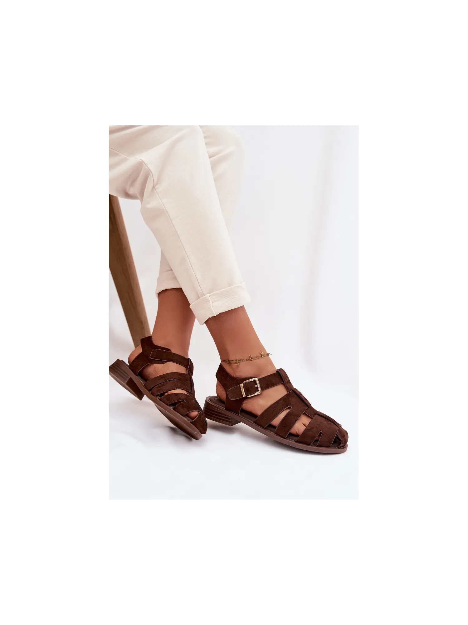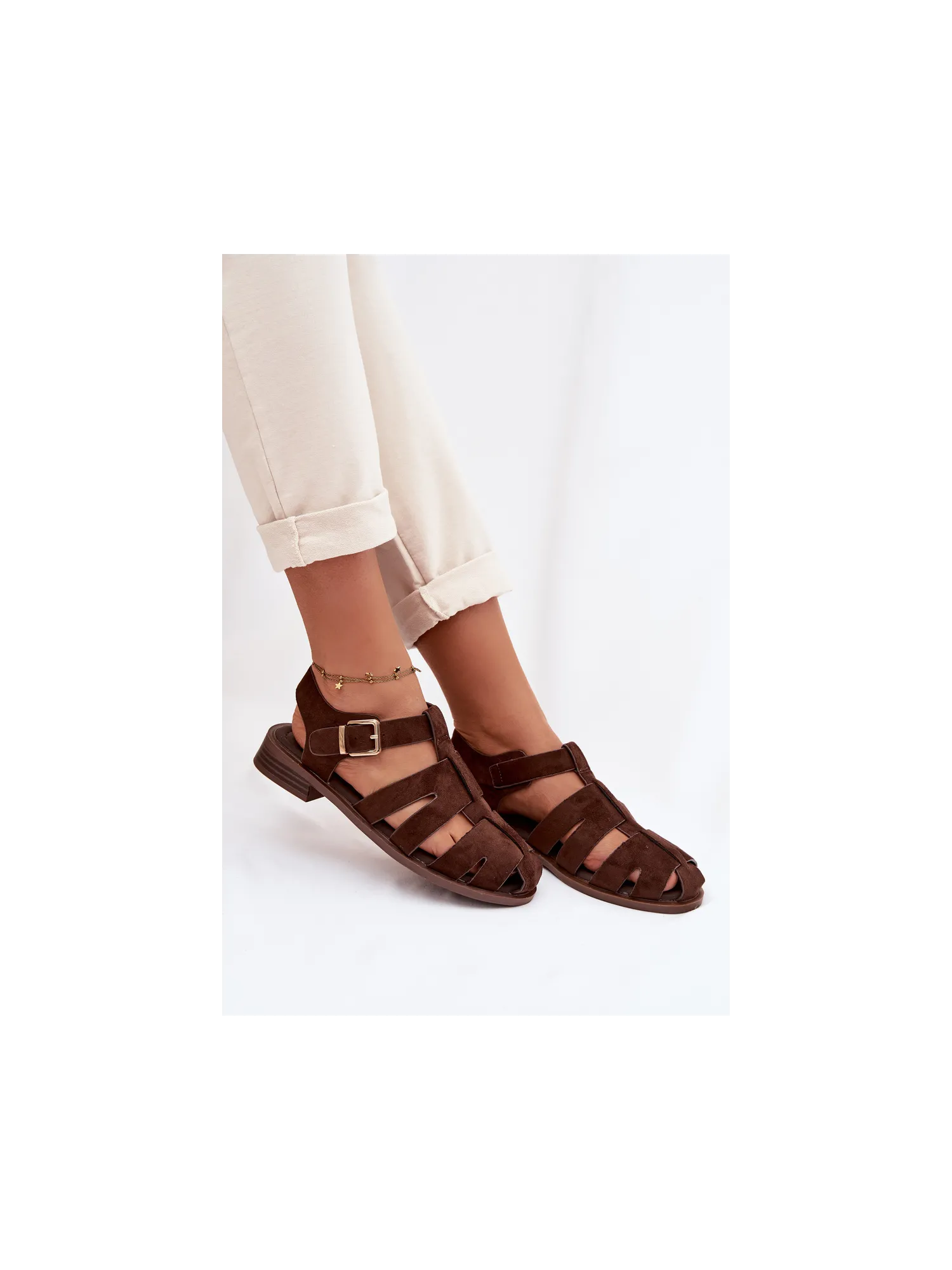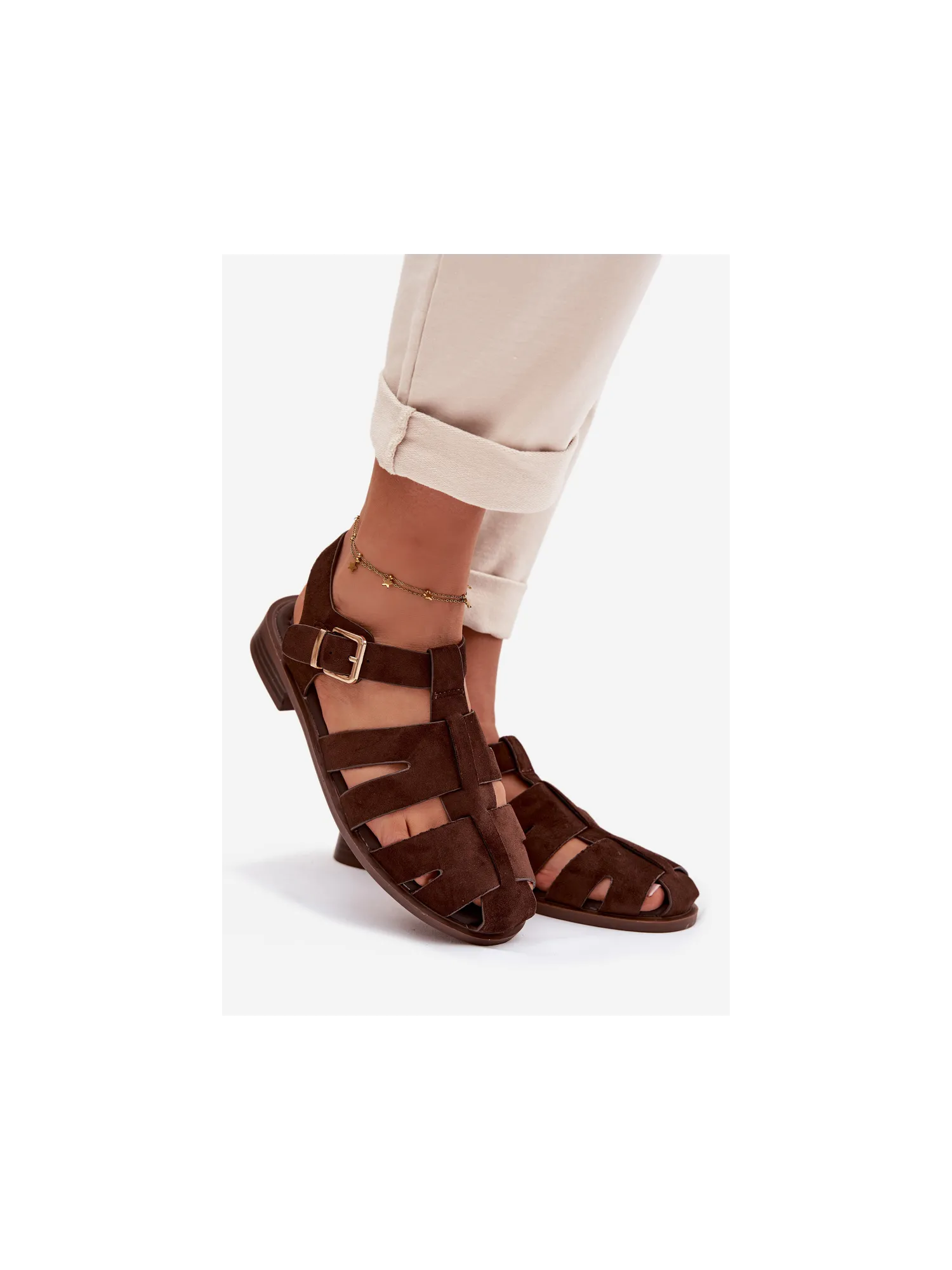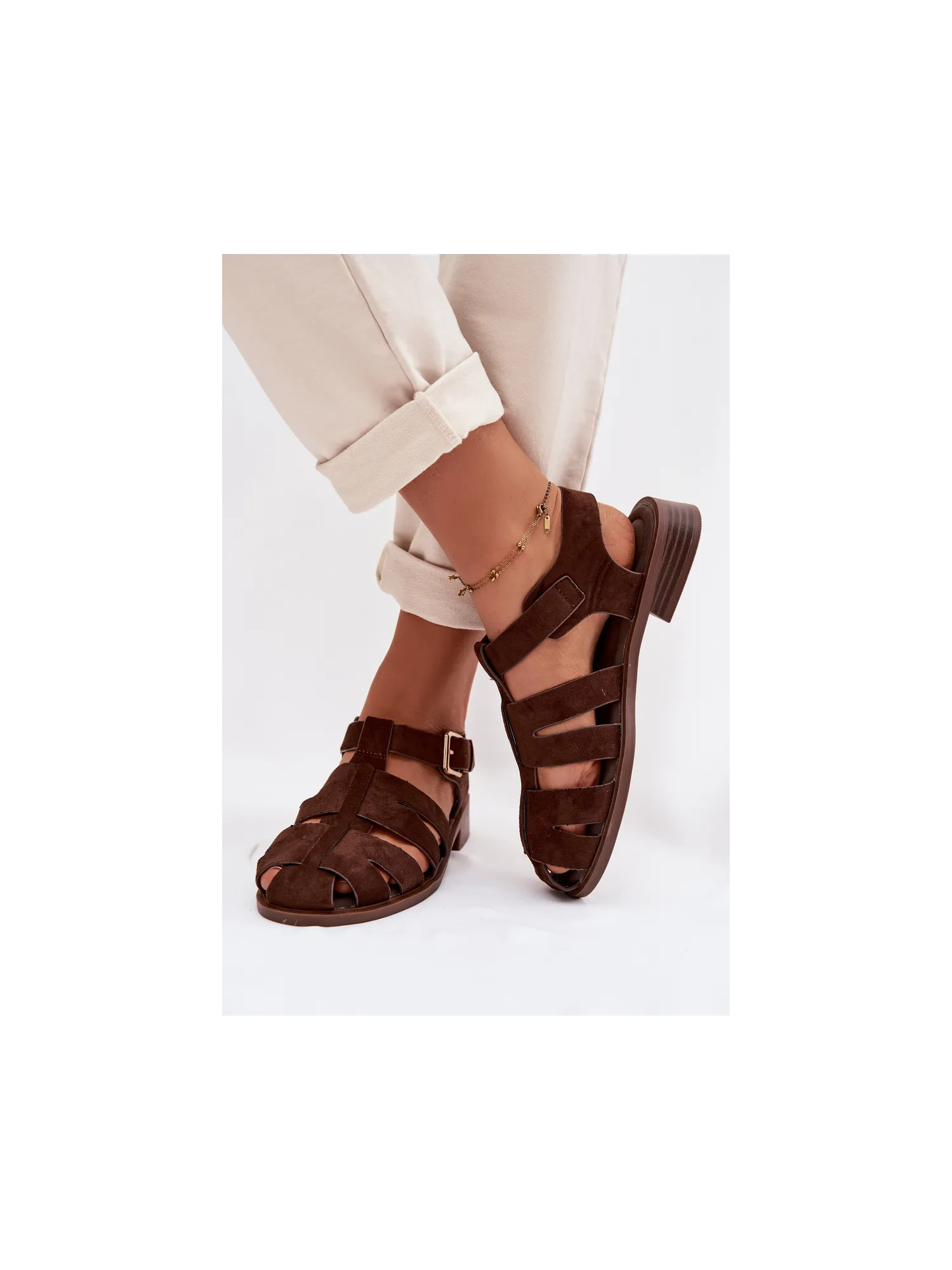 Moteriškos romėniškos basutės su auksine sagtimi šokolado spalvos Janessa