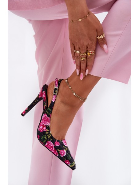 Puošnios moteriškos aukštakulnės basutės – tai pasiūlymas moterims, vertinančioms stilių ir originalumą. Modelis su smailiomis noselėmis gražiai pailgina pėdą. Užsegamos sagtimi aplink čiurną, jos suteikia stabilumo ir puikiai priglunda. Viršutinė dalis pasižymi ryškiu rožių raštu, suteikiančiu visumai unikalumo. Tai puikus pasirinkimas ypatingoms progoms, šventėms ar vasaros vakarams, kai norite pabrėžti savo unikalų stilių. Renkantis dydį, vadovaukitės dydžių lentele.