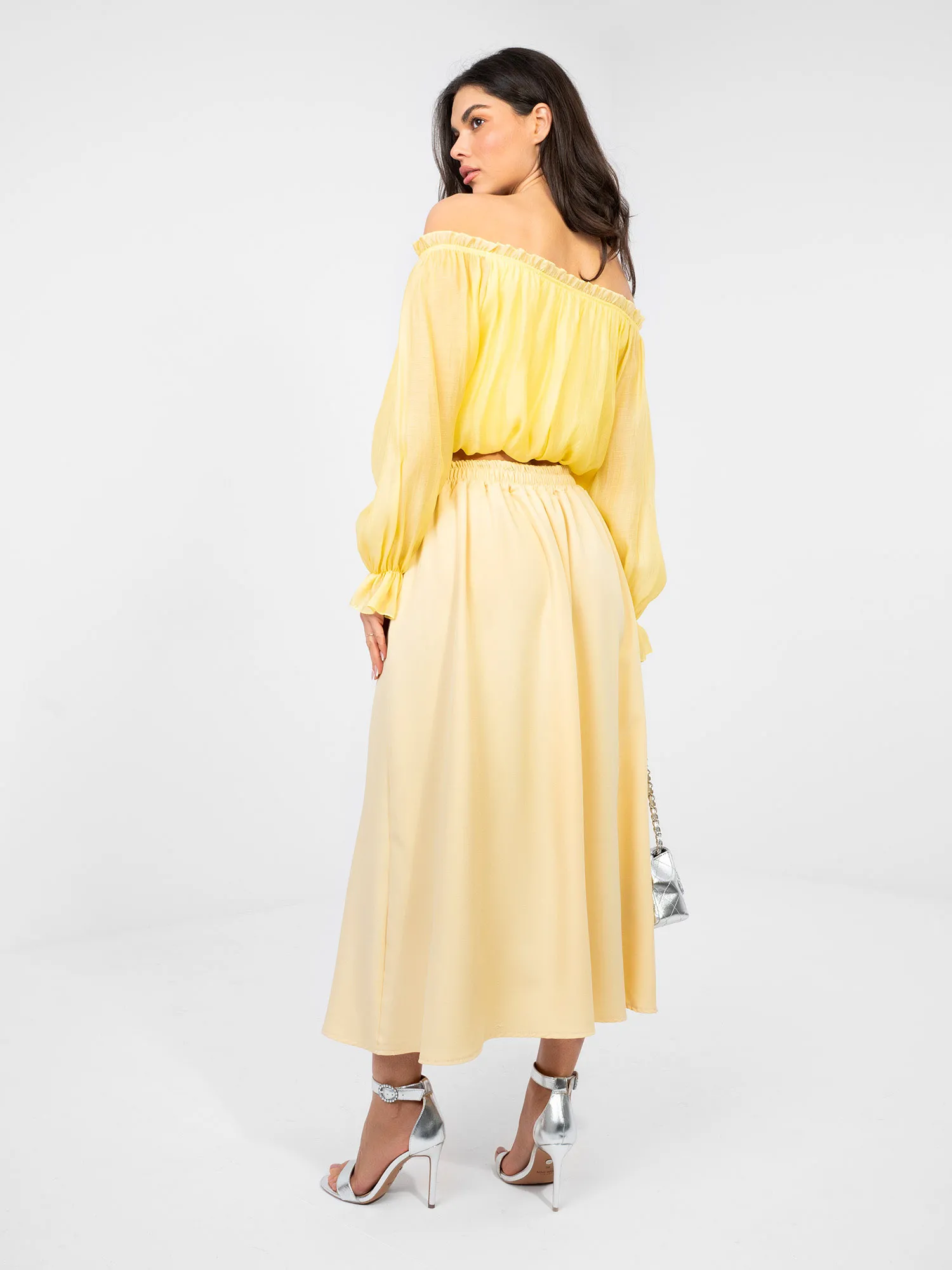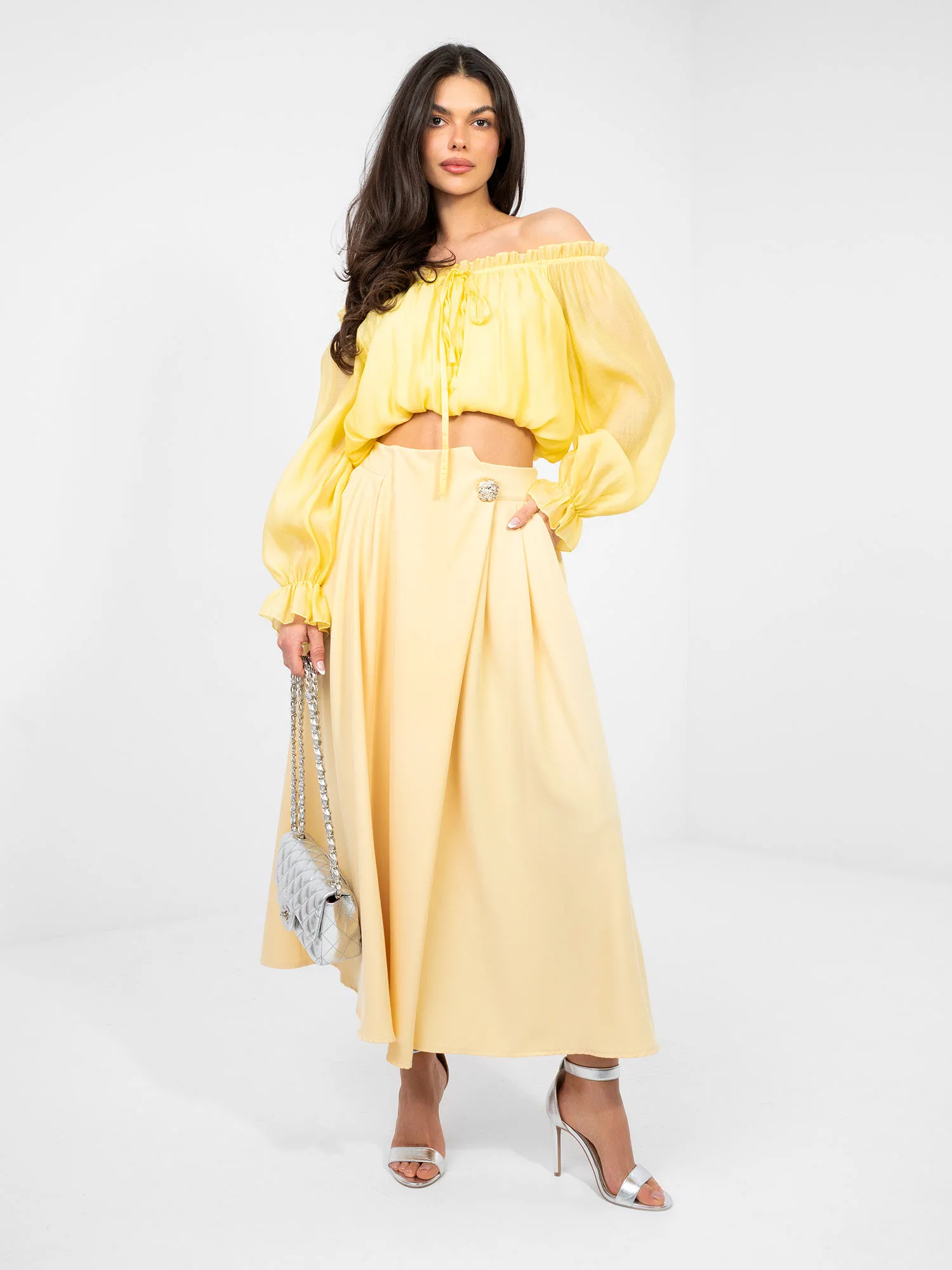 - Modelis dėvi vieno dydžio dydį. Modelio išmatavimai: ūgis 173 cm, krūtinė 85 cm, juosmuo 62 cm, klubai 95 cm
