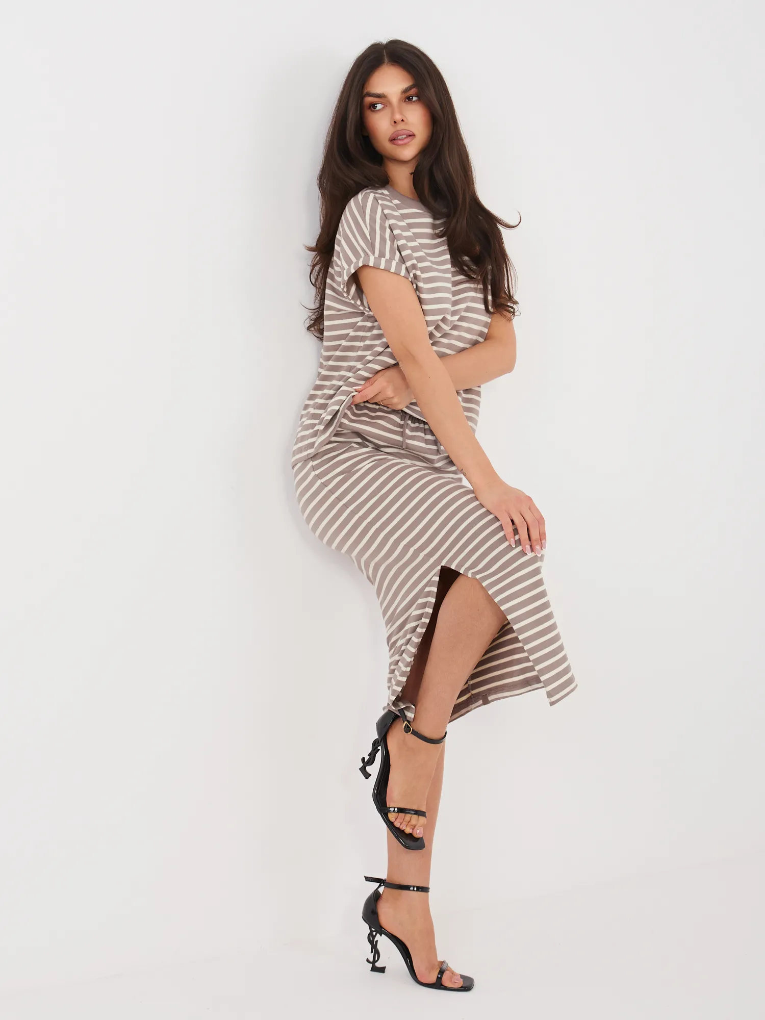 Modelis dėvi S dydį. Modelio išmatavimai: ūgis 173 cm, krūtinė 85 cm, juosmuo 62 cm, klubai 95 cm