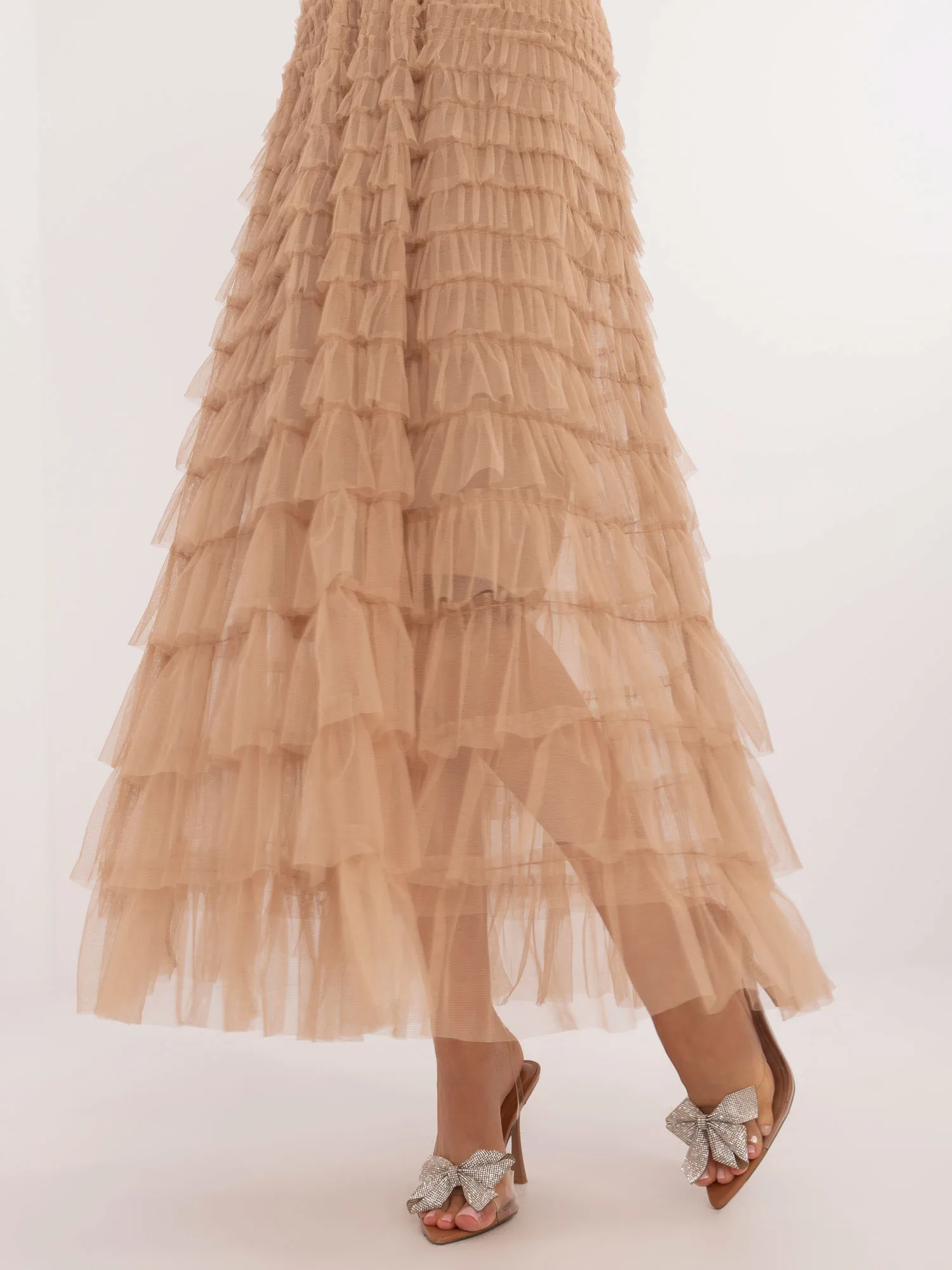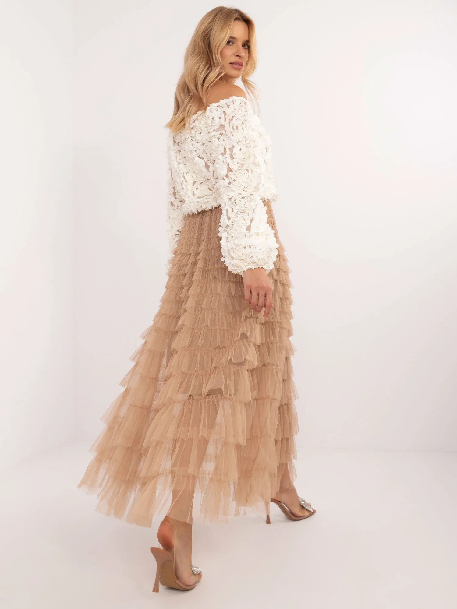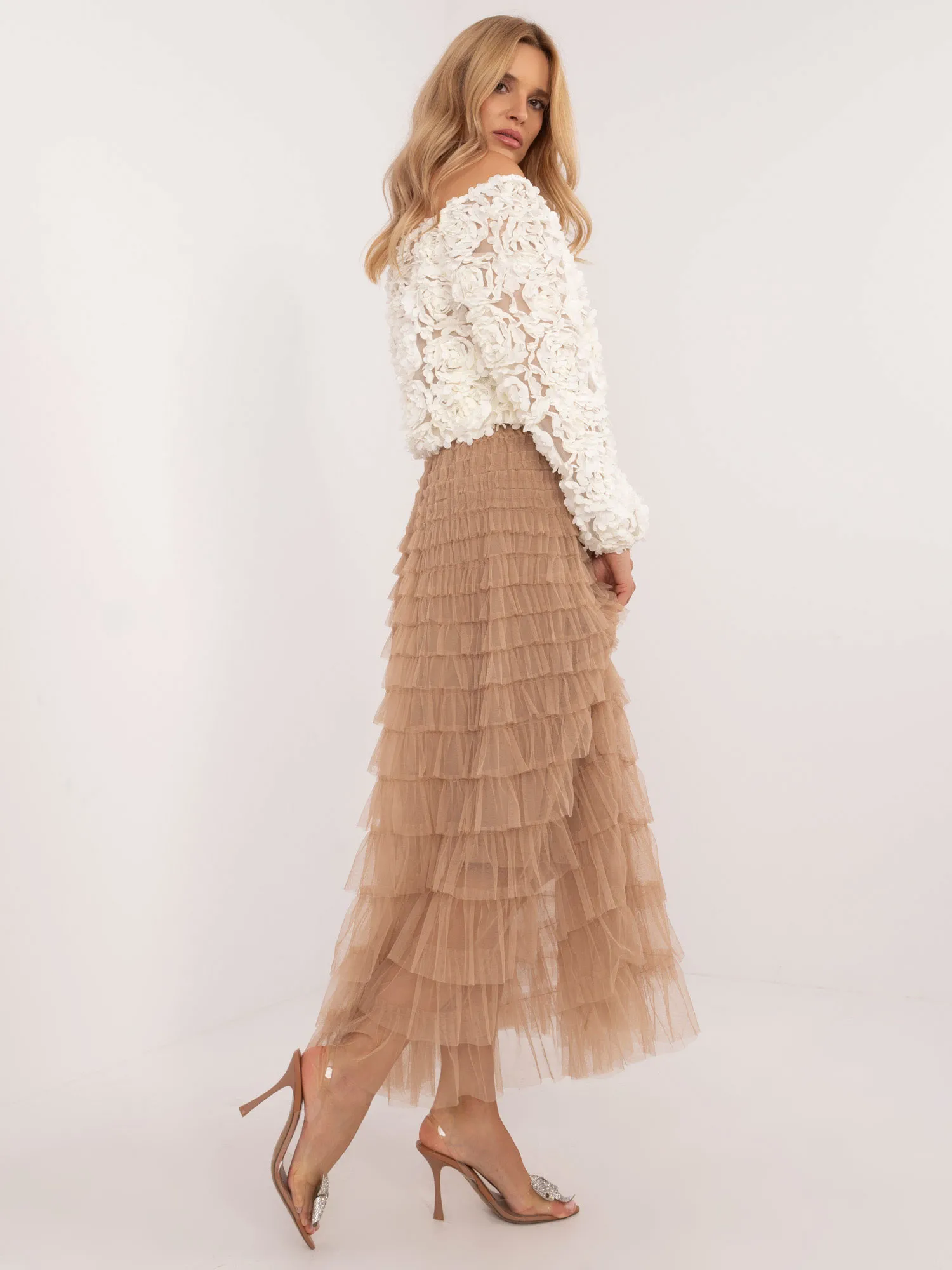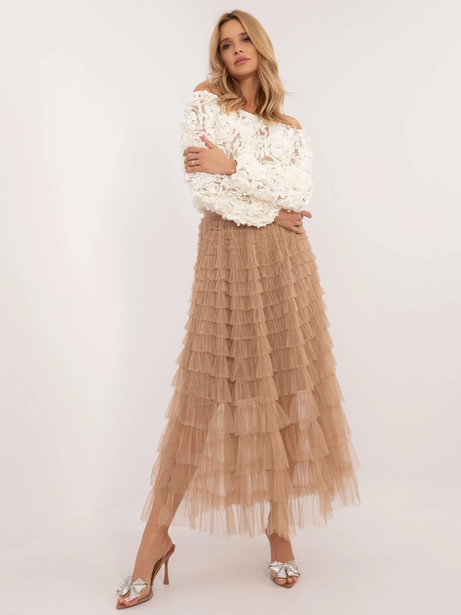 Wymiary spódnicy w rozmiarze one size: szerokość w pasie - 33 cm (na płasko), szerokość w pasie - 50 cm (po rozciągnięciu), długość całkowita - 99 cm.