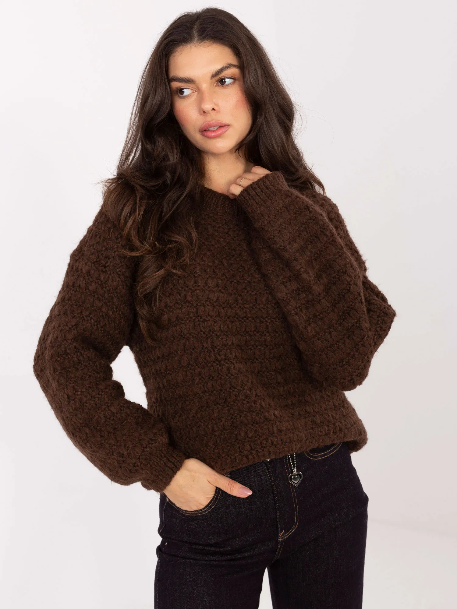 Wymiary swetra w rozmiarze one size mierzone na płasko: szerokość pod pachami - 55 cm, szerokość w biodrach - 51 cm, długość rękawa - 48 cm, długość całkowita - 62 cm.