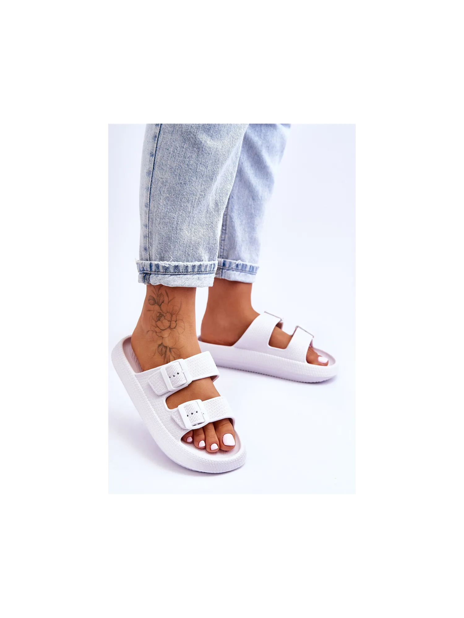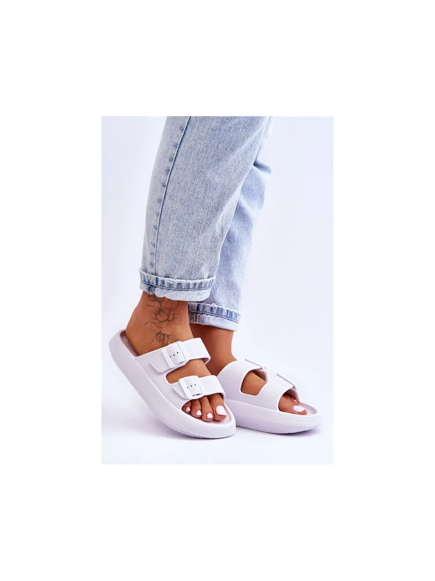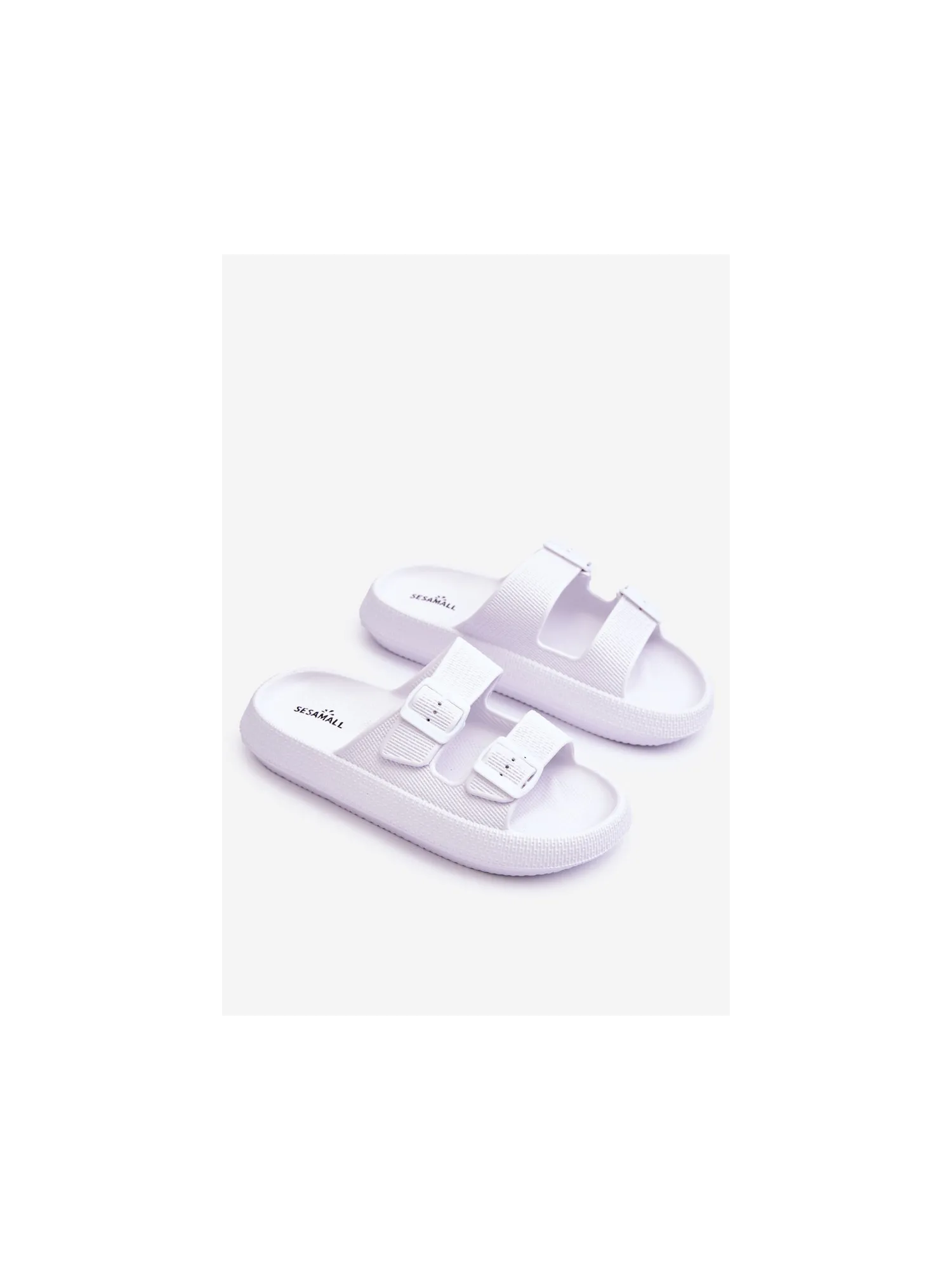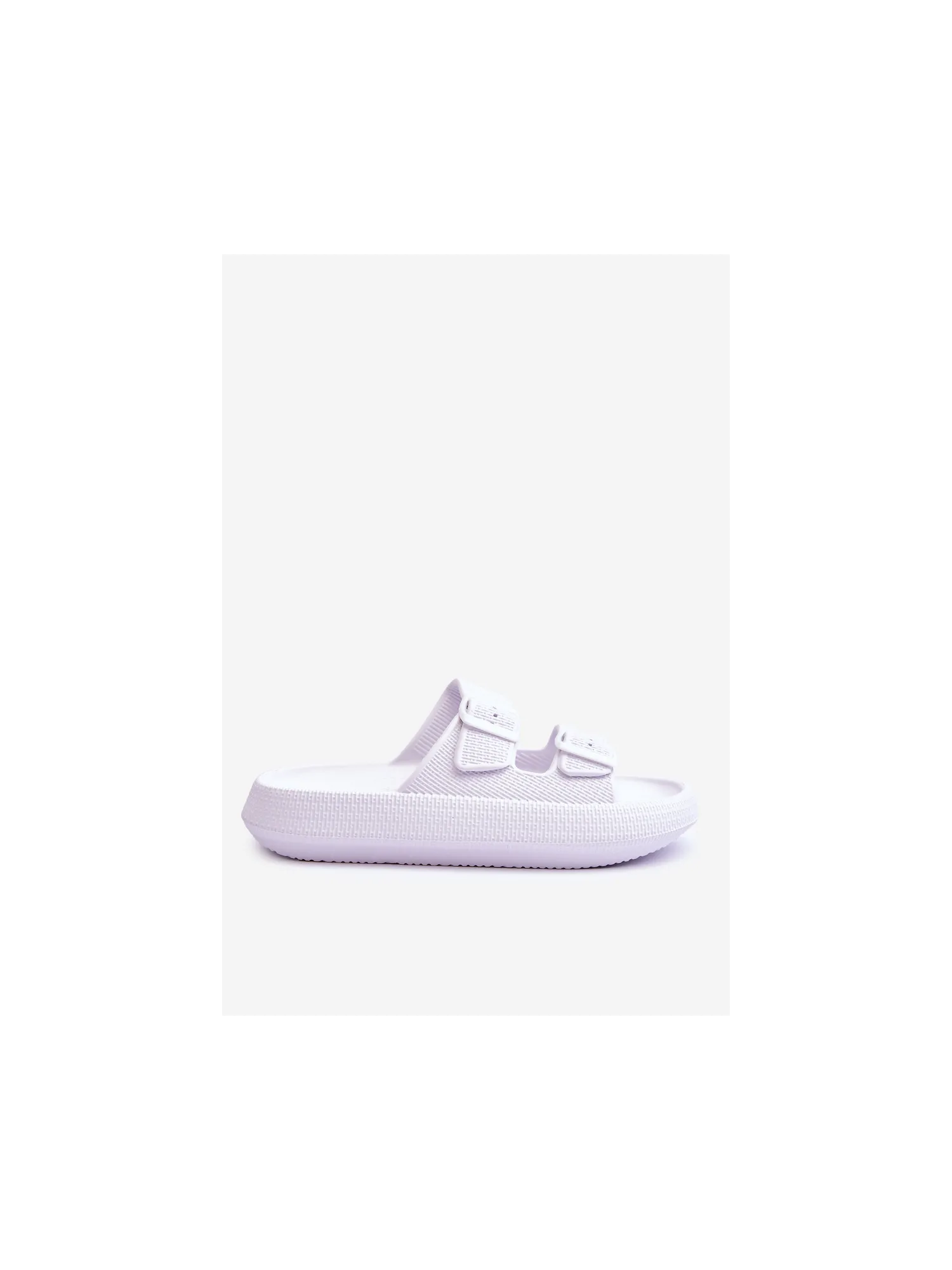 Classic, women's slippers are made entirely of foam material. They have plastic buckles with adjustable straps. This model was mounted on a massive platform. Perfect footwear for the summer season. These slippers are extremely airy and comfortable. They are also great for the pool or beach. When choosing a size, please refer to the size chart.