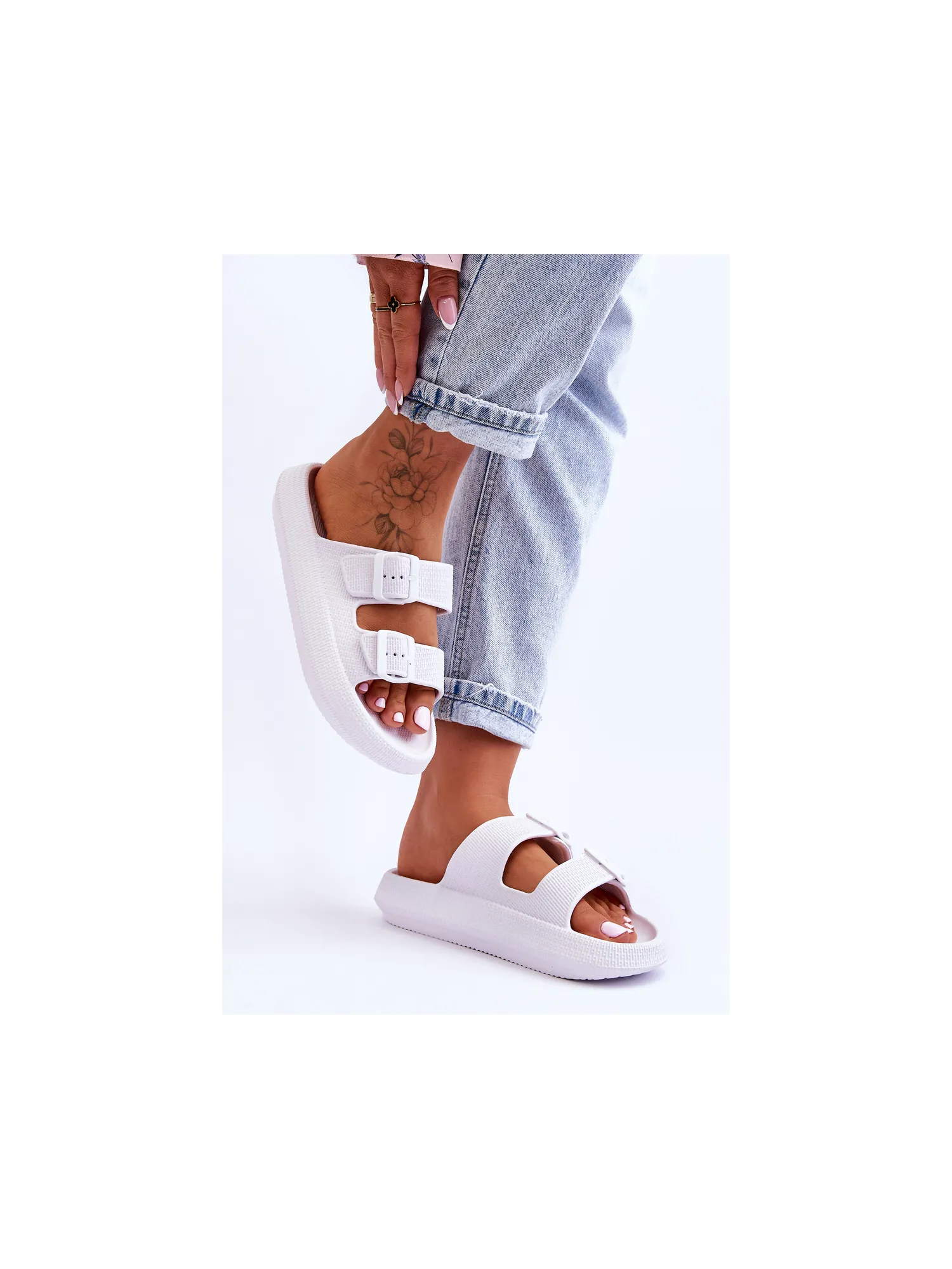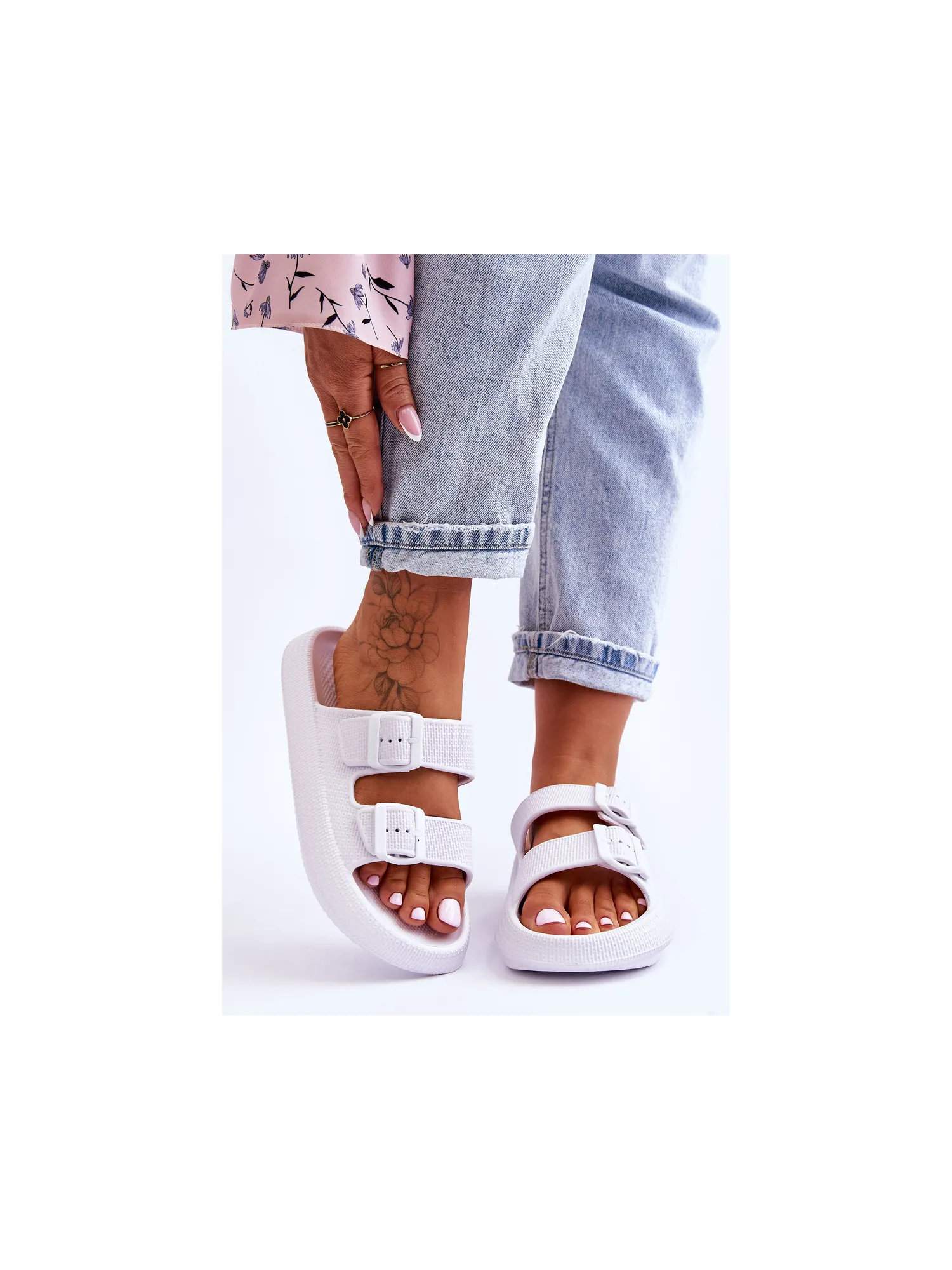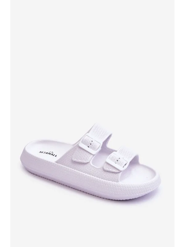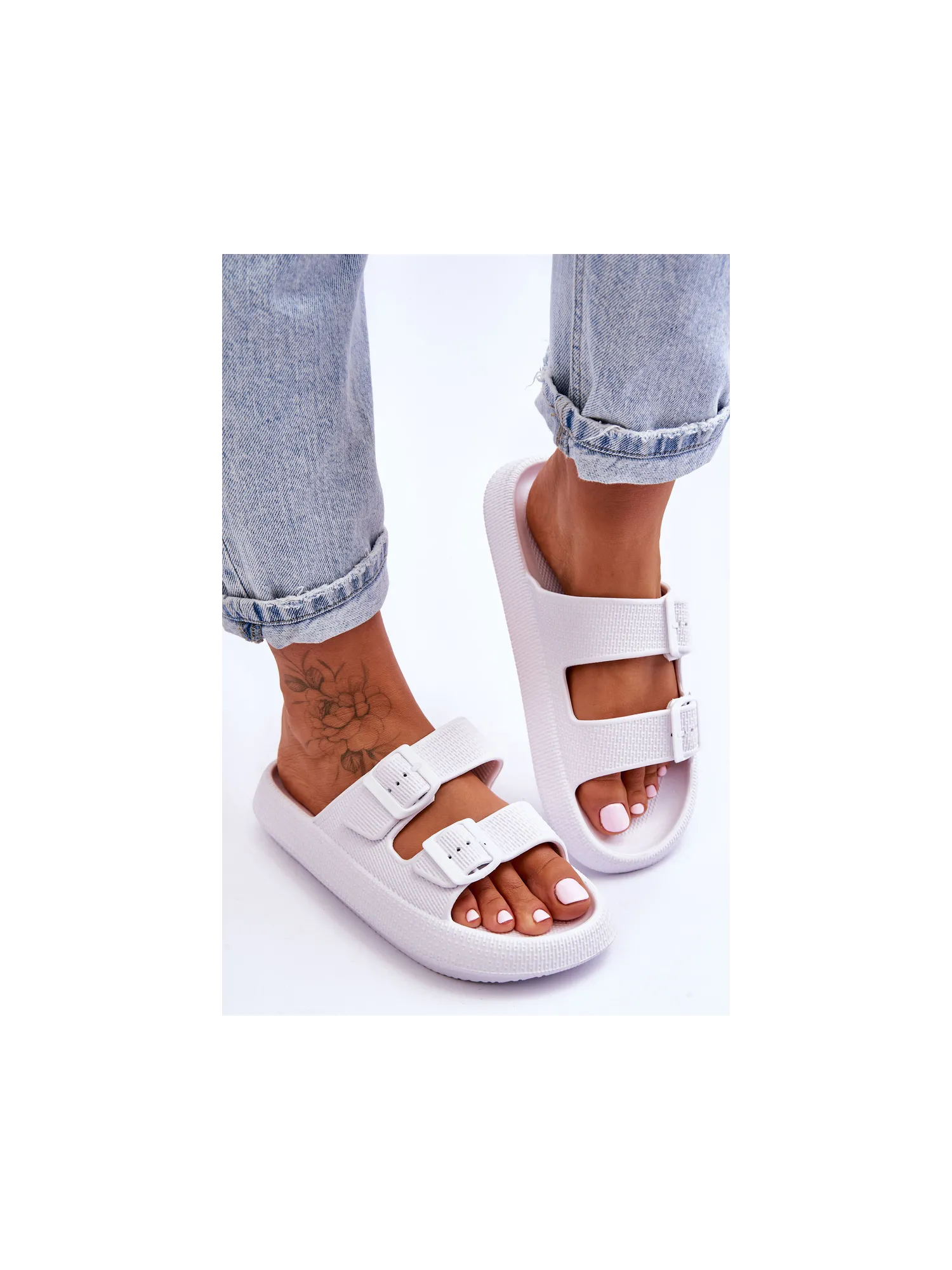 Classic, women's slippers are made entirely of foam material. They have plastic buckles with adjustable straps. This model was mounted on a massive platform. Perfect footwear for the summer season. These slippers are extremely airy and comfortable. They are also great for the pool or beach. When choosing a size, please refer to the size chart.