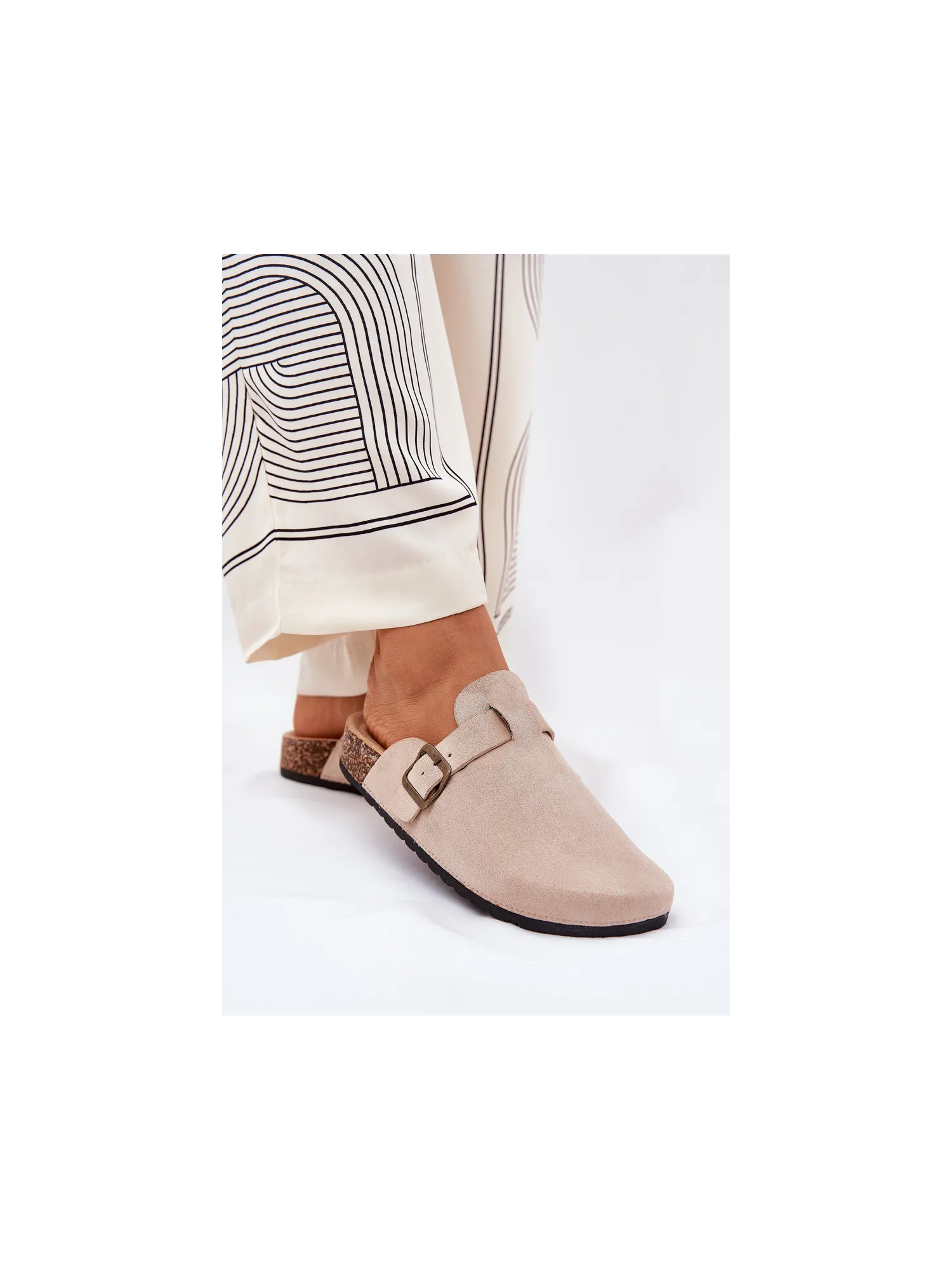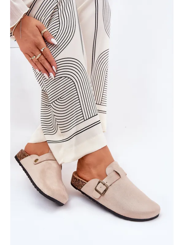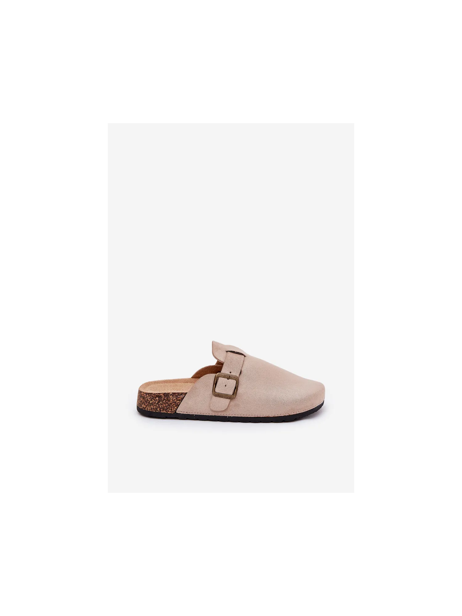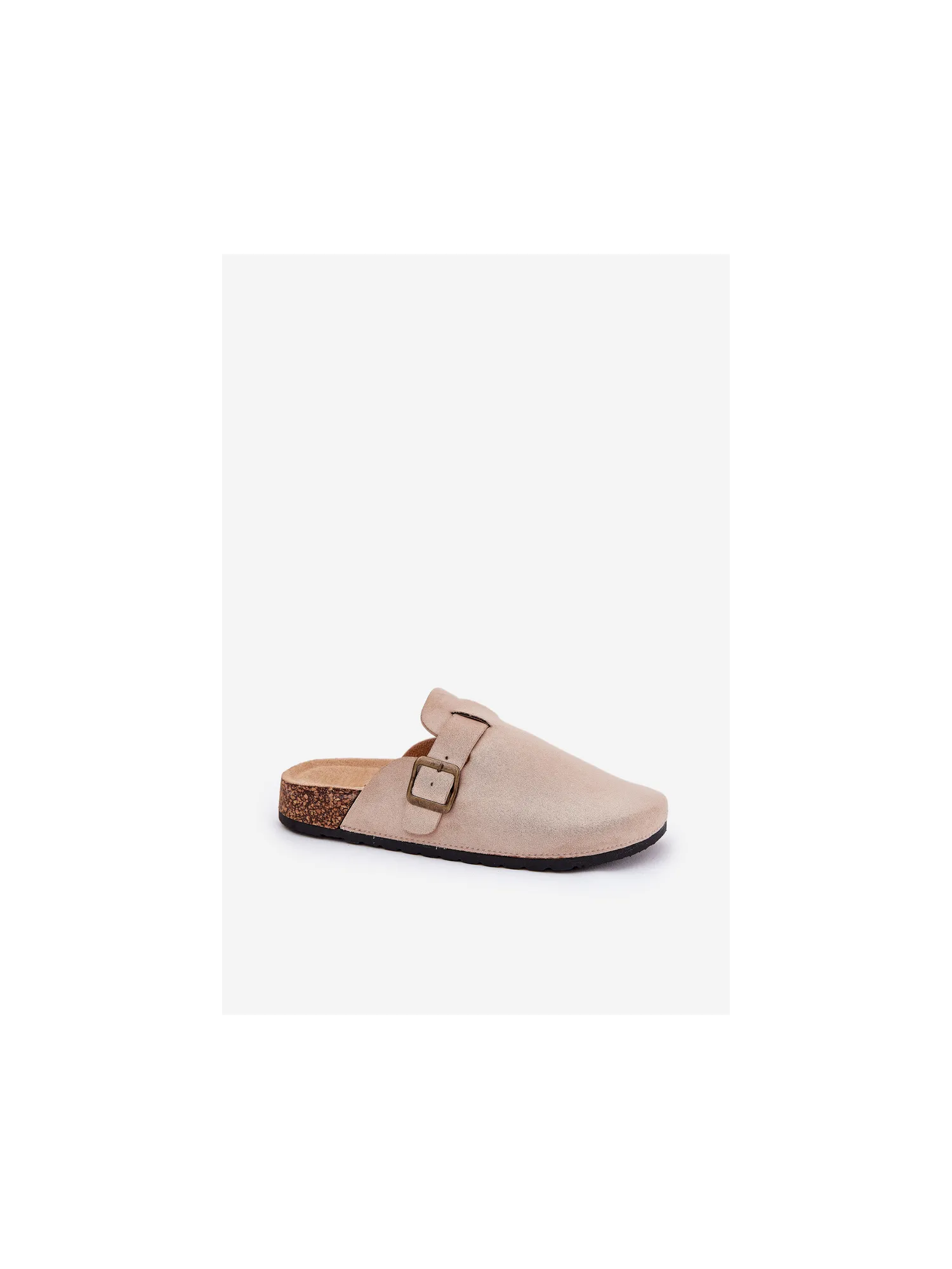 Women's clogs on a cork platform. Made of eco suede. The closed toes provide greater protection, while the buckle allows for a perfect fit. The contoured insole guarantees comfort all day long, providing the right support. These clogs will be an excellent choice for everyday wear, perfect for casual styles, offering comfort and a fashionable look. When choosing a size, please refer to the size chart.