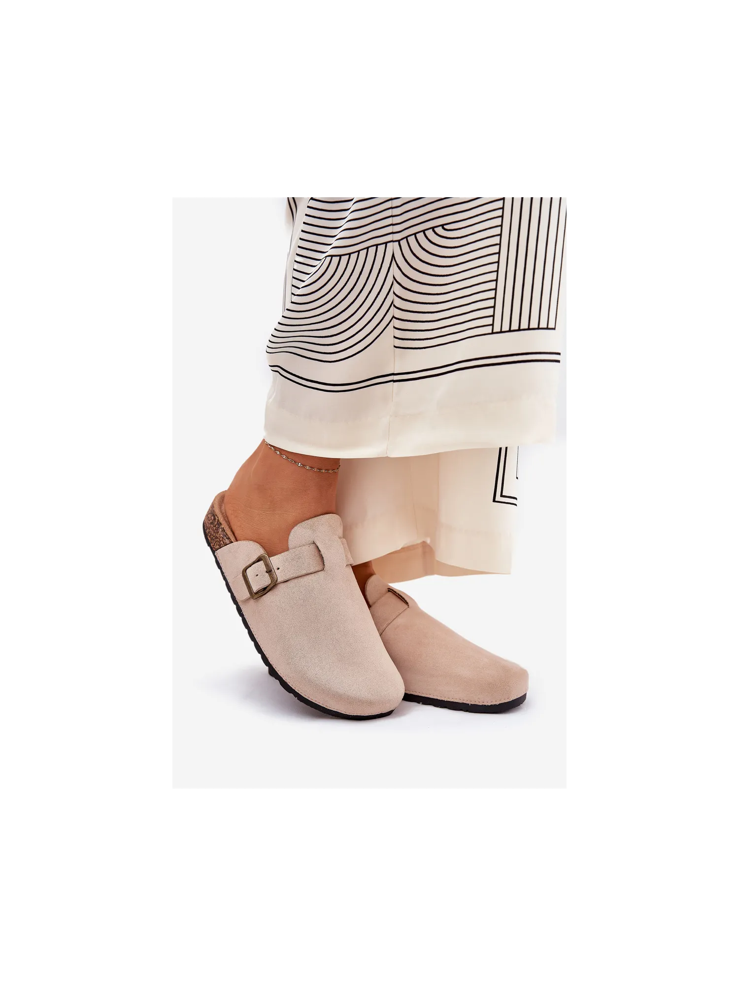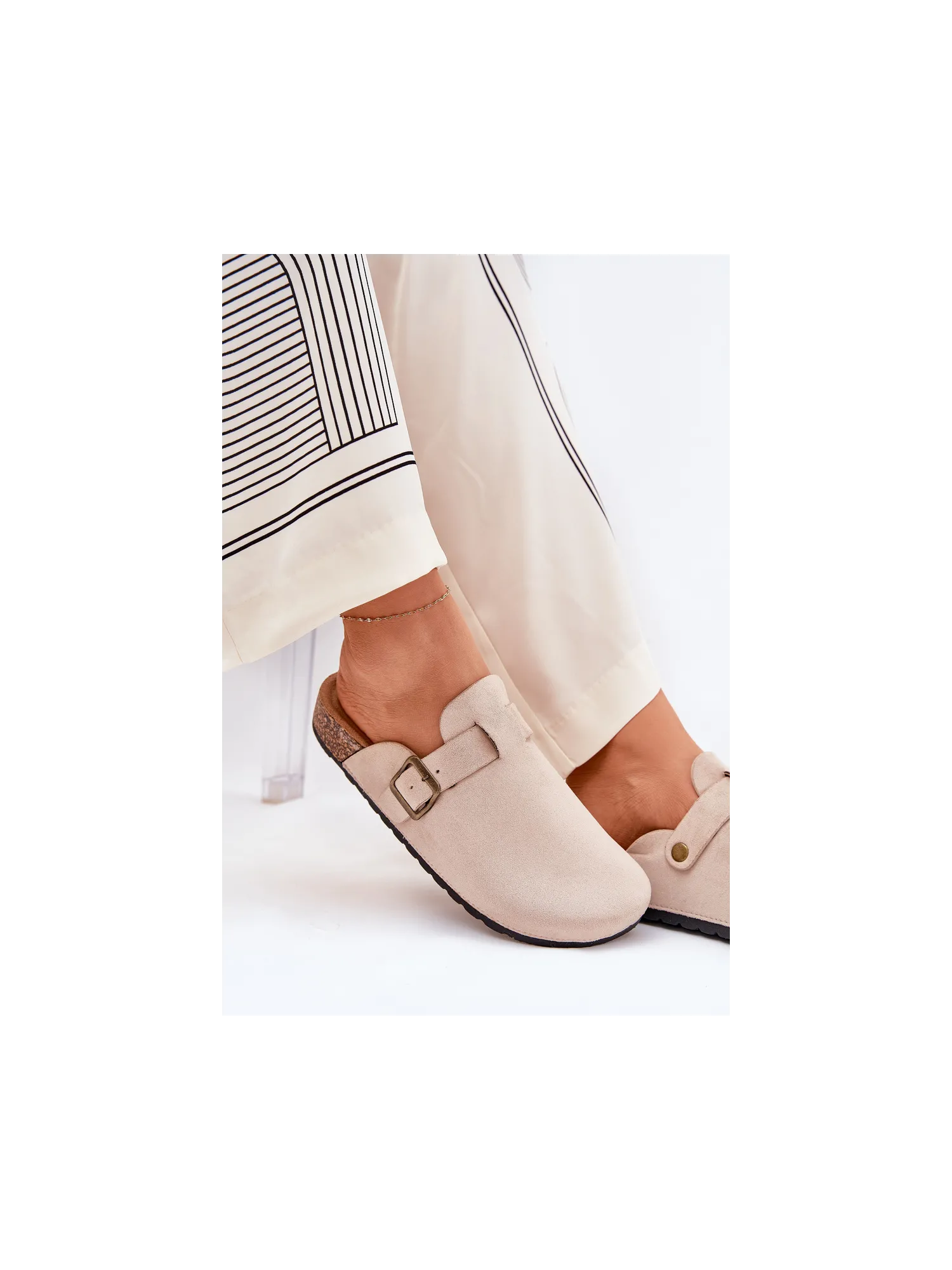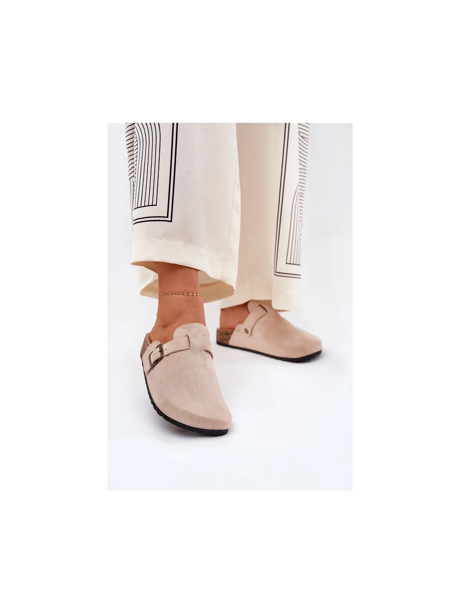 Women's clogs on a cork platform. Made of eco suede. The closed toes provide greater protection, while the buckle allows for a perfect fit. The contoured insole guarantees comfort all day long, providing the right support. These clogs will be an excellent choice for everyday wear, perfect for casual styles, offering comfort and a fashionable look. When choosing a size, please refer to the size chart.