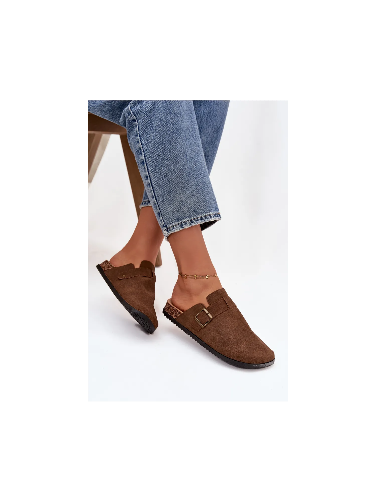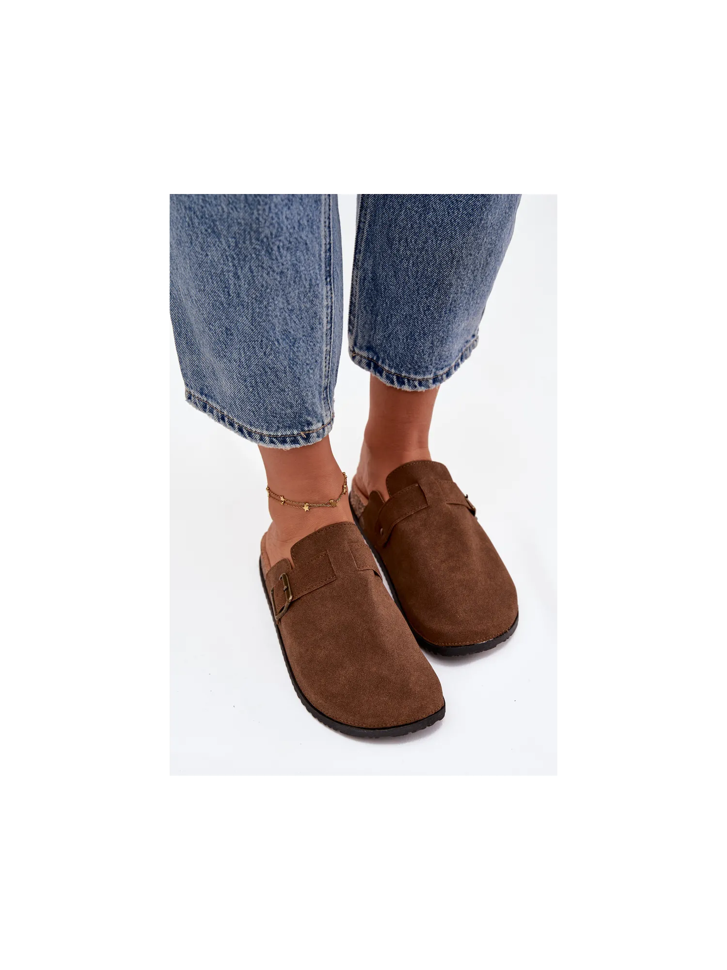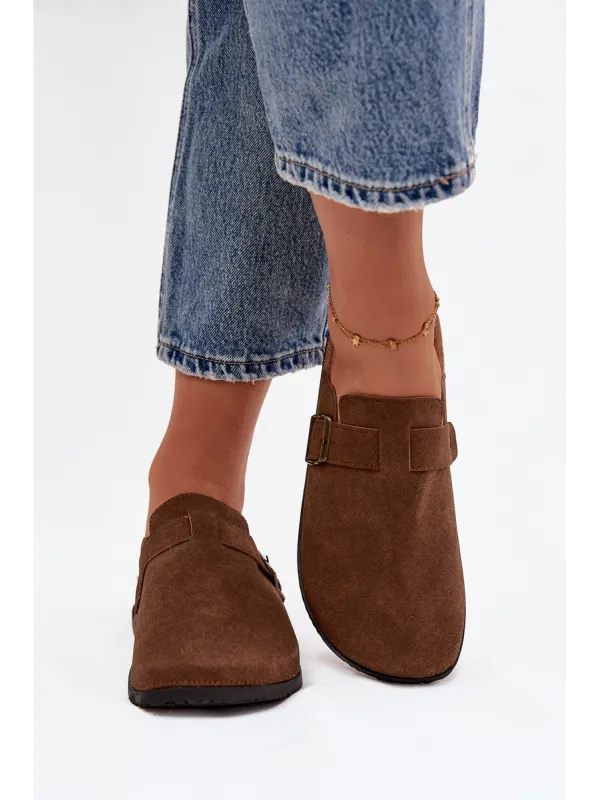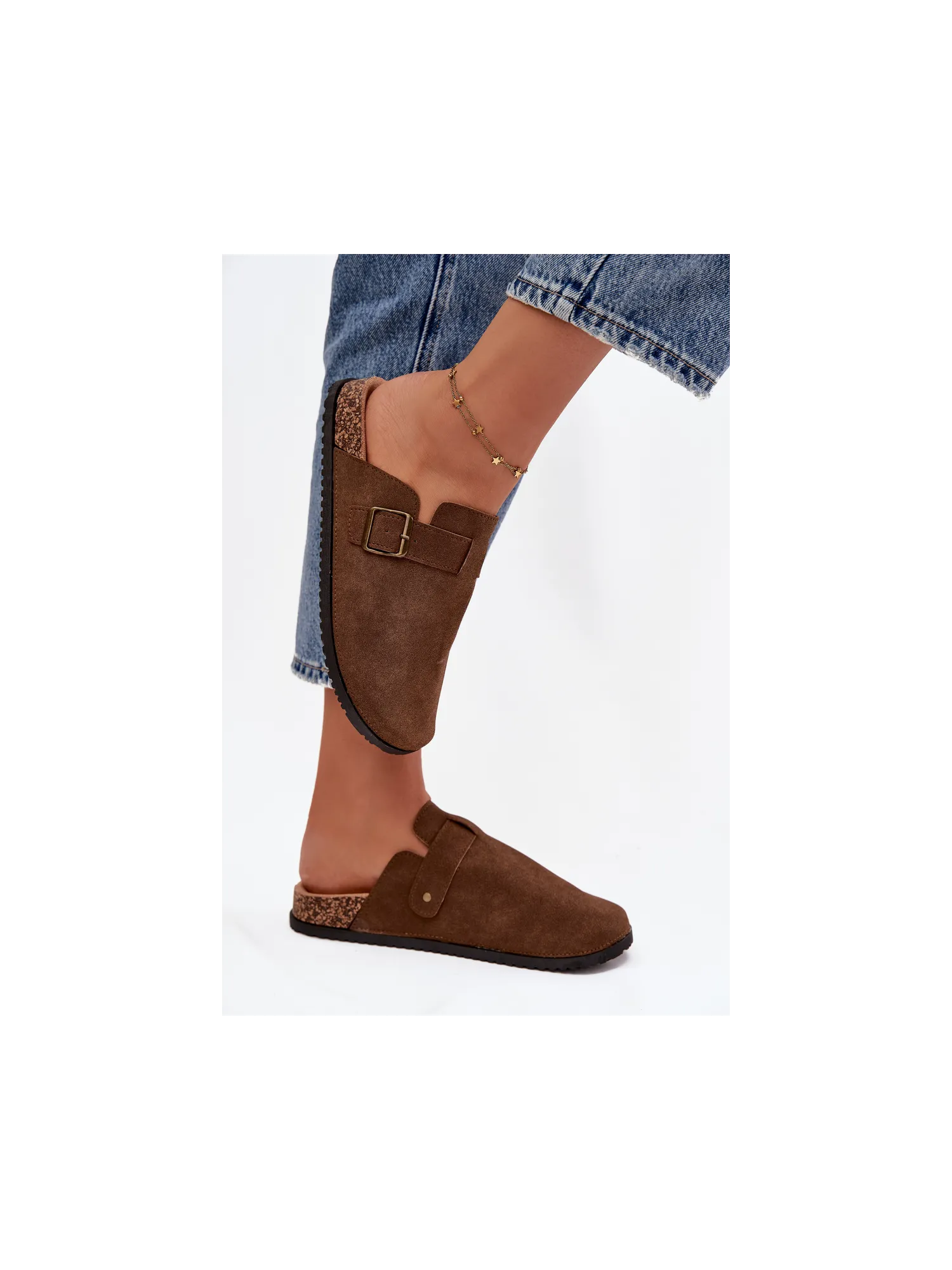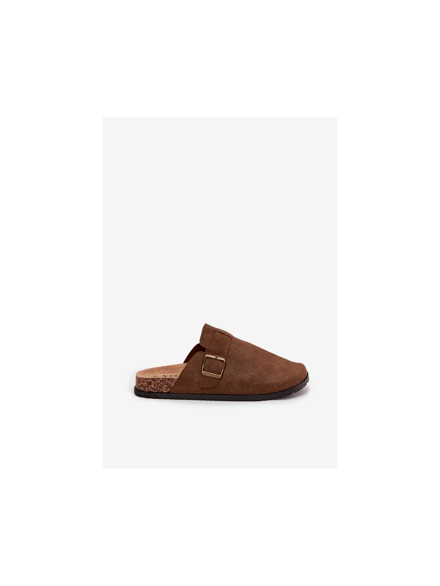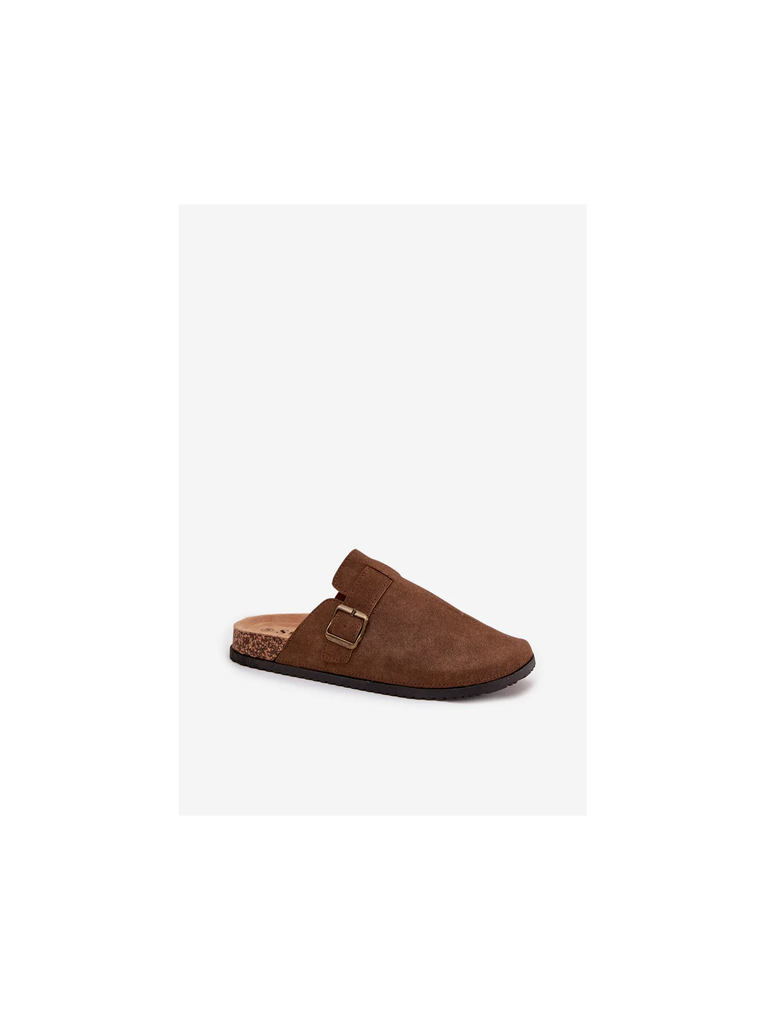 Women's clogs on a cork platform. Made of eco suede. The closed toes provide greater protection, while the buckle allows for a perfect fit. The contoured insole guarantees comfort all day long, providing the right support. These clogs will be an excellent choice for everyday wear, perfect for casual styles, offering comfort and a fashionable look. When choosing a size, please refer to the size chart.