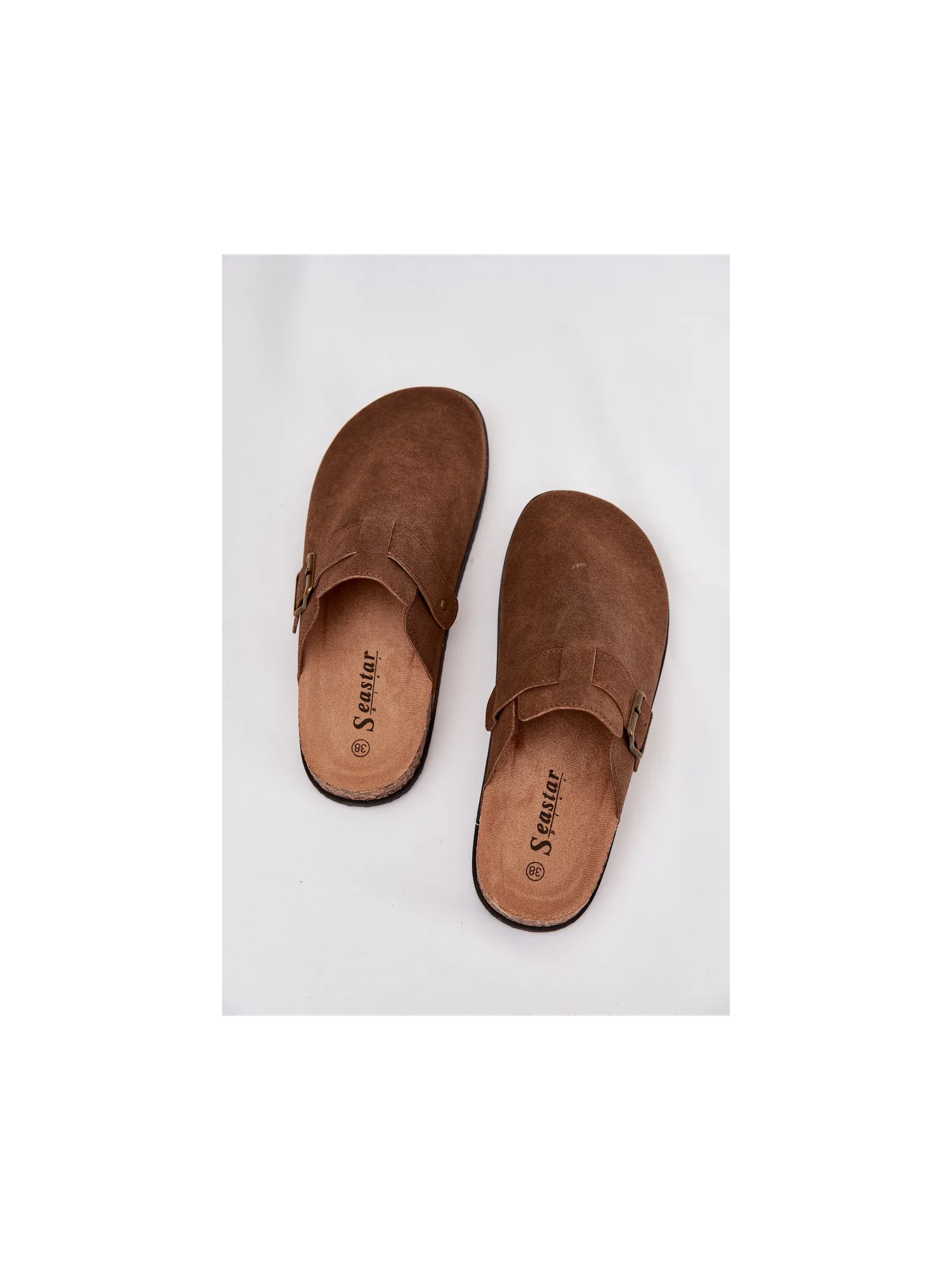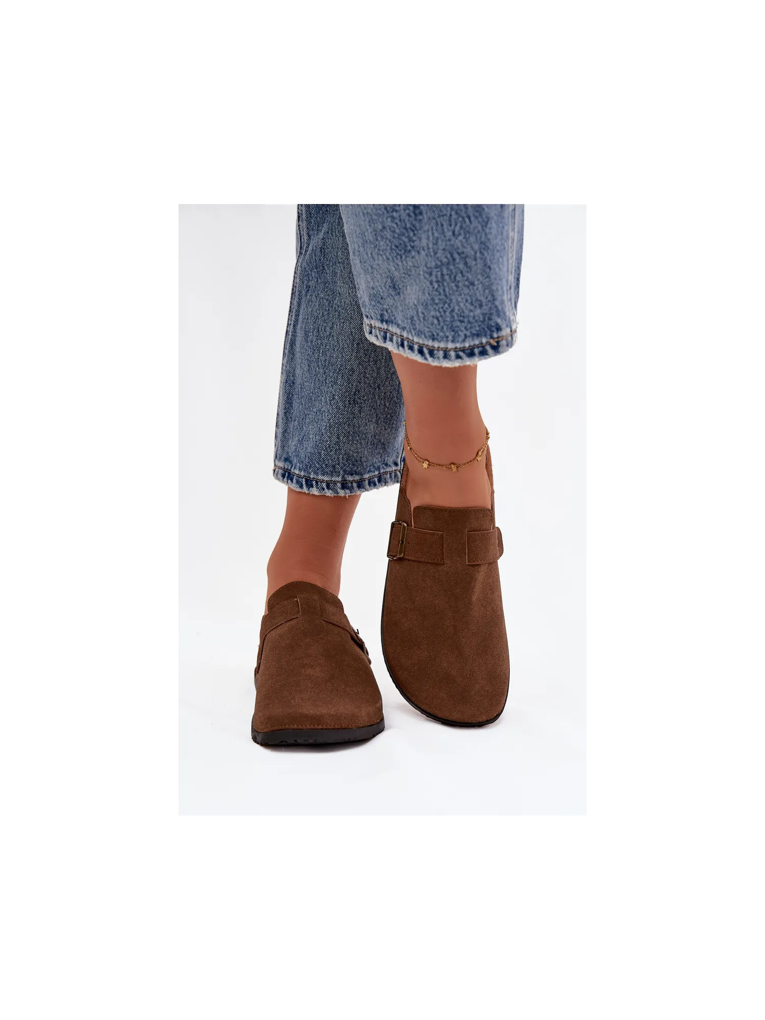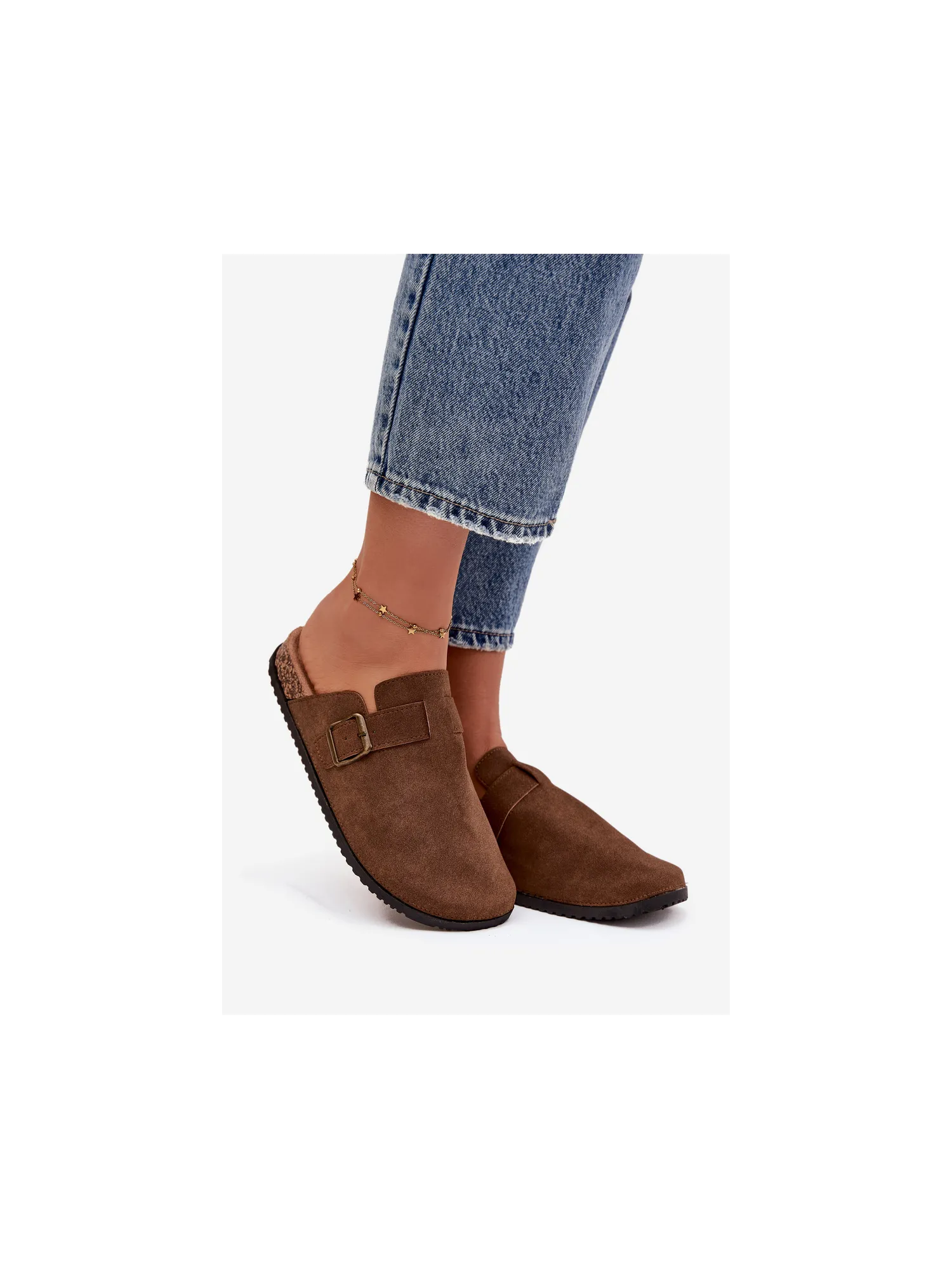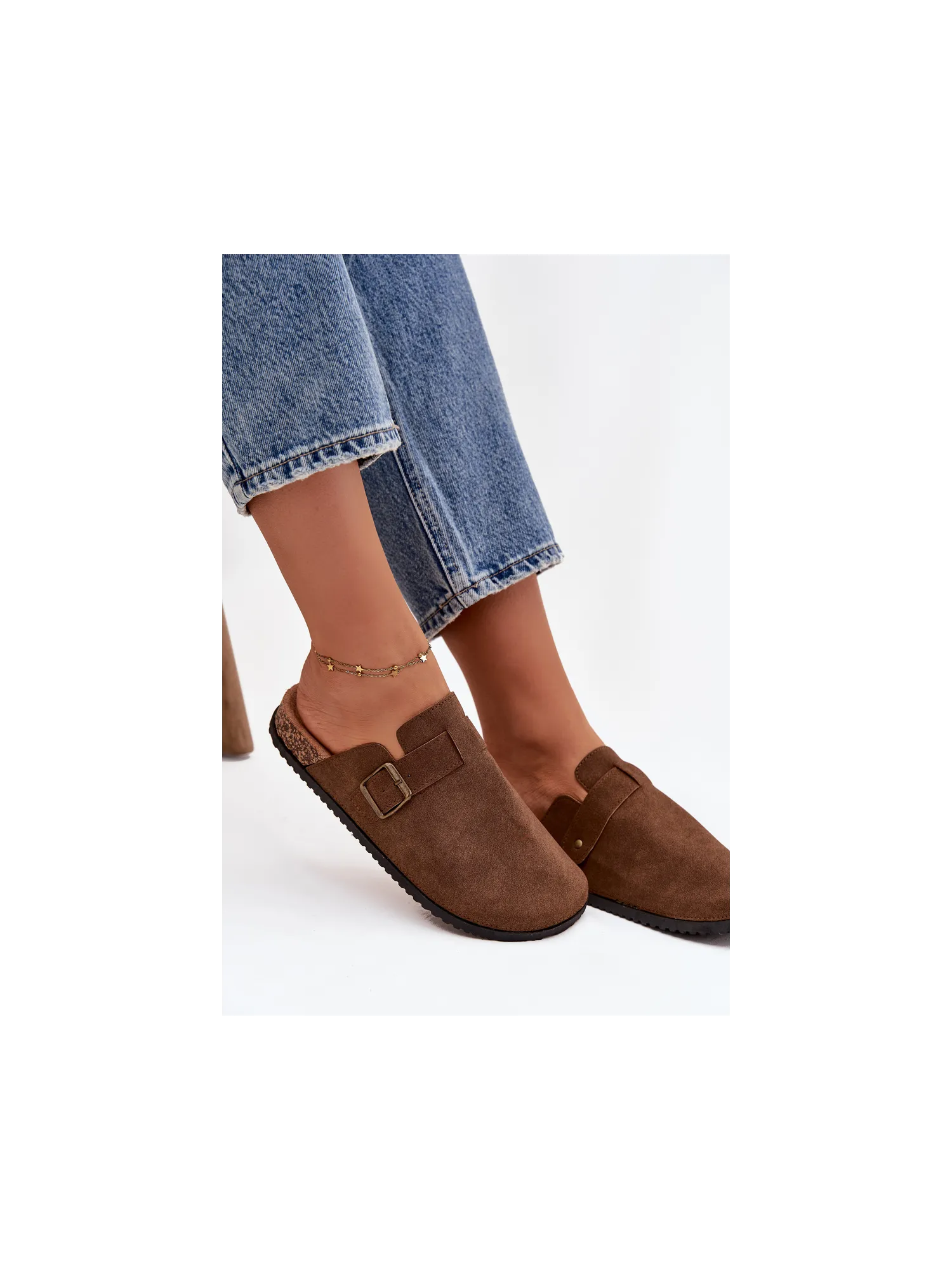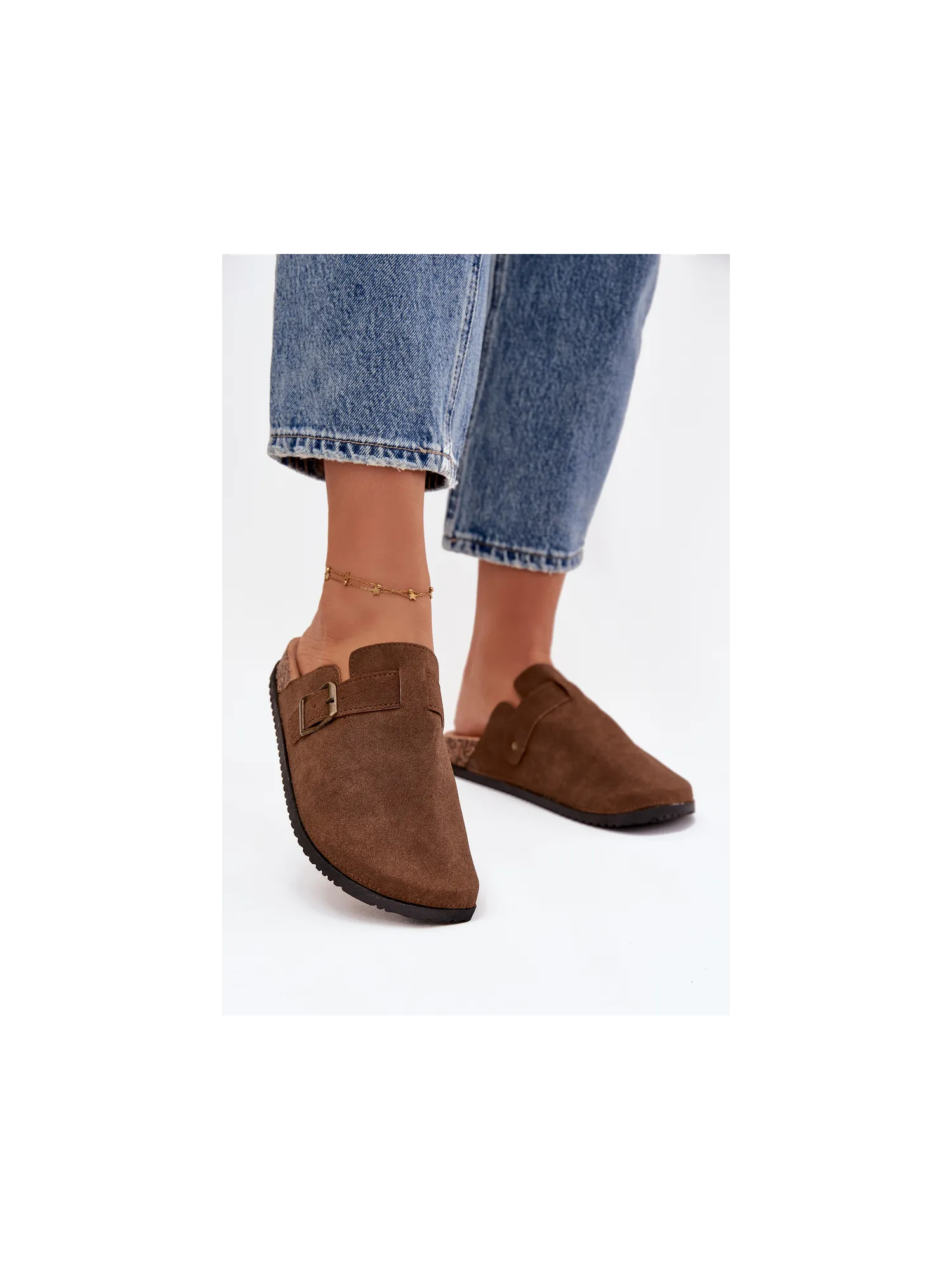 Women's clogs on a cork platform. Made of eco suede. The closed toes provide greater protection, while the buckle allows for a perfect fit. The contoured insole guarantees comfort all day long, providing the right support. These clogs will be an excellent choice for everyday wear, perfect for casual styles, offering comfort and a fashionable look. When choosing a size, please refer to the size chart.