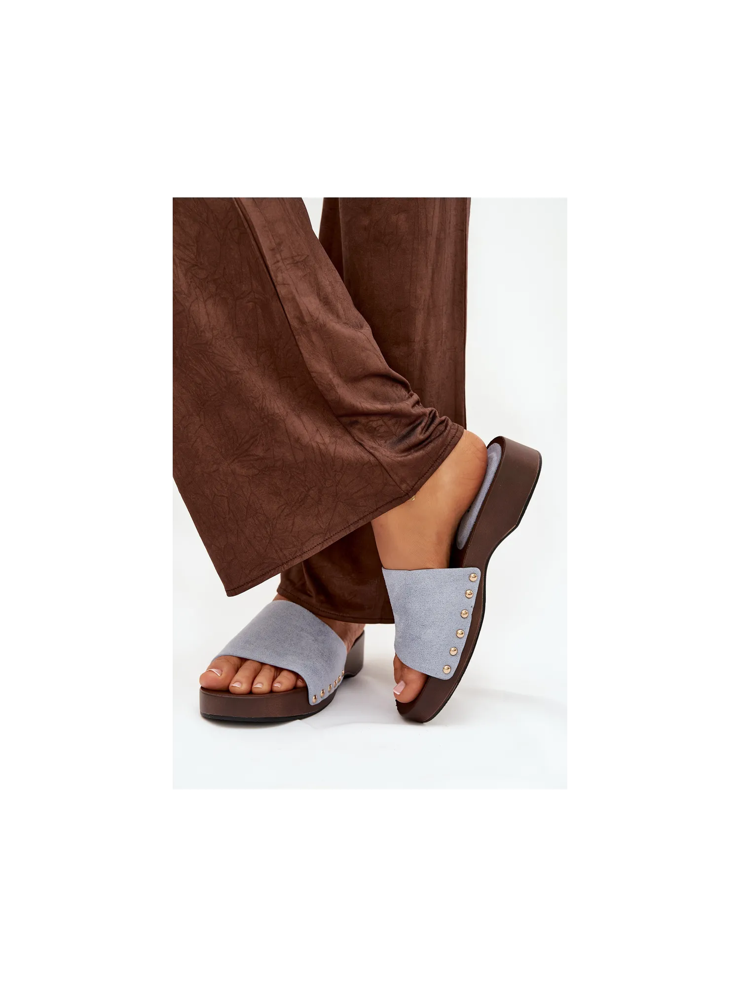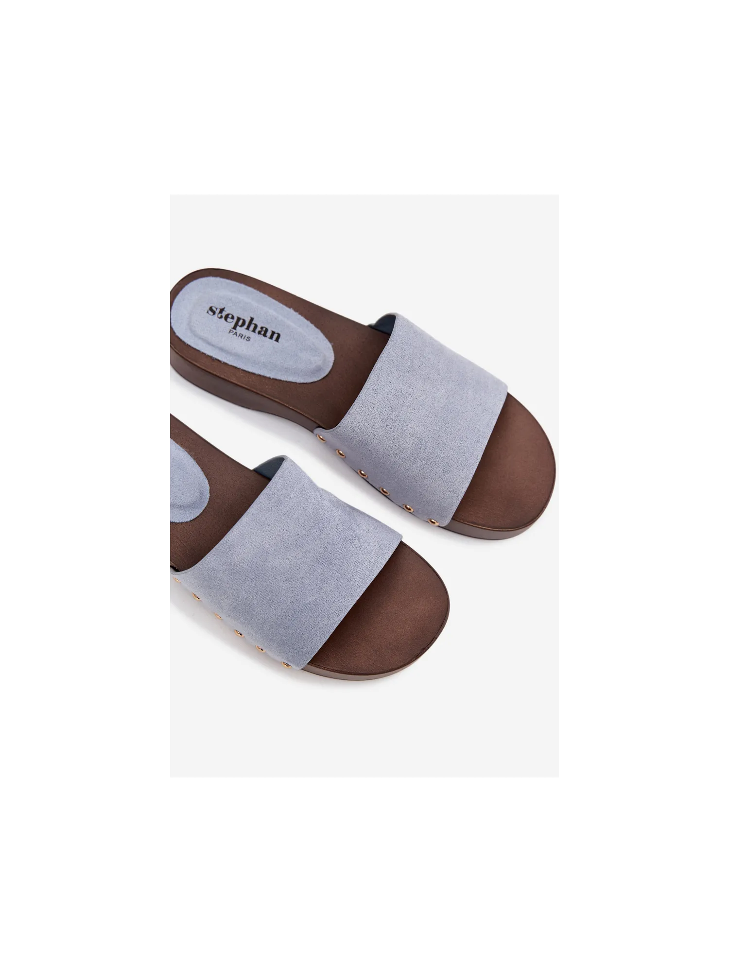 Stylish women's slip-ons made of eco suede are a comfortable and fashionable everyday choice. The delicate platform provides comfort and slightly elevates the silhouette, while also ensuring stability while walking. The side gold studs add a subtle accent. The model is perfect for daily styling – with jeans, dresses, or summer outfits. It is an ideal choice for women who value comfort combined with a fashionable detail. When choosing the size, please refer to the sizing chart. When choosing a size, please refer to the size chart.