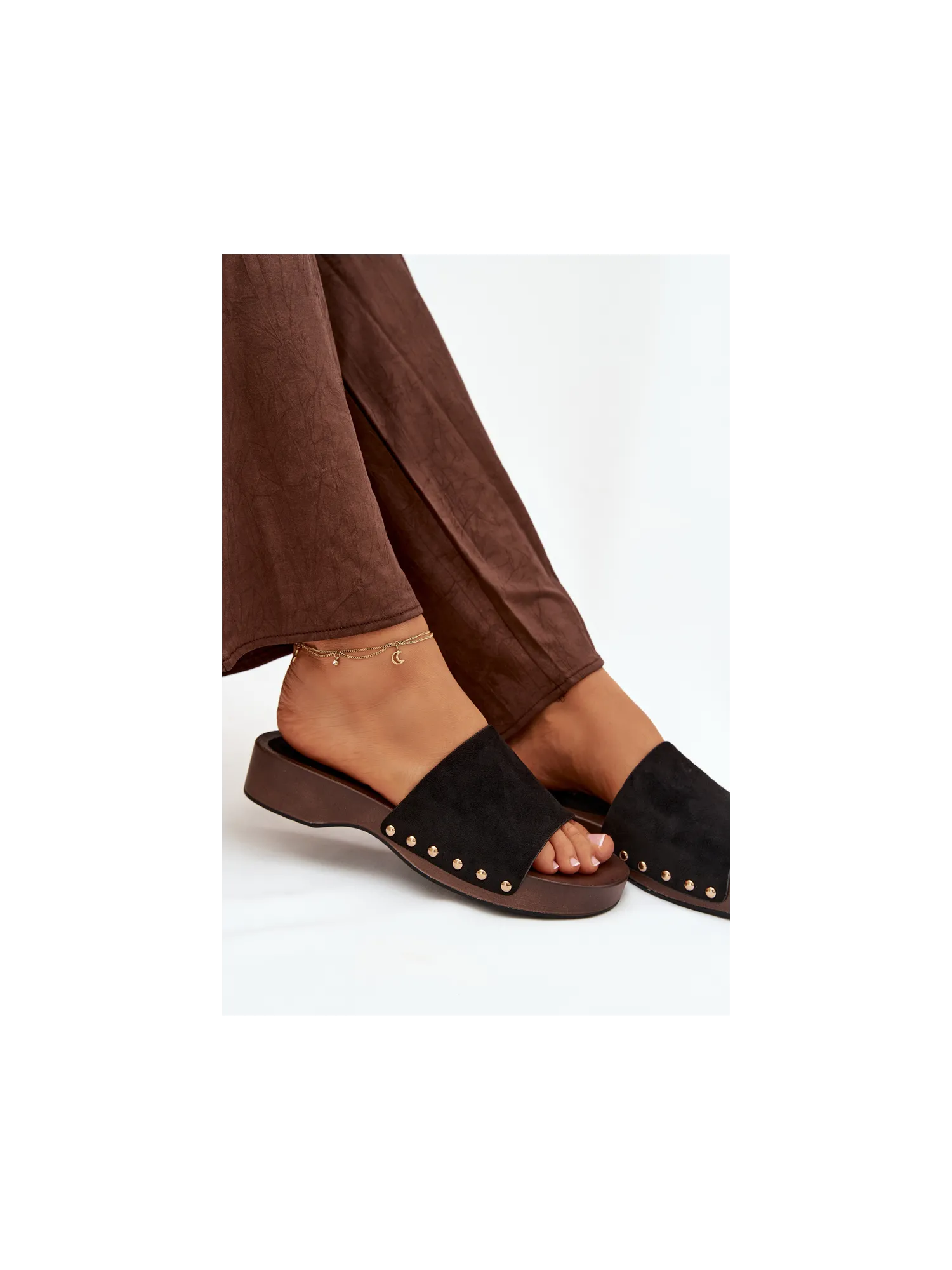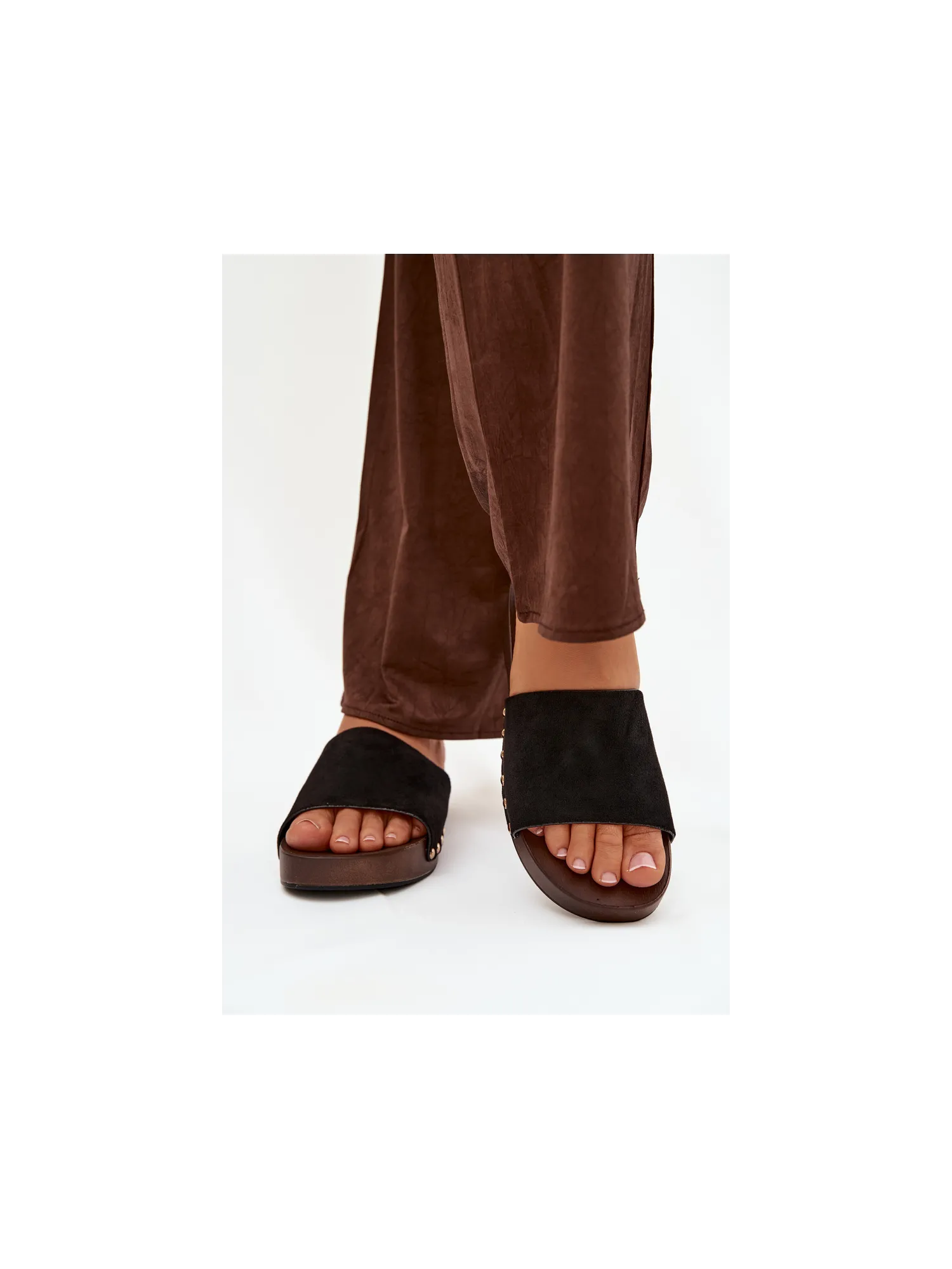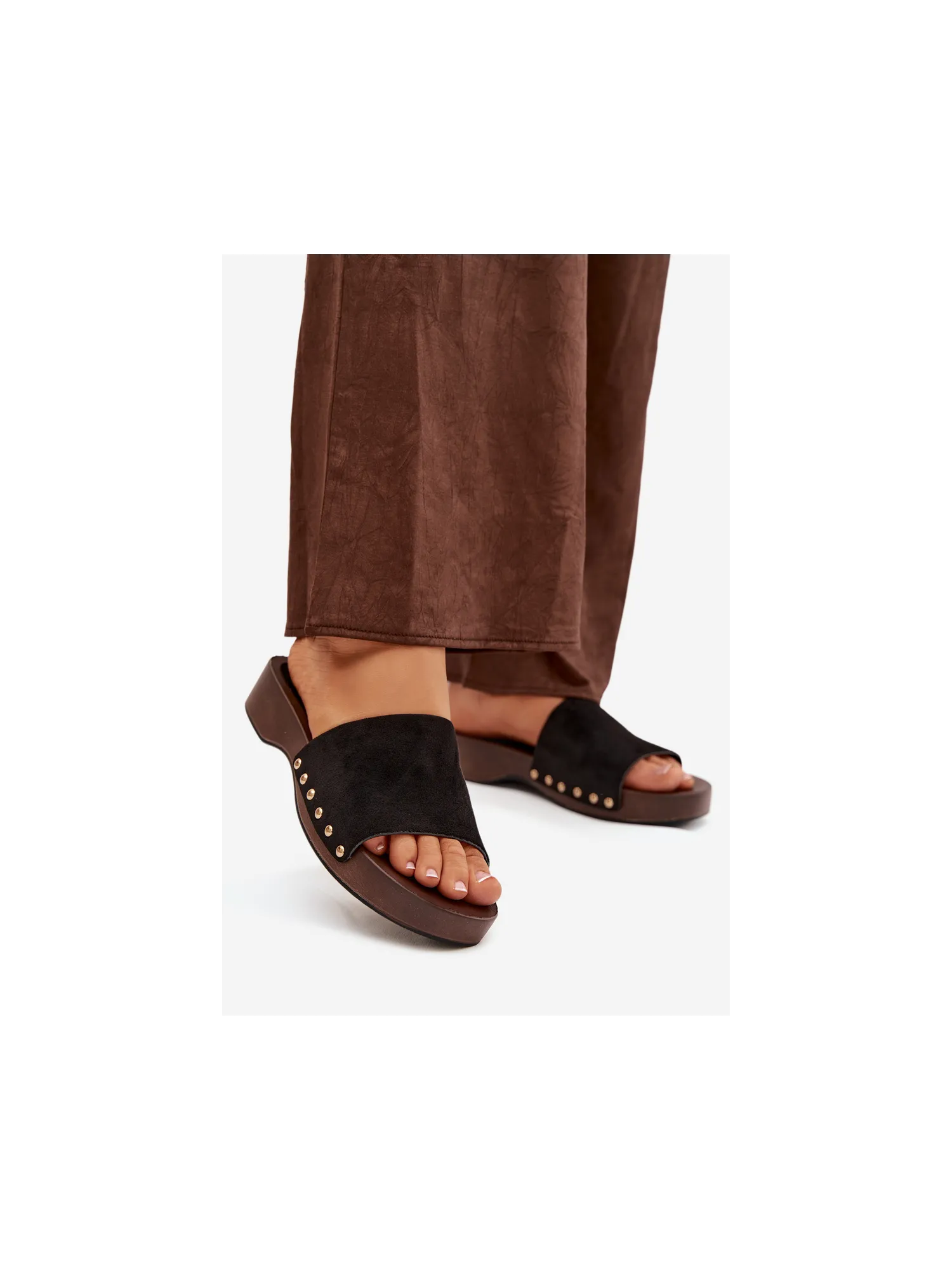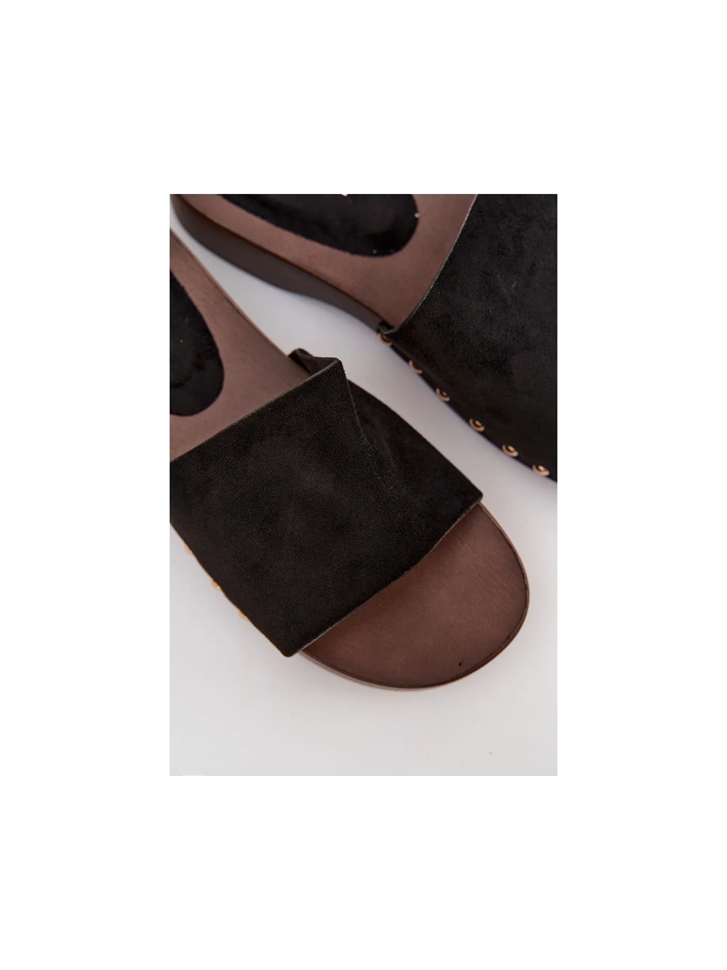 Stylish women's slip-ons made of eco suede are a comfortable and fashionable everyday choice. The delicate platform provides comfort and slightly elevates the silhouette, while also ensuring stability while walking. The side gold studs add a subtle accent. The model is perfect for daily styling – with jeans, dresses, or summer outfits. It is an ideal choice for women who value comfort combined with a fashionable detail. When choosing the size, please refer to the sizing chart. When choosing a size, please refer to the size chart.