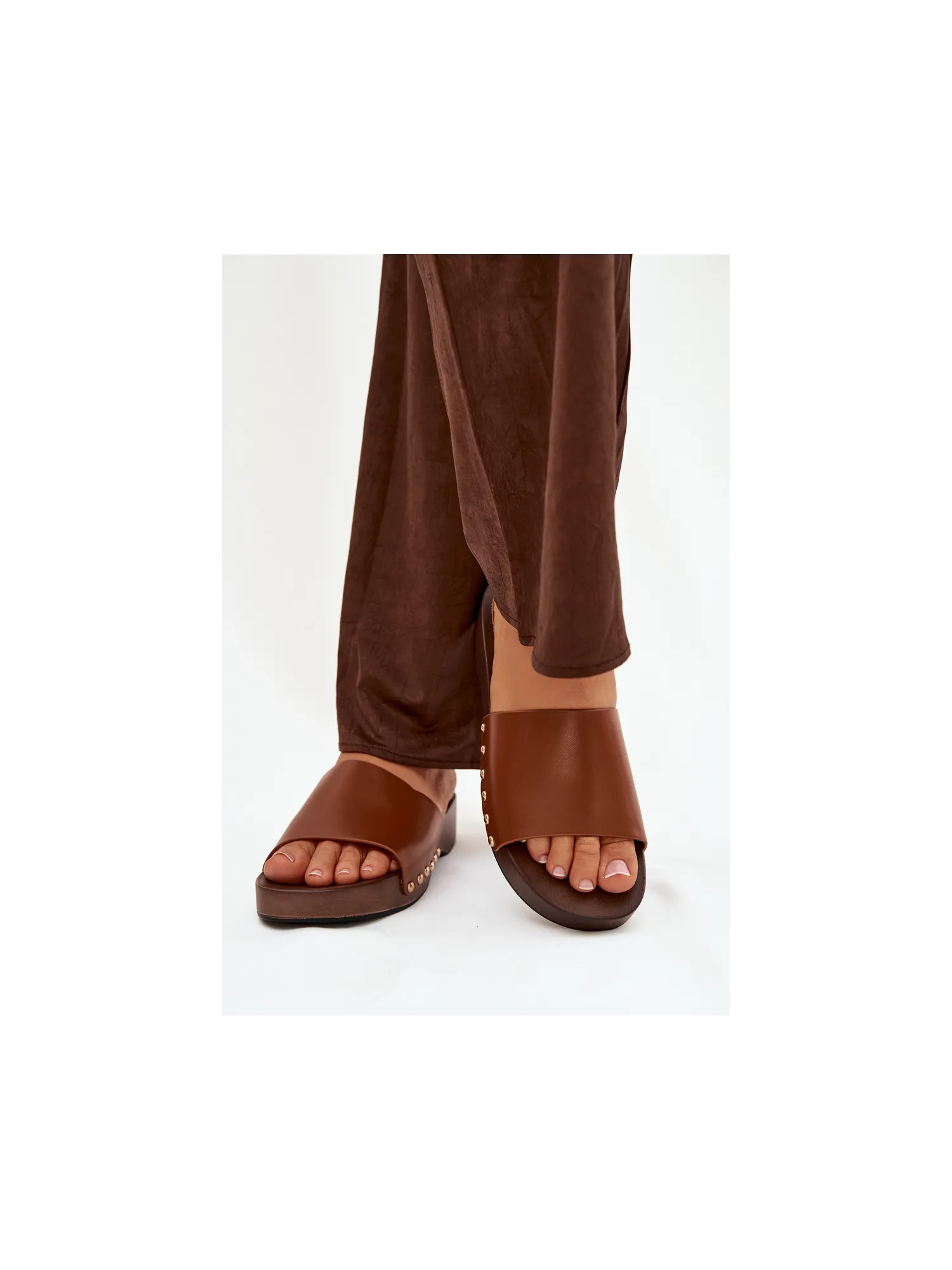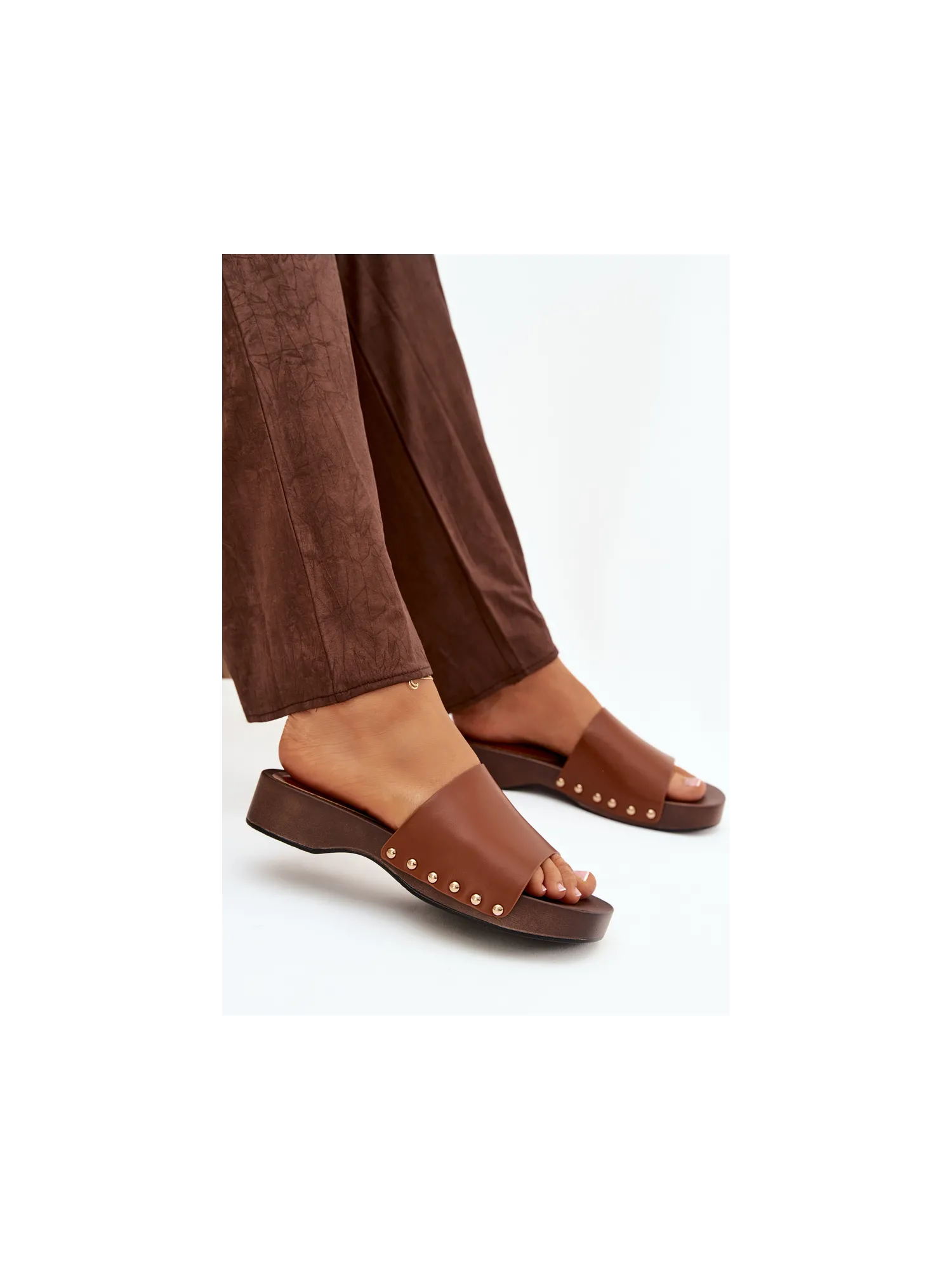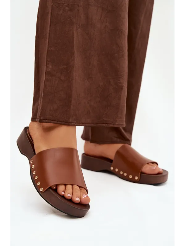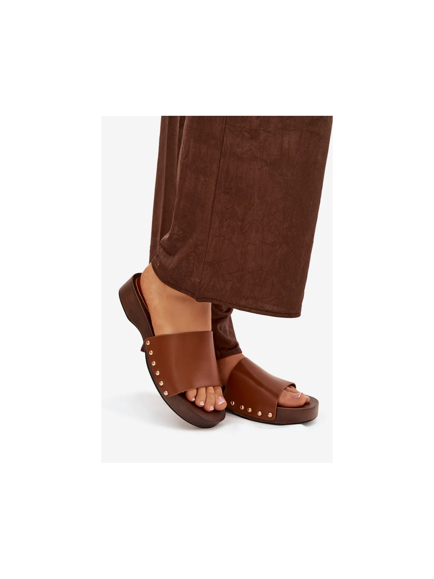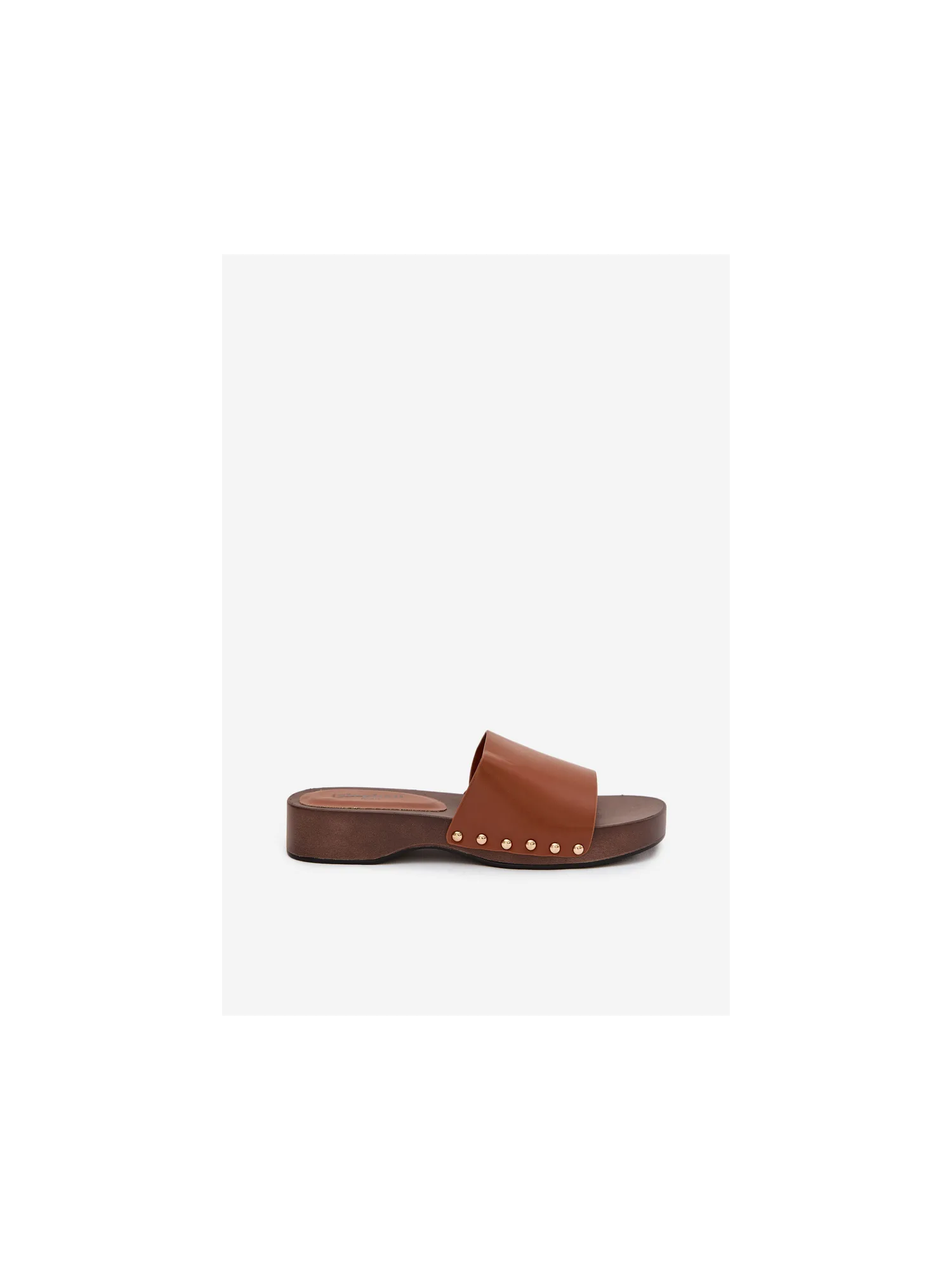 Stylish women's slippers made from eco leather are a comfortable and fashionable option for everyday wear. The delicate platform provides comfort and slightly elevates the silhouette, while ensuring stability while walking. The side gold studs add a subtle accent. The model is perfect for daily stylings – with jeans, dresses, or summer sets. An ideal choice for women who value comfort combined with a trendy detail. When choosing the size, please refer to the size chart. When choosing a size, please refer to the size chart.