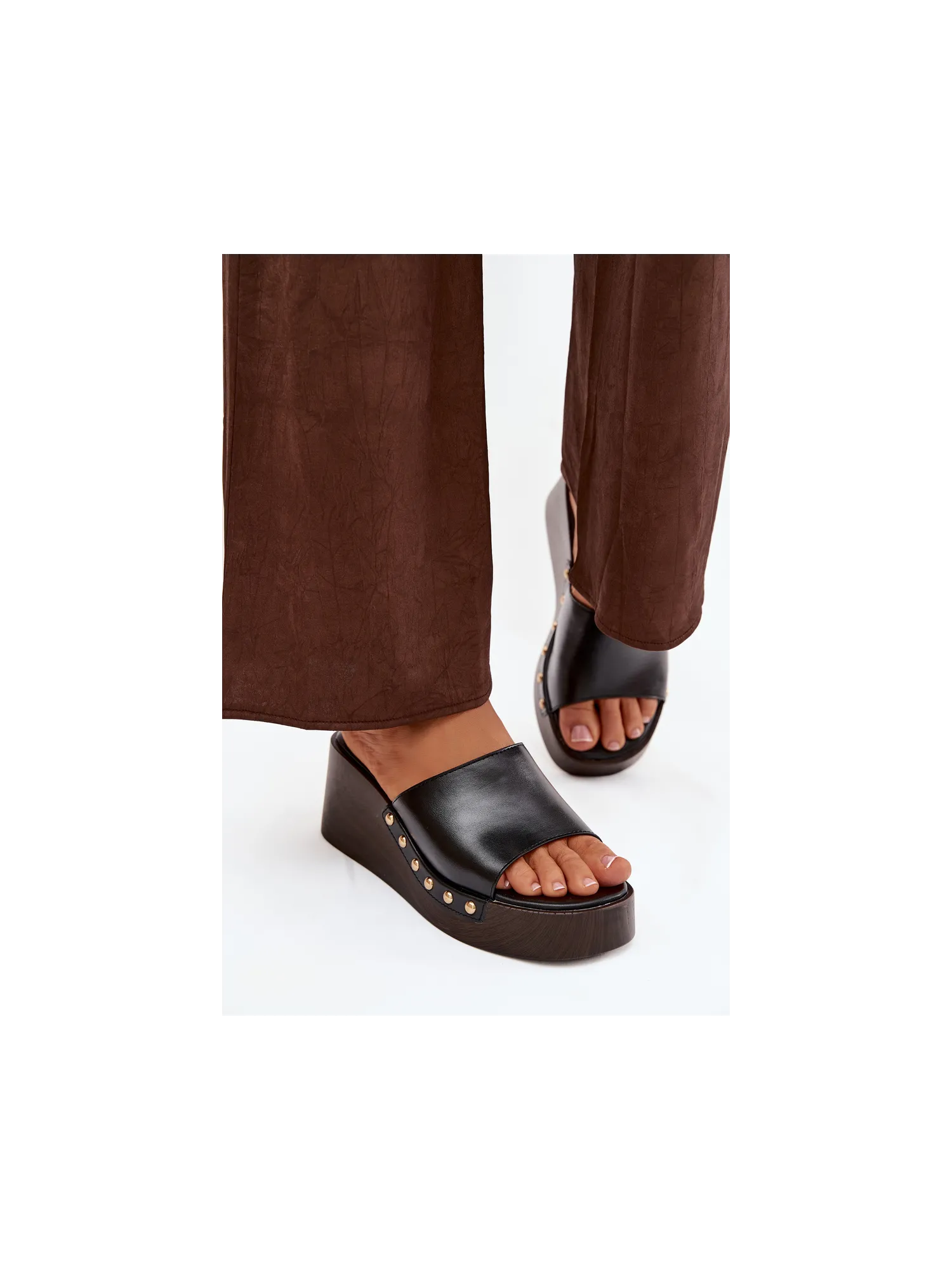 Stylish women's sandals made from eco-leather. The wedge heel provides stability and comfort, while subtly elongating the silhouette. Gold studs placed on the sides create an eye-catching detail. This model is perfect for summer outfits – both with dresses and casual ensembles. An ideal choice for women who value comfort combined with a bold, stylish accent. When choosing a size, please refer to the size chart.