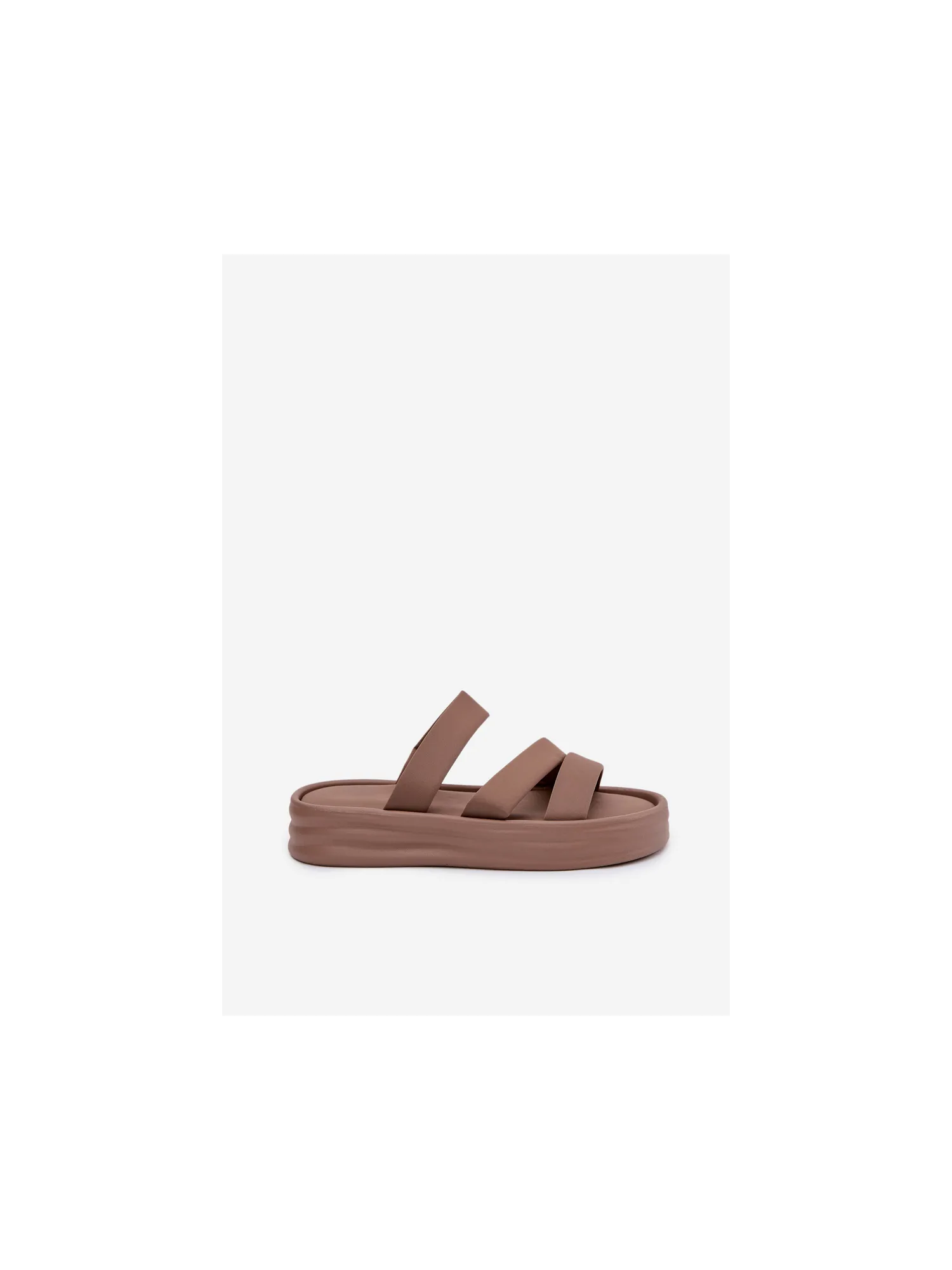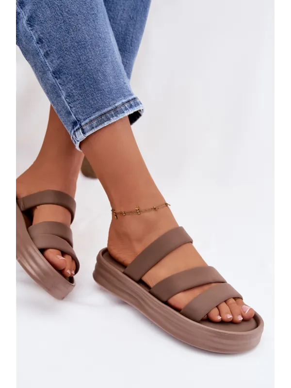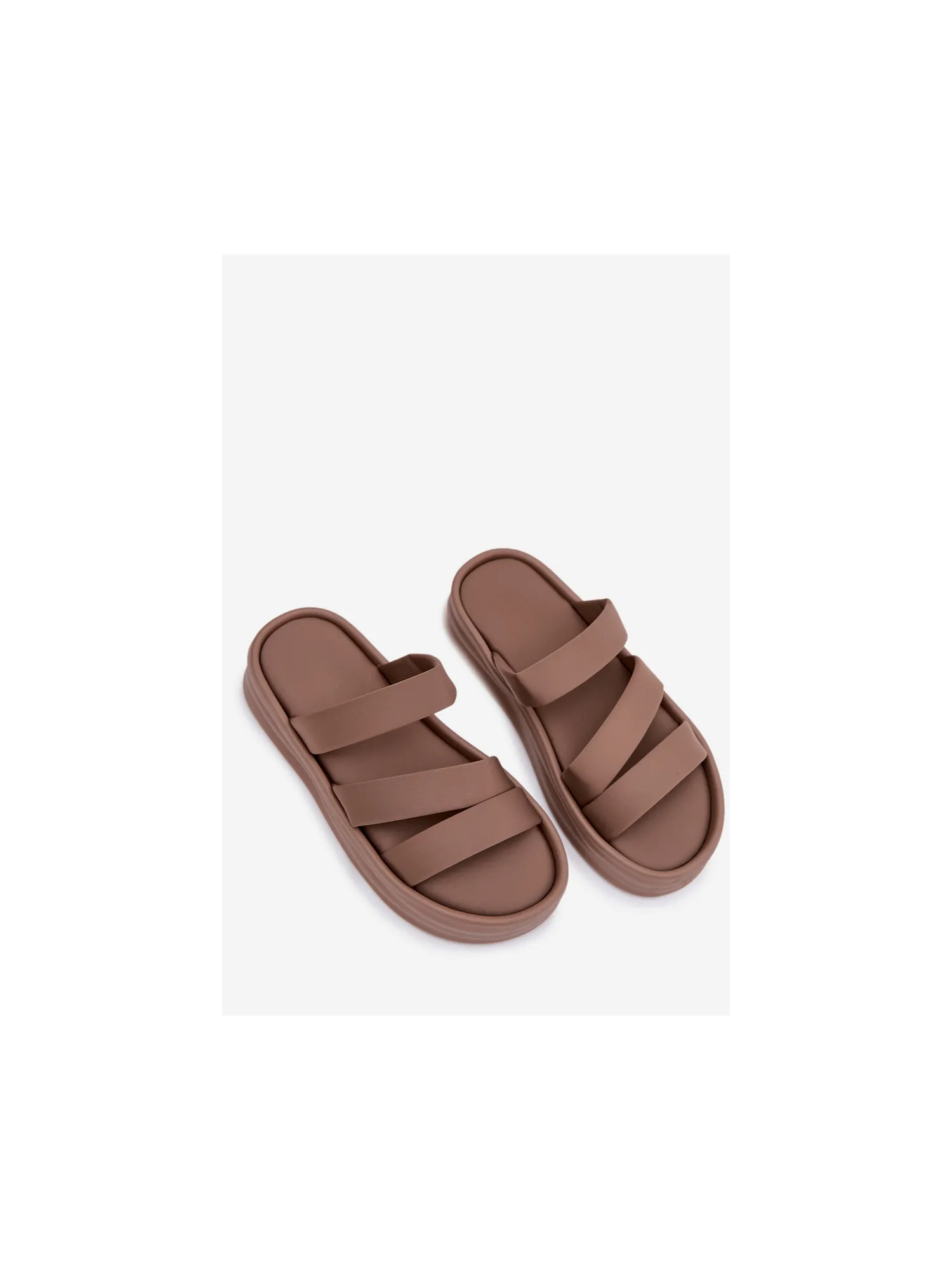 Stylish women's slippers made from textile material are a comfortable and fashionable choice for warm days. Three straps at the front give a modern touch. The soft insole ensures comfort even for extended wear, and the platform subtly elevates the silhouette while maintaining comfort. These slippers are perfect for everyday summer outfits. When choosing a size, please refer to the size chart.