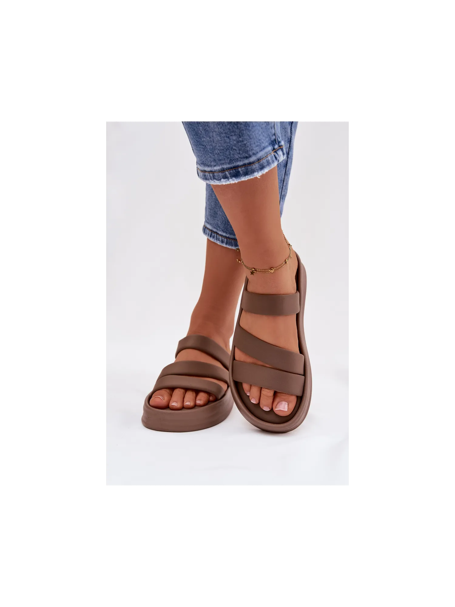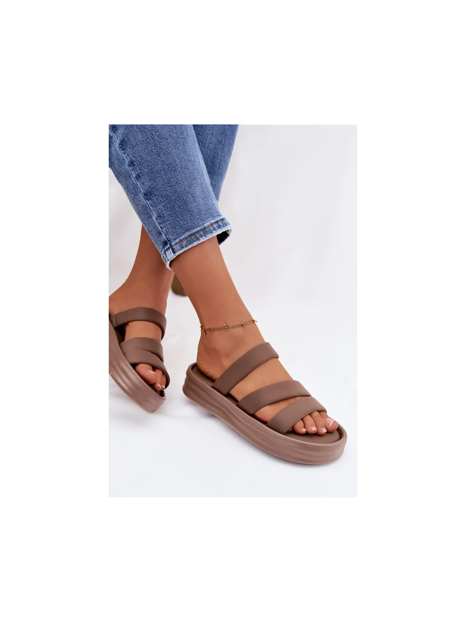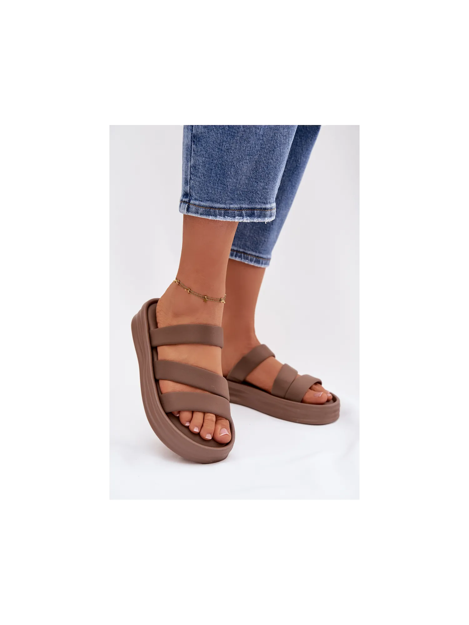 Stylish women's slippers made from textile material are a comfortable and fashionable choice for warm days. Three straps at the front give a modern touch. The soft insole ensures comfort even for extended wear, and the platform subtly elevates the silhouette while maintaining comfort. These slippers are perfect for everyday summer outfits. When choosing a size, please refer to the size chart.