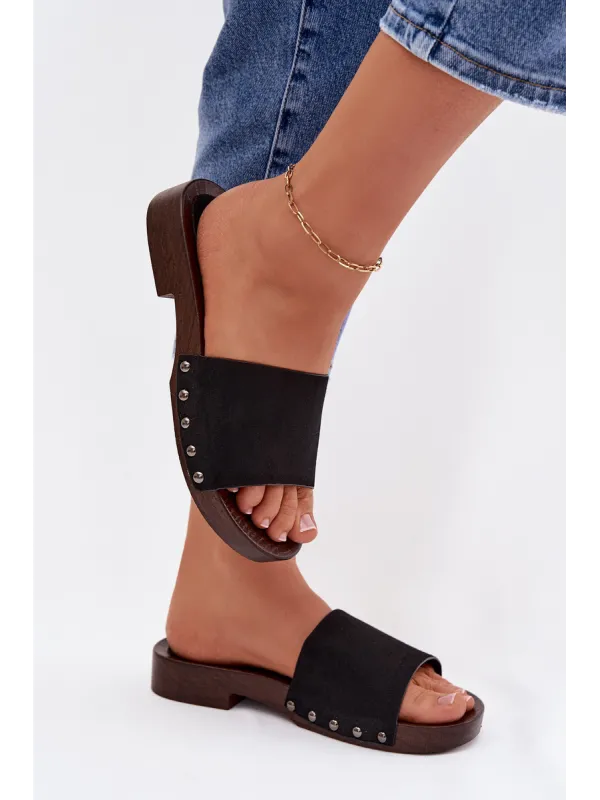Women's Flat Black Studded Slides Amelvessa