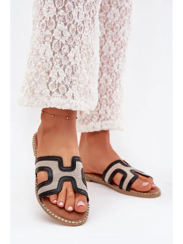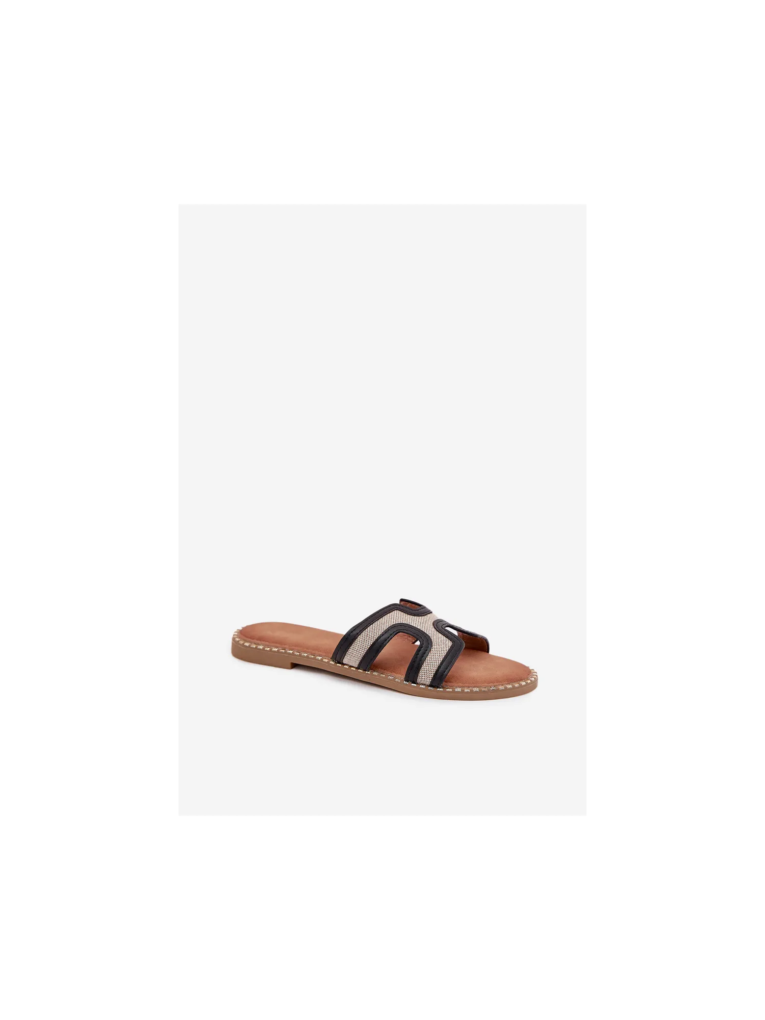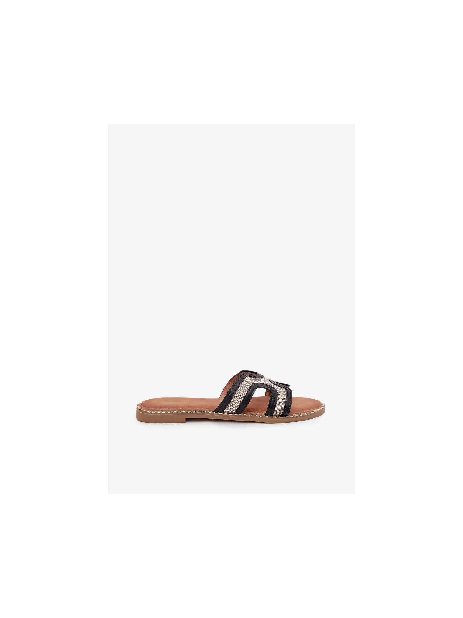 Women's slippers made of a combination of eco-leather and textile material, set on a flat heel, are a comfortable option for everyday wear. There is a golden decoration at the sole that adds a unique character to them. The soft insole provides comfort throughout the day, making the slippers perfect for casual and summer outfits. When choosing a size, please refer to the size chart.