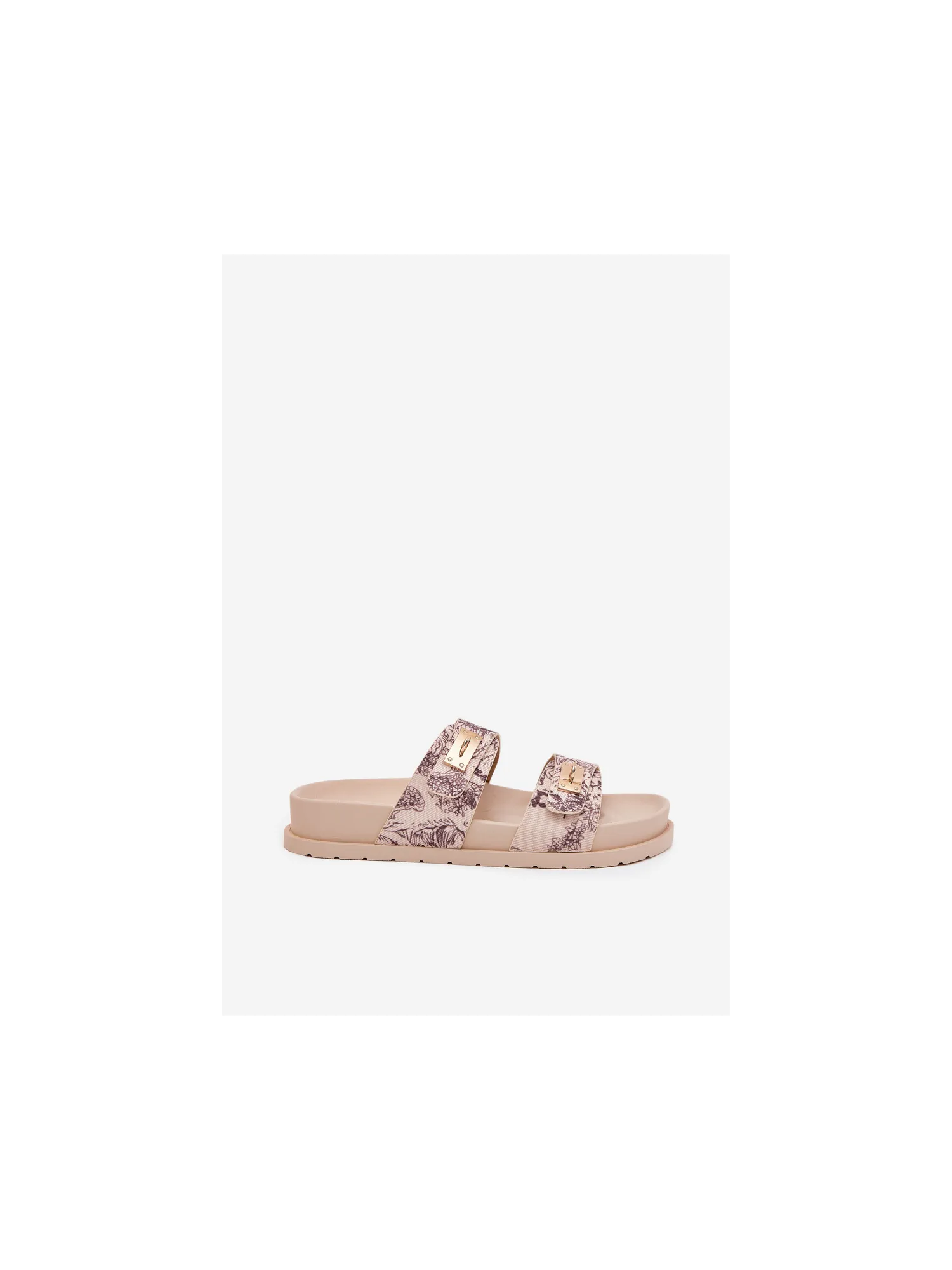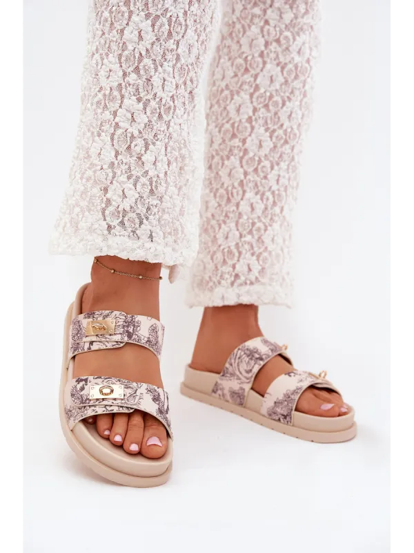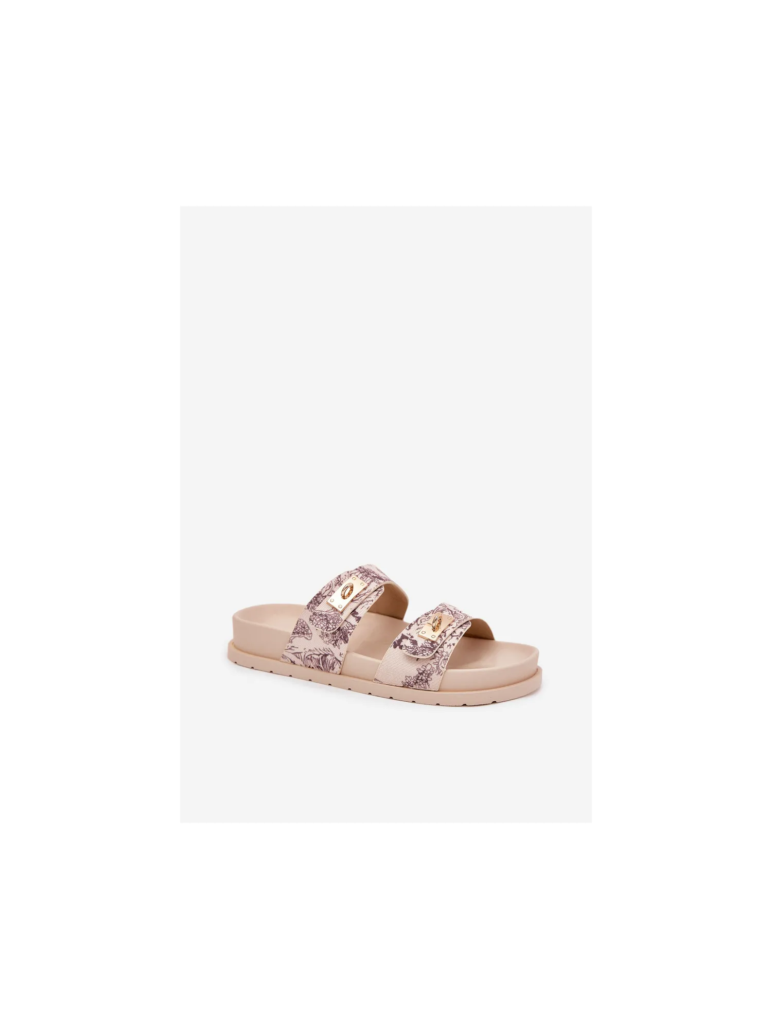 Patterned women's slippers made of textile material, set on a platform, are a stylish option for summer days. The model features two straps decorated with golden elements that add a unique character. Perfect for everyday outfits, they pair well with dresses, skirts, or shorts, providing a fashionable look. When choosing a size, please refer to the size chart.