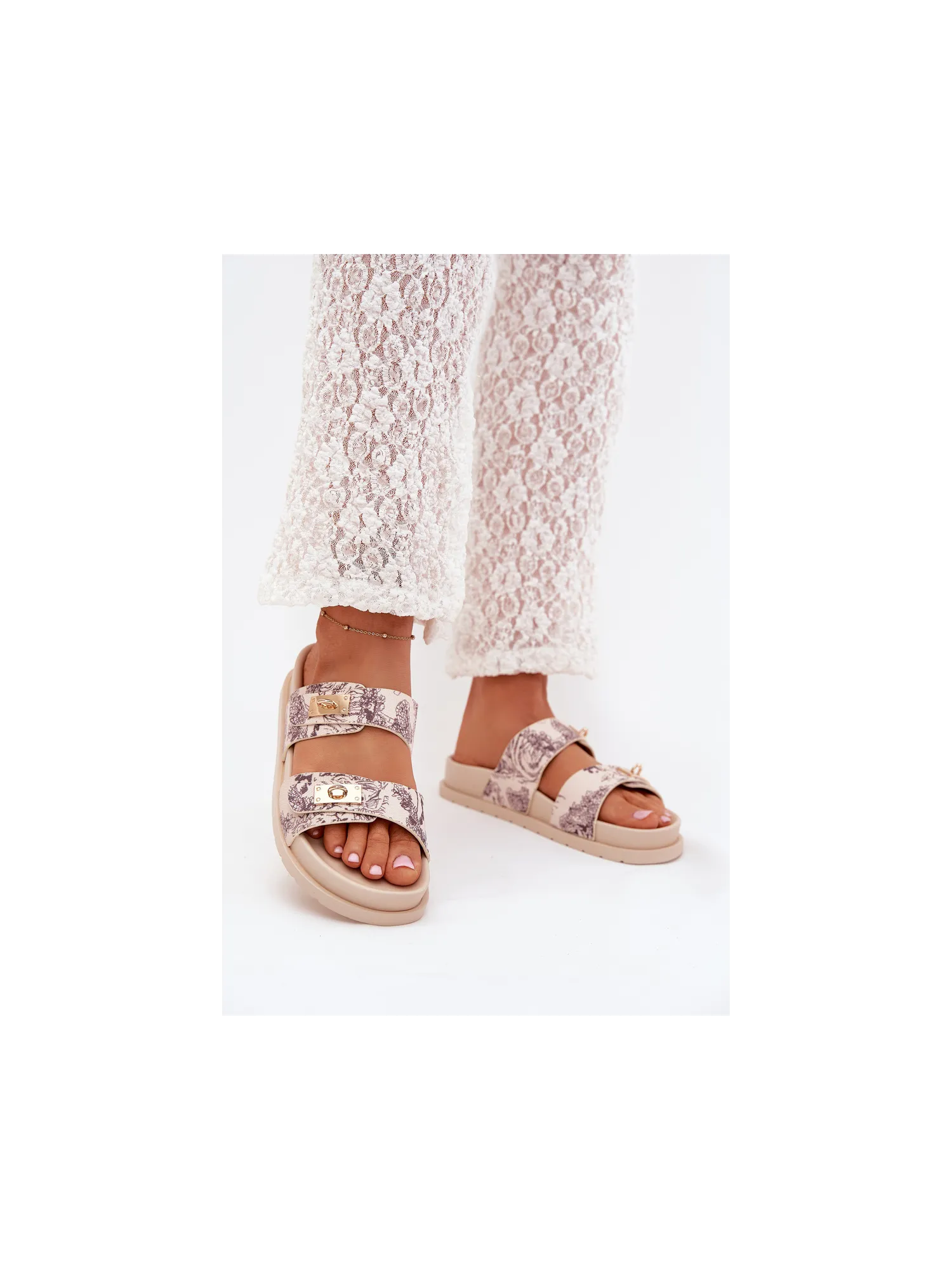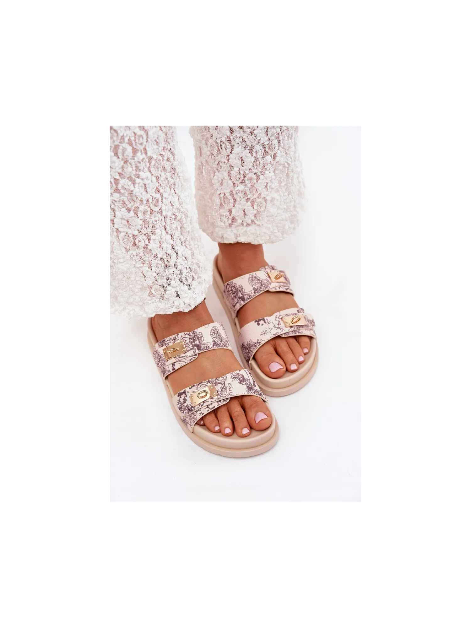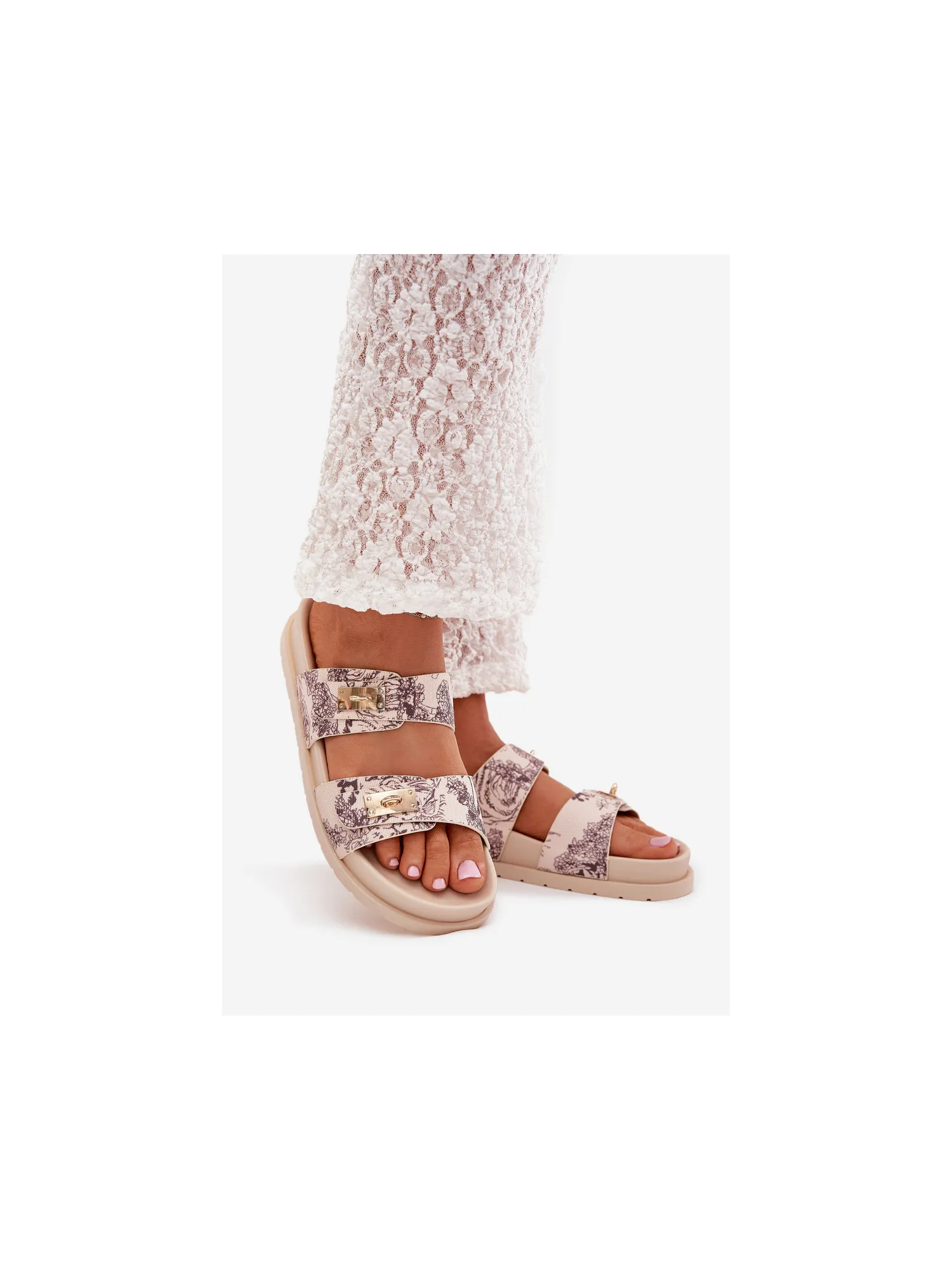 Patterned women's slippers made of textile material, set on a platform, are a stylish option for summer days. The model features two straps decorated with golden elements that add a unique character. Perfect for everyday outfits, they pair well with dresses, skirts, or shorts, providing a fashionable look. When choosing a size, please refer to the size chart.