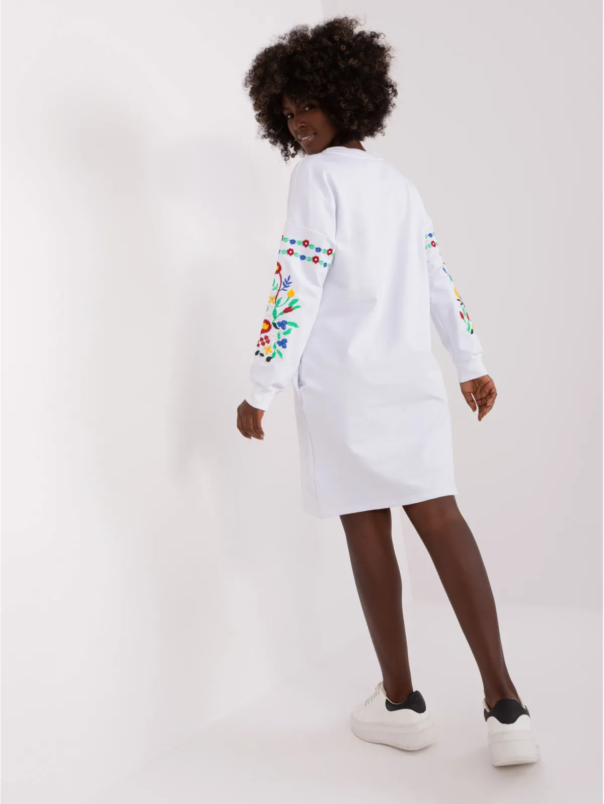 Suknelės S/M dydžio išmatavimai: krūtinė - 56 cm, rankovių ilgis - 62 cm, bendras ilgis - 90 cm.