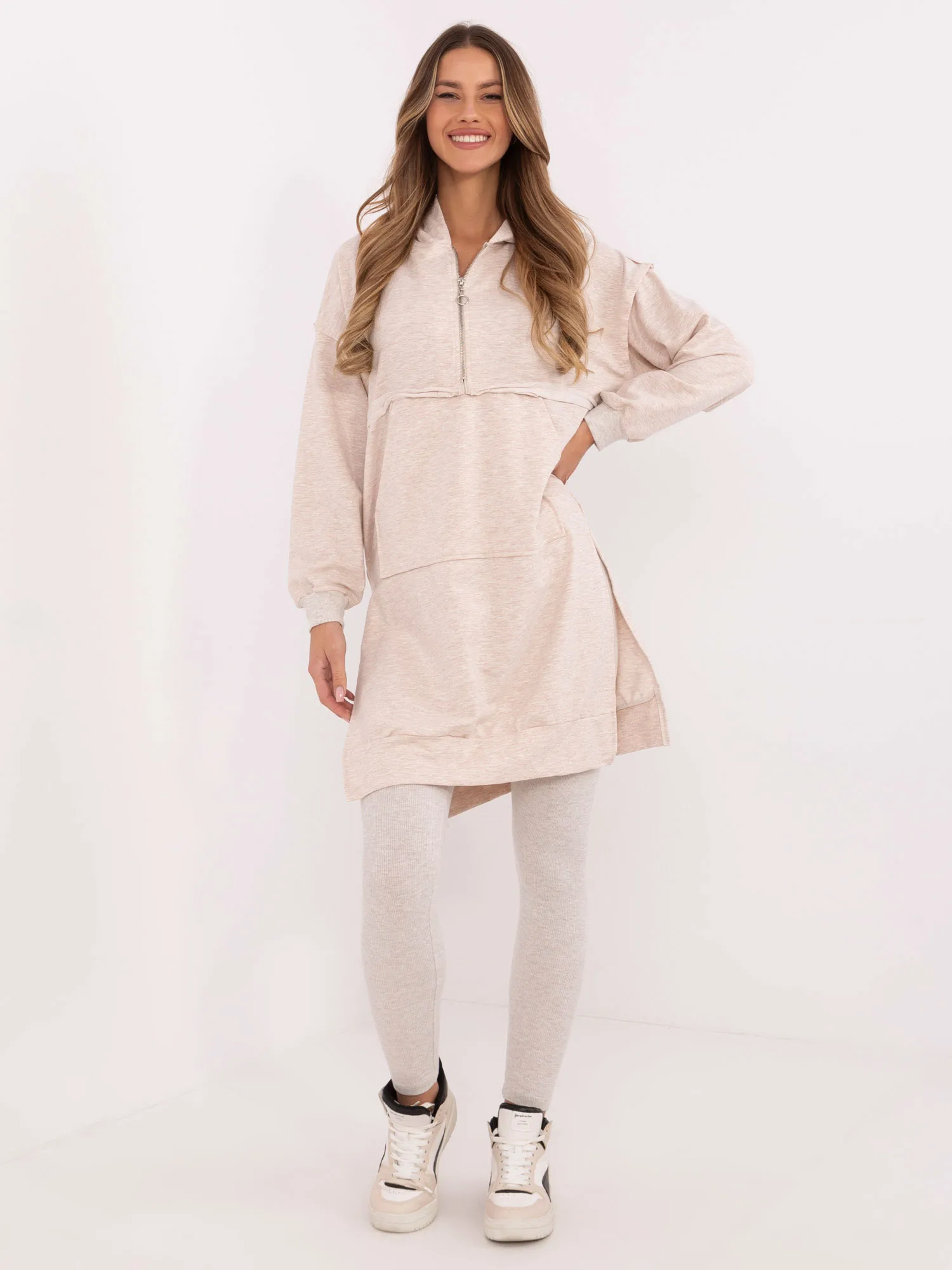 Modelis dėvi vieno dydžio dydį. Modelio išmatavimai: ūgis 176 cm, krūtinė 90 cm, juosmuo 62 cm, klubai 94 cm.