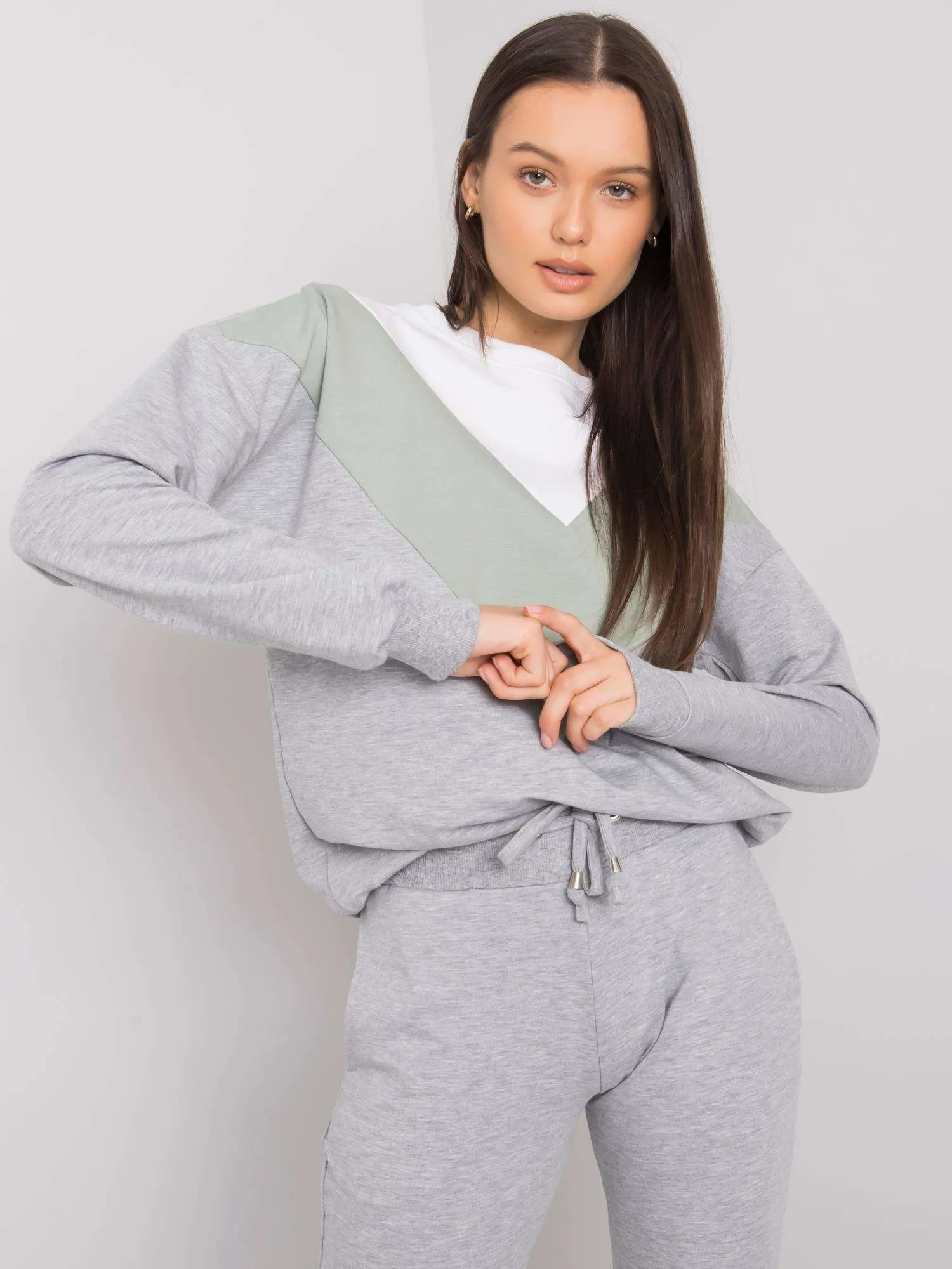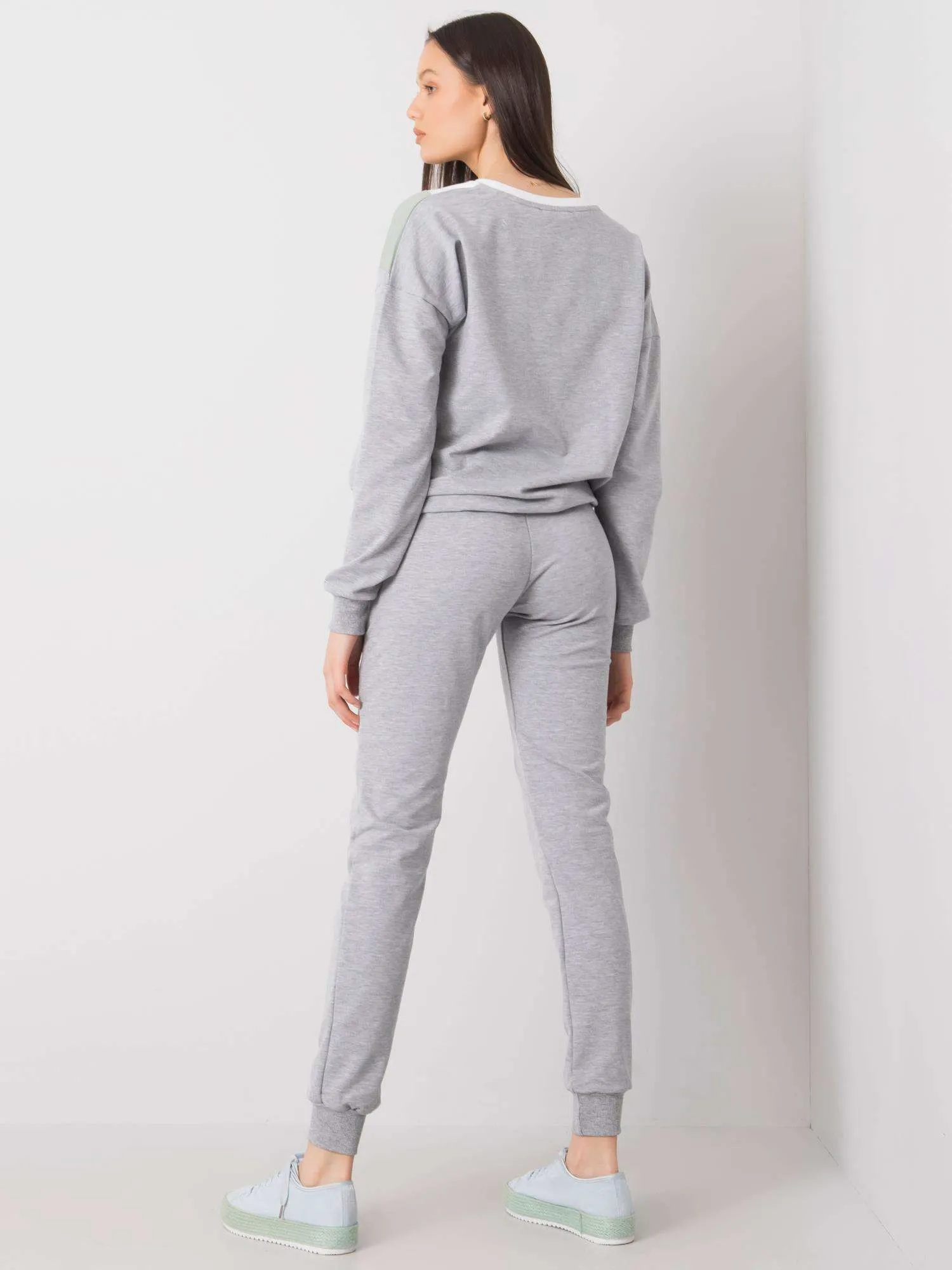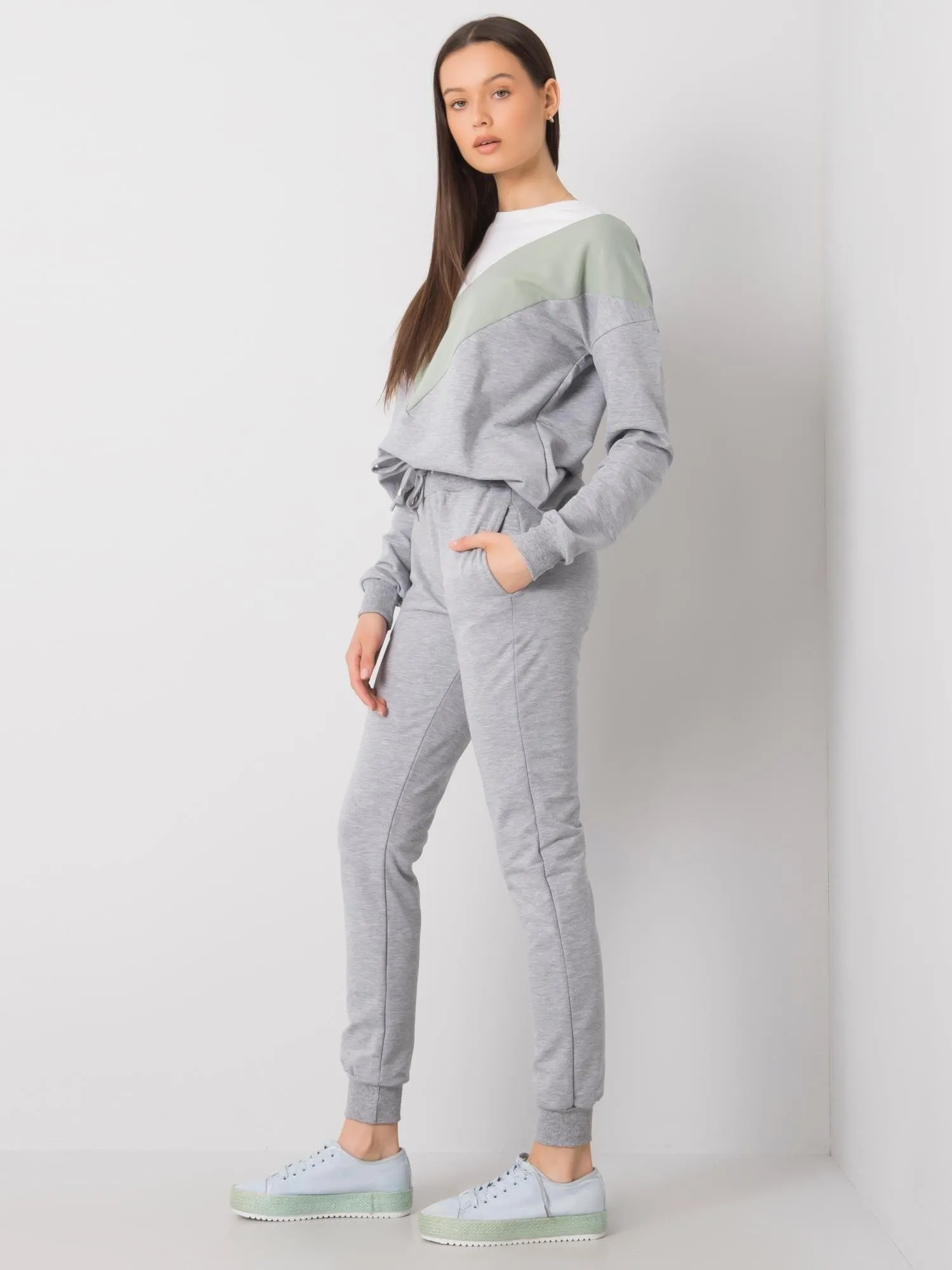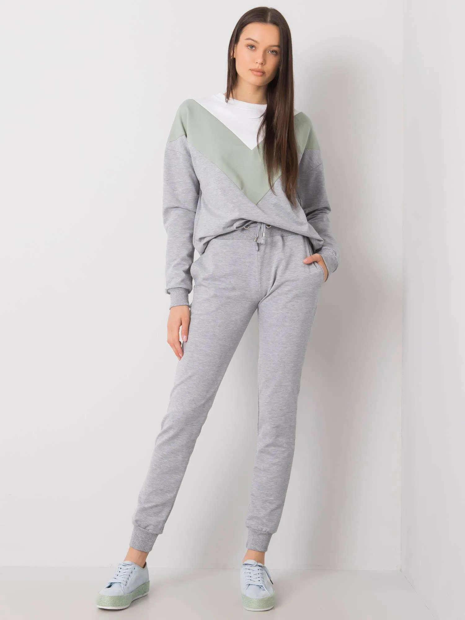 IŠPSzaro-pistacjowy damski komplet dwuczęściowy.