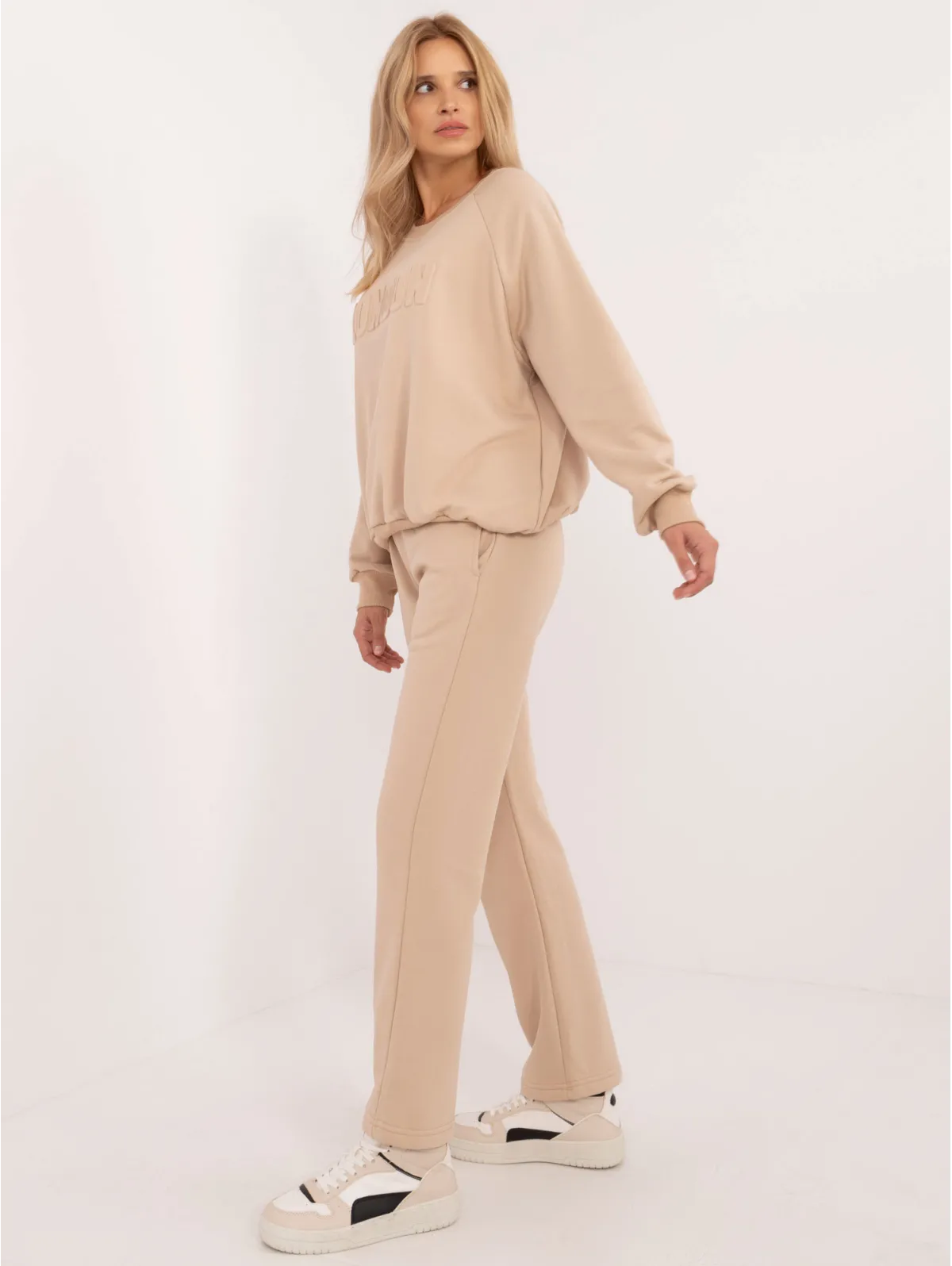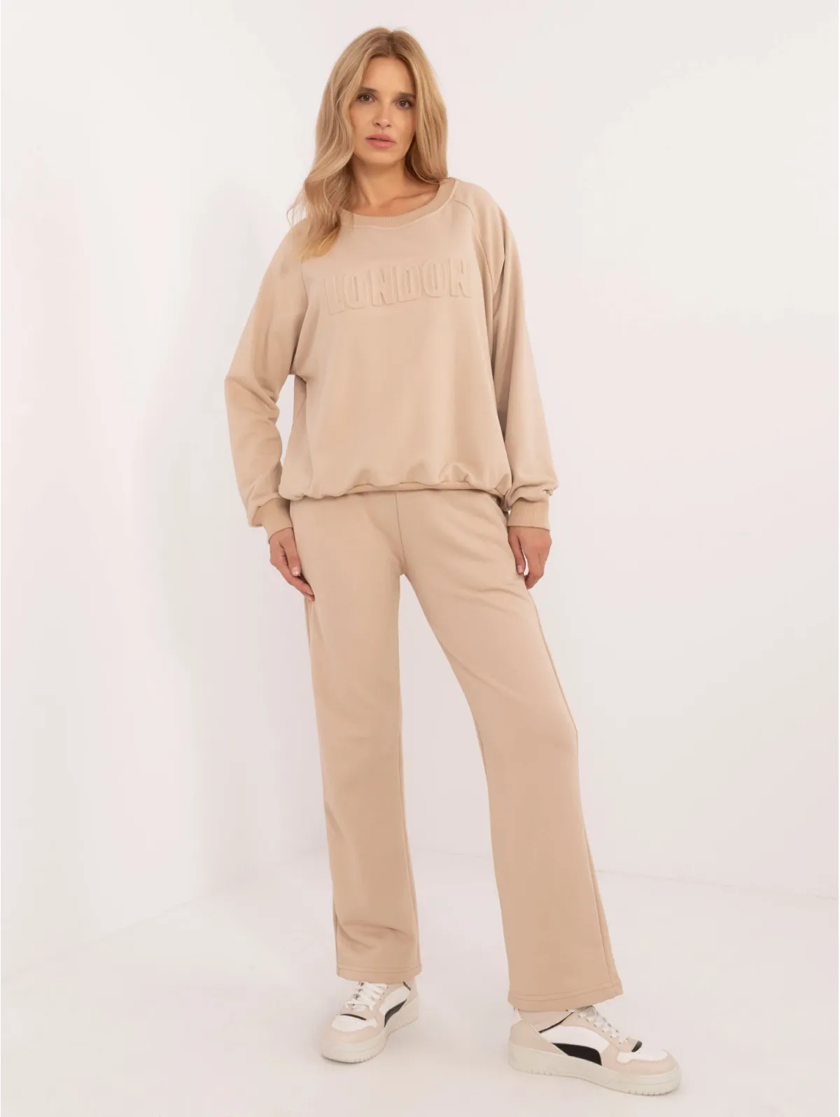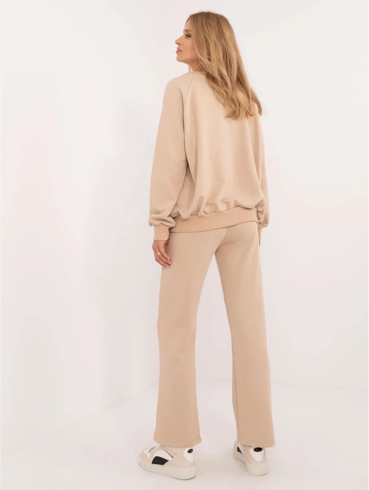 Vieno dydžio komplekto matmenys, matuojamas plokščias: megztinio plotis po pažastimis - 68 cm, megztinio ilgis - 67 cm, rankovių ilgis - 64 cm, kelnių plotis juosmens - 33 cm, juosmens aukštis - 34 cm. , kelnių ilgis - 105 cm.