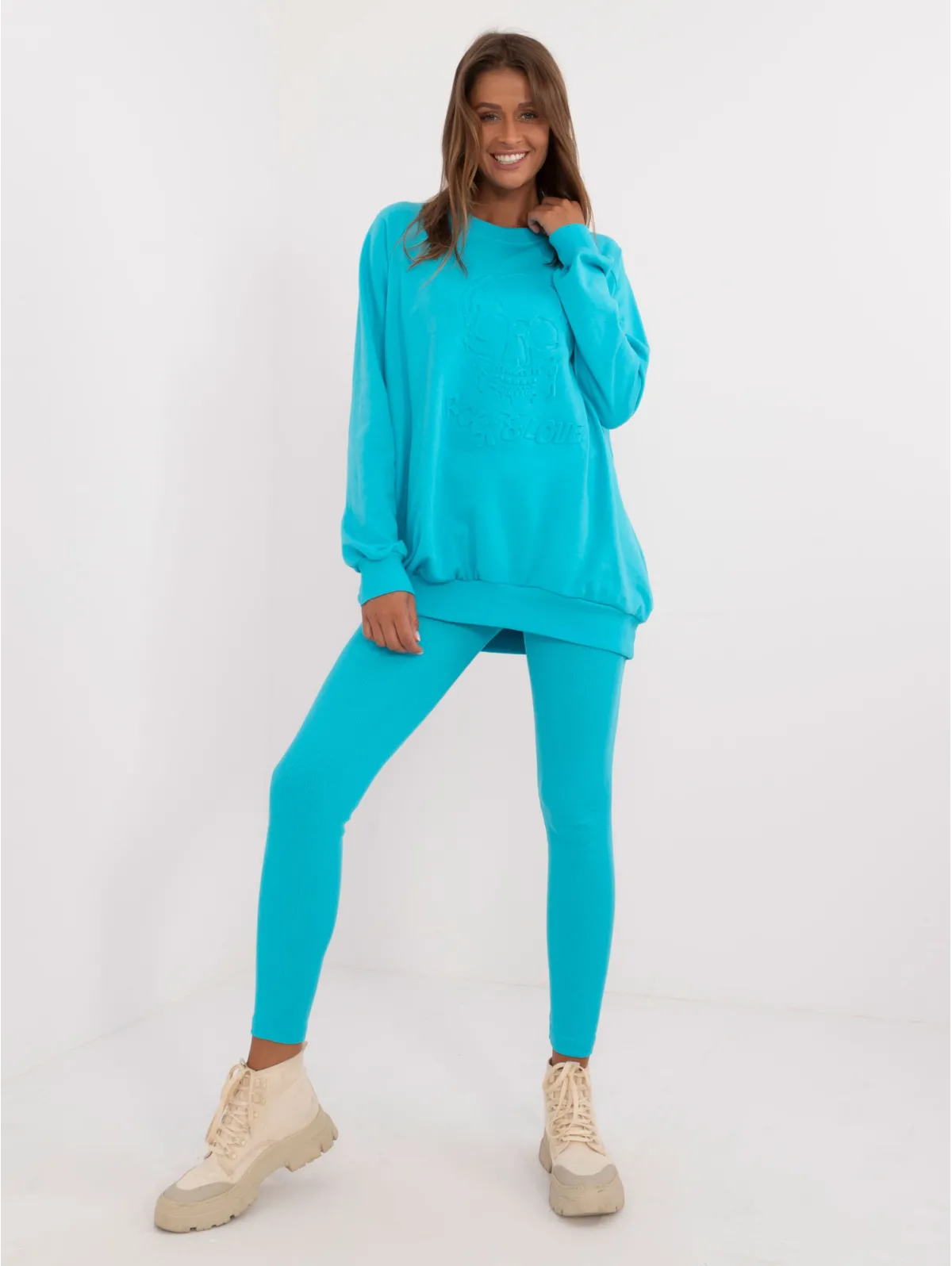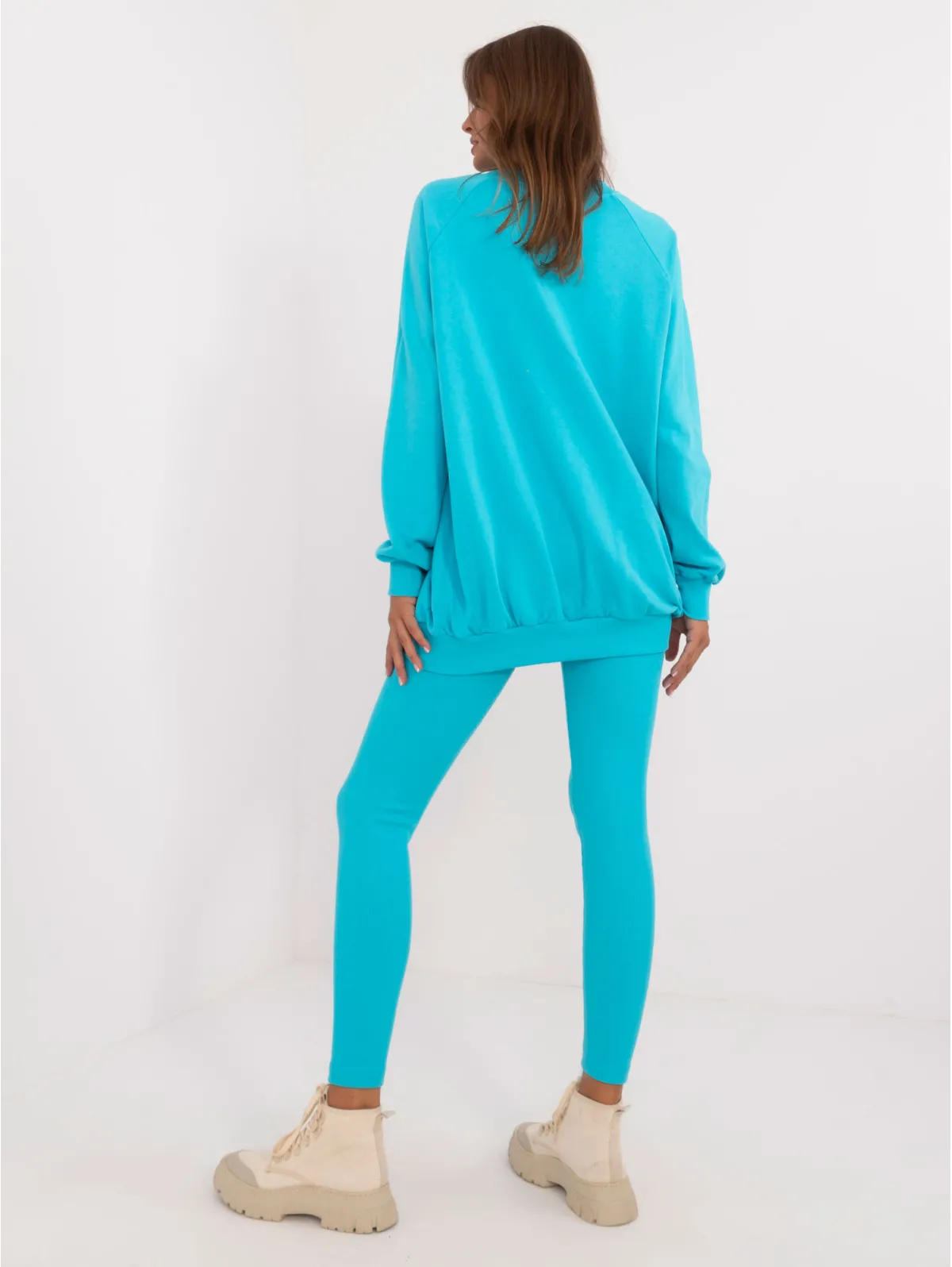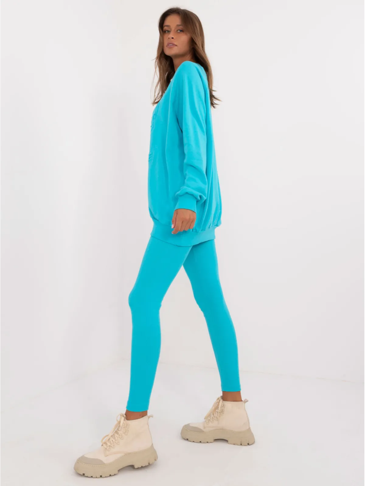 Vieno dydžio komplekto matmenys, matuojami plokščiai: megztinio plotis po pažastimis - 70 cm, megztinio ilgis - 74 cm, rankovių ilgis - 64 cm, antblauzdžių plotis ties juosmeniu - 30 cm, juosmens aukštis - 28 cm, antblauzdžių ilgis - 98 cm.