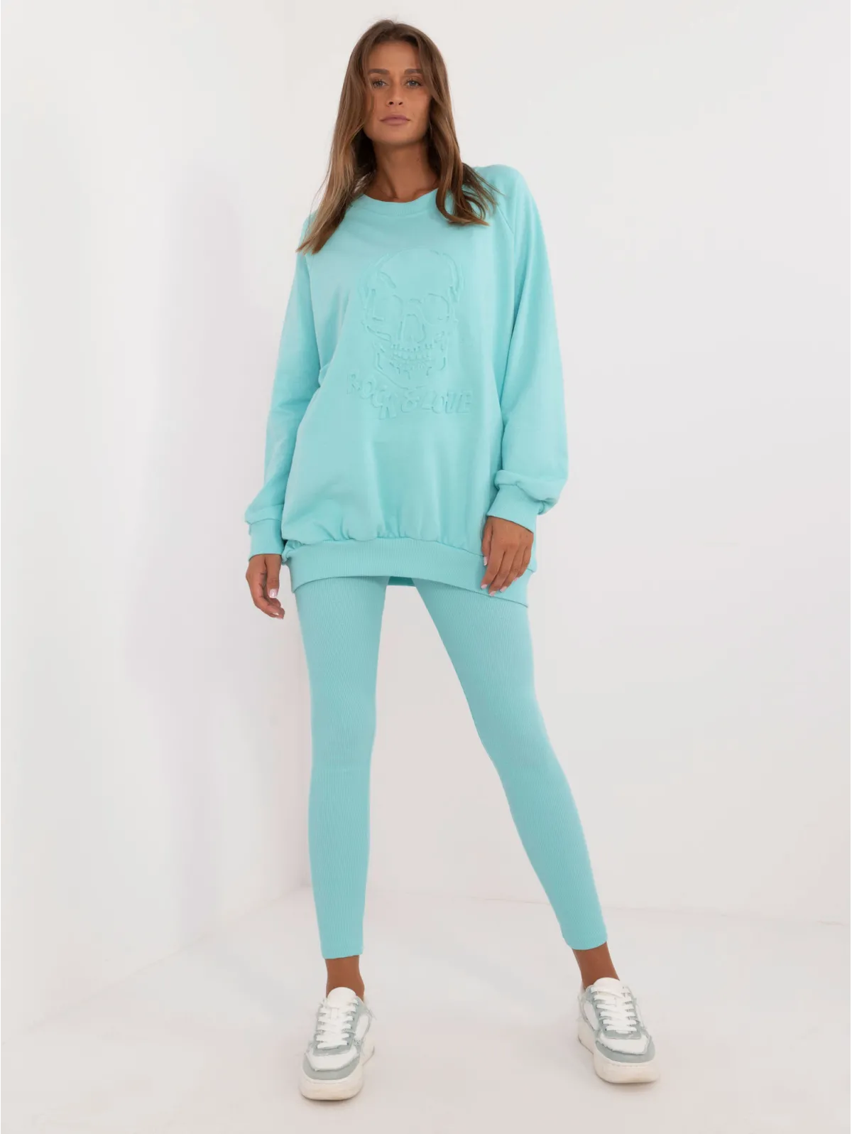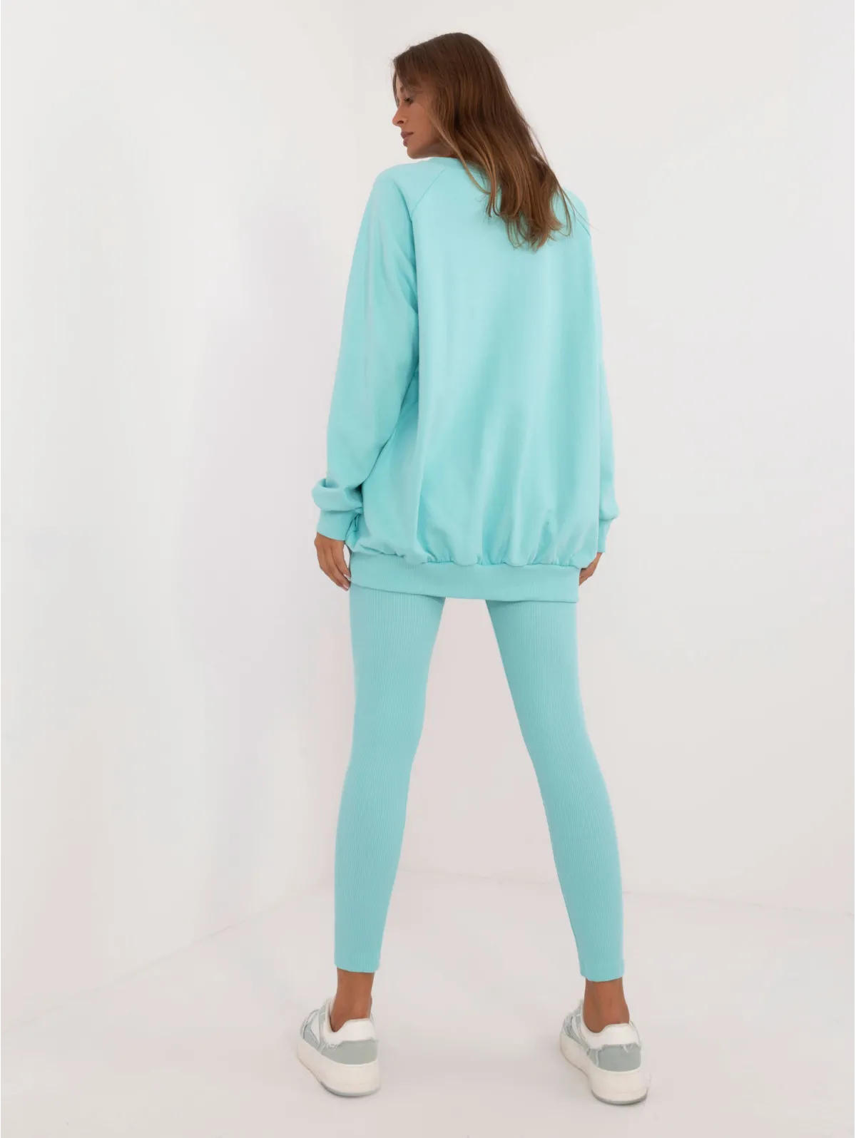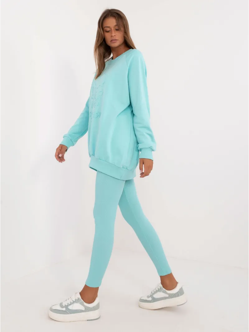 Vieno dydžio komplekto matmenys, matuojami plokščiai: megztinio plotis po pažastimis - 70 cm, megztinio ilgis - 74 cm, rankovių ilgis - 64 cm, antblauzdžių plotis ties juosmeniu - 30 cm, juosmens aukštis - 28 cm, antblauzdžių ilgis - 98 cm.