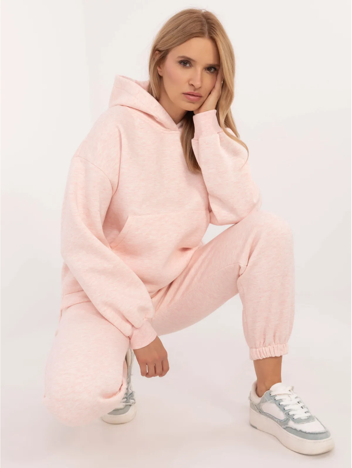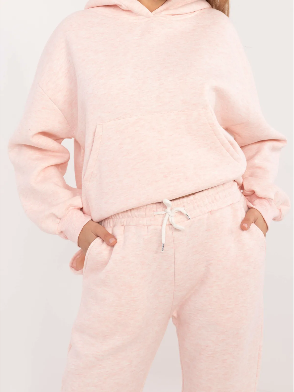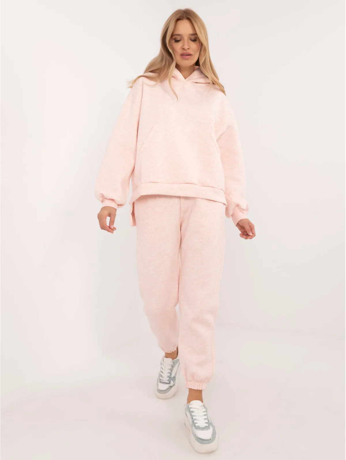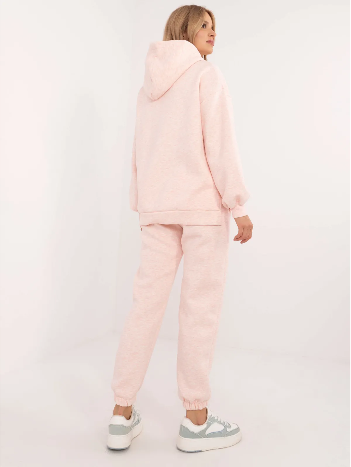 Vieno dydžio komplekto matmenys, matuojami plokščiai: megztinio plotis po pažastimis - 65 cm, megztinio ilgis - 74 cm, rankovių ilgis - 64 cm, kelnių plotis ties juosmeniu - 34 cm, ilgis. kelnės - 94 cm.