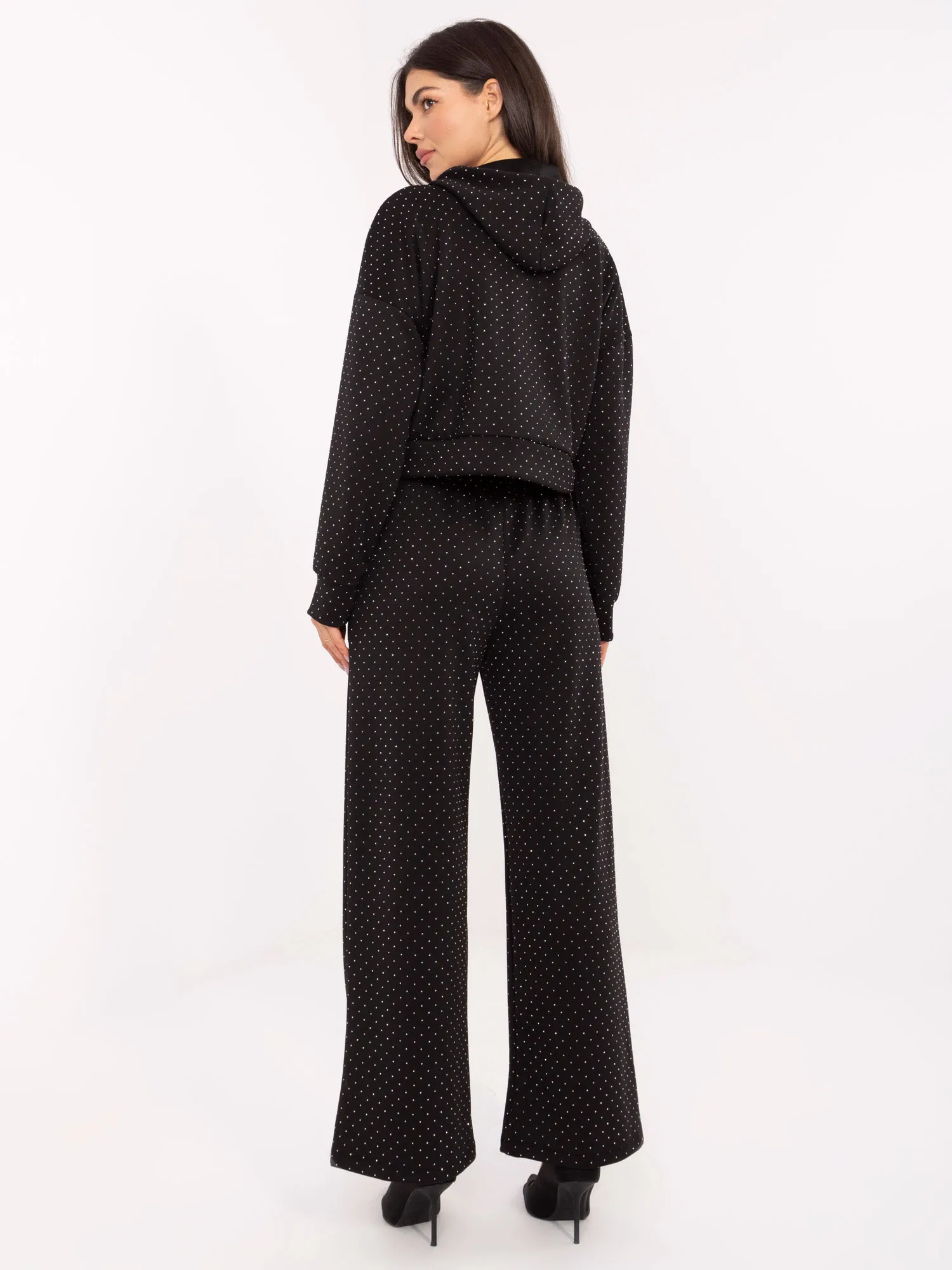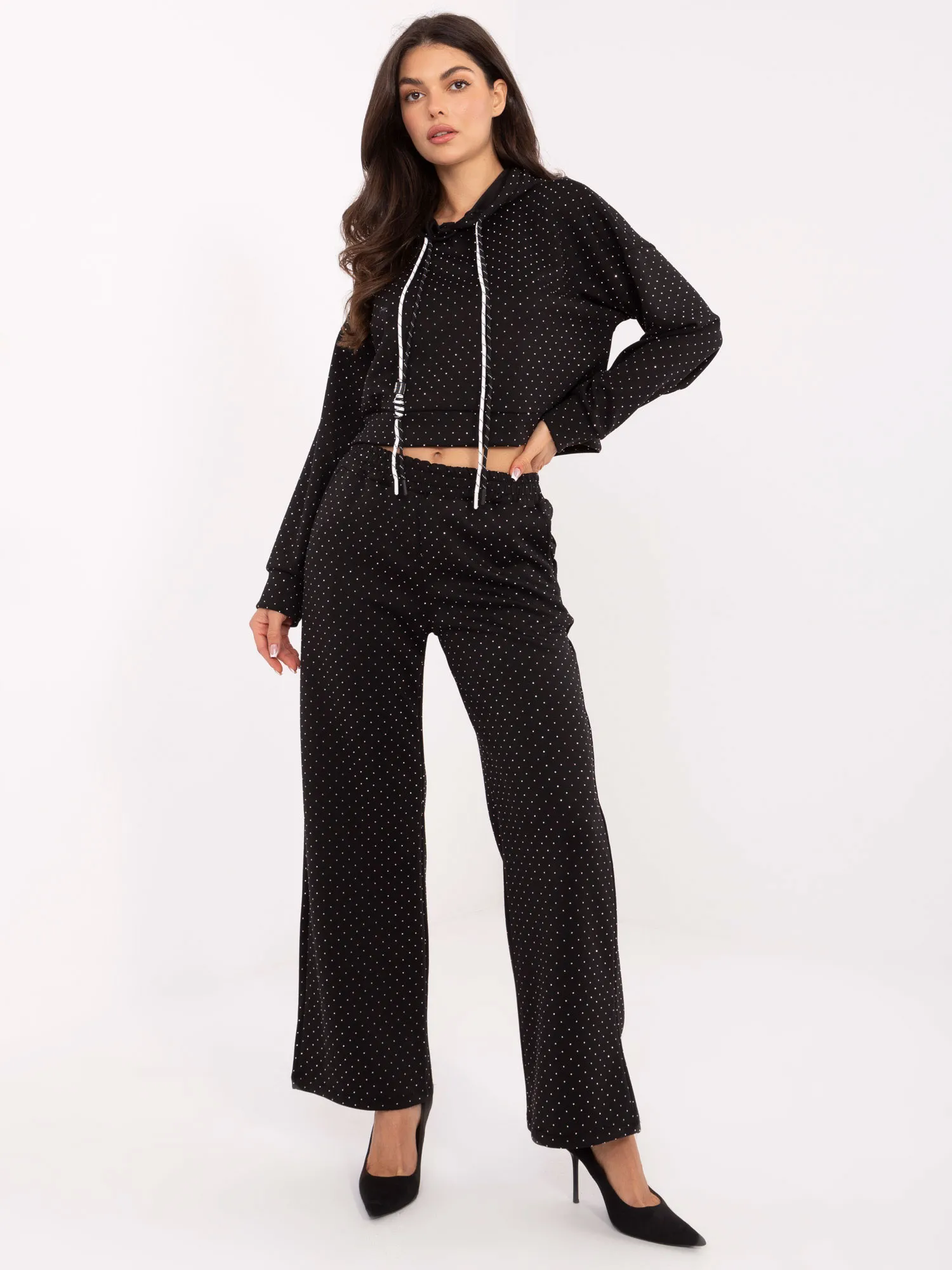 Komplekto matmenys vieno dydžio: plotis po pažastimis - 60 cm, megztinio ilgis - 46 cm, rankovių ilgis - 49 cm (nuo siūlės), klubų plotis - 53 cm, kelnių plotis ties juosmeniu - 34 cm (ištiestų), kelnių plotis ties juosmeniu - 76 cm (po tempimo), klubų plotis - 52 cm, kelnių ilgis - 100 cm.