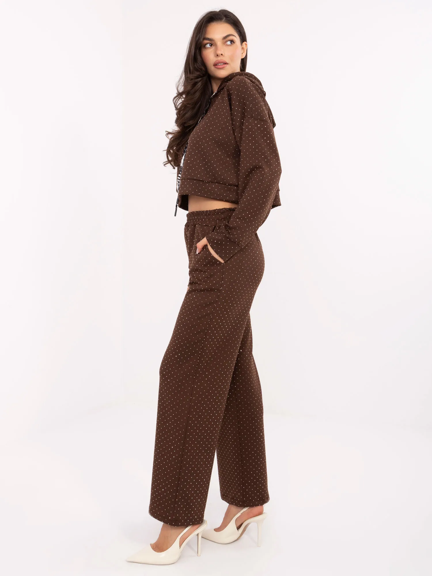 Komplekto matmenys vieno dydžio: plotis po pažastimis - 60 cm, megztinio ilgis - 46 cm, rankovių ilgis - 49 cm (nuo siūlės), klubų plotis - 53 cm, kelnių plotis ties juosmeniu - 34 cm (ištiestų), kelnių plotis ties juosmeniu - 76 cm (po tempimo), klubų plotis - 52 cm, kelnių ilgis - 100 cm.