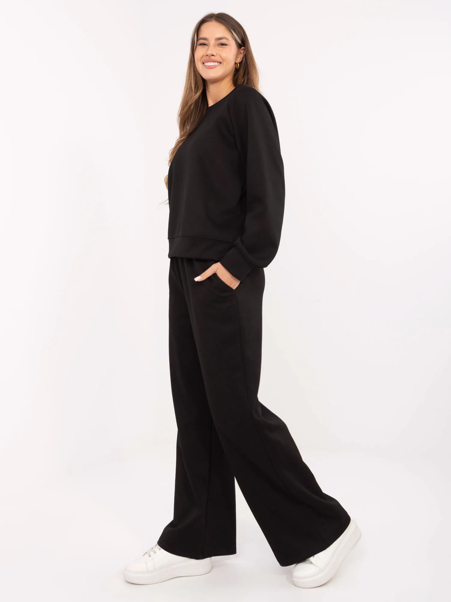 Komplekto matmenys vieno dydžio: plotis po pažastimis - 62 cm, megztinio ilgis - 62 cm, rankovių ilgis - 71 cm (nuo siūlės), klubų plotis - 55 cm, kelnių plotis ties juosmeniu - 35 cm (ištiestų), kelnių plotis ties juosmeniu - 61 cm (po tempimo), klubų plotis - 57 cm, kelnių ilgis - 106 cm.
